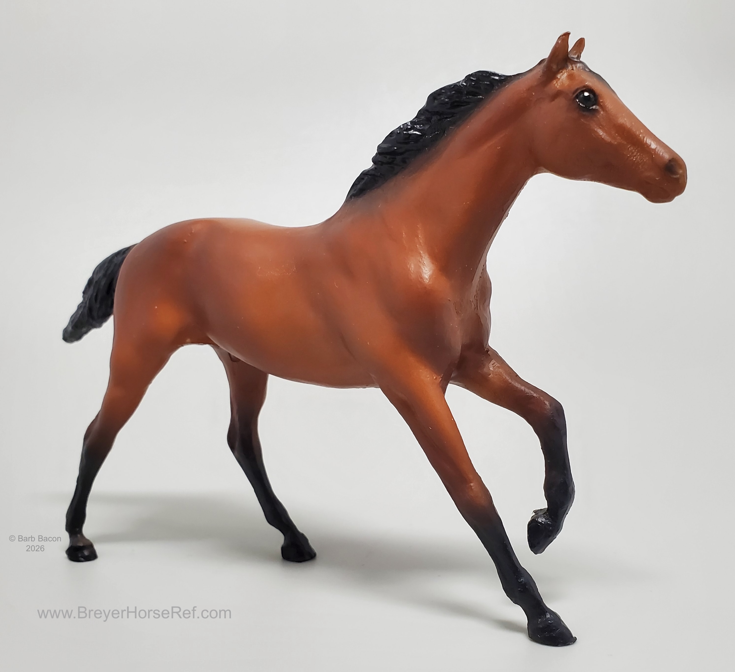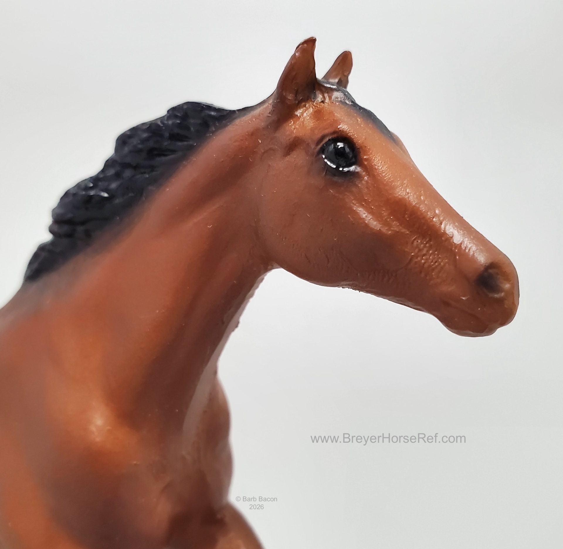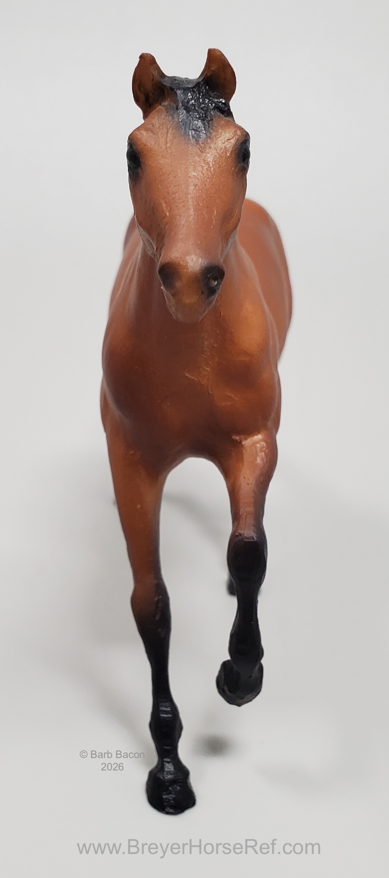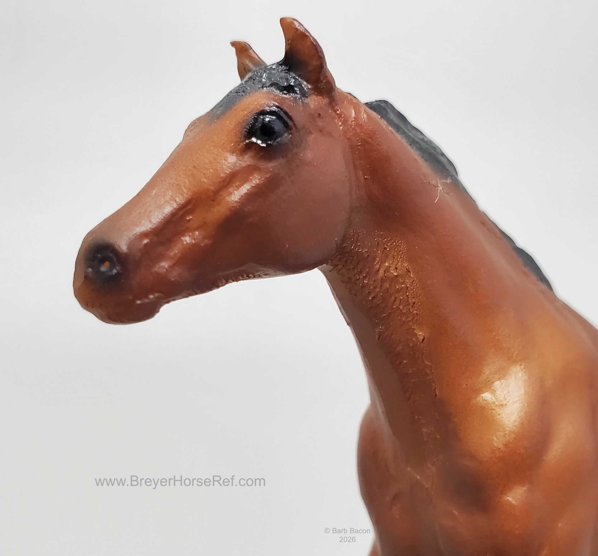 Bay with black points and a solid face. This model tends to be a medium/dark bay with no nose shading as compared with the #1017 Topside and Stevie set. Available as a single model #9010 from 1984-1988, in Bay, Chestnut and Black.