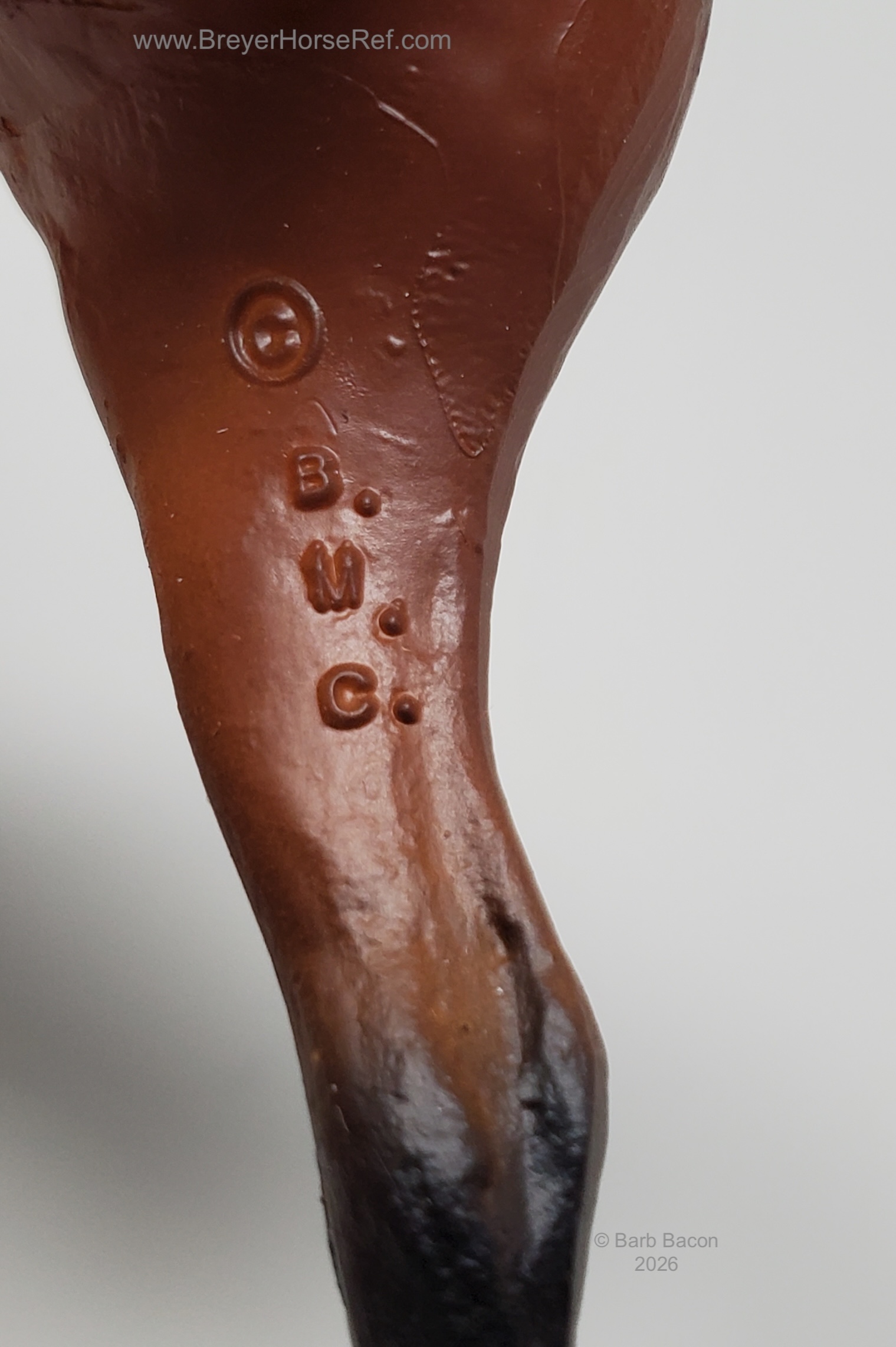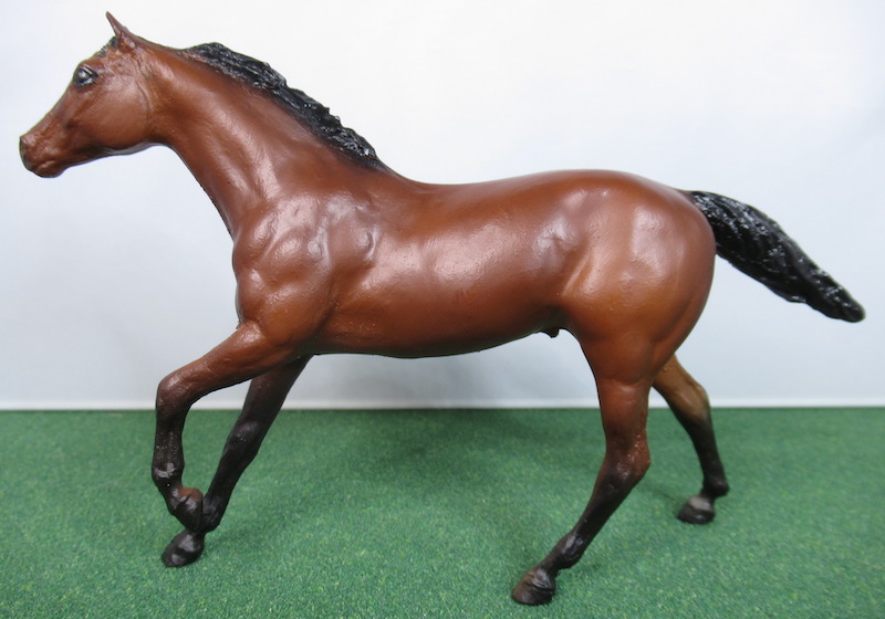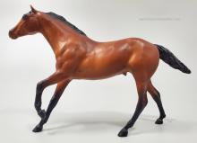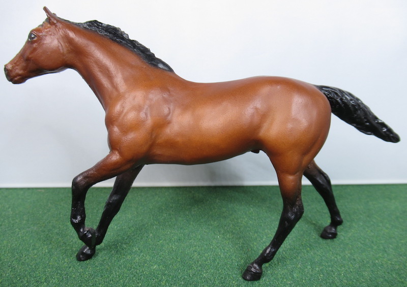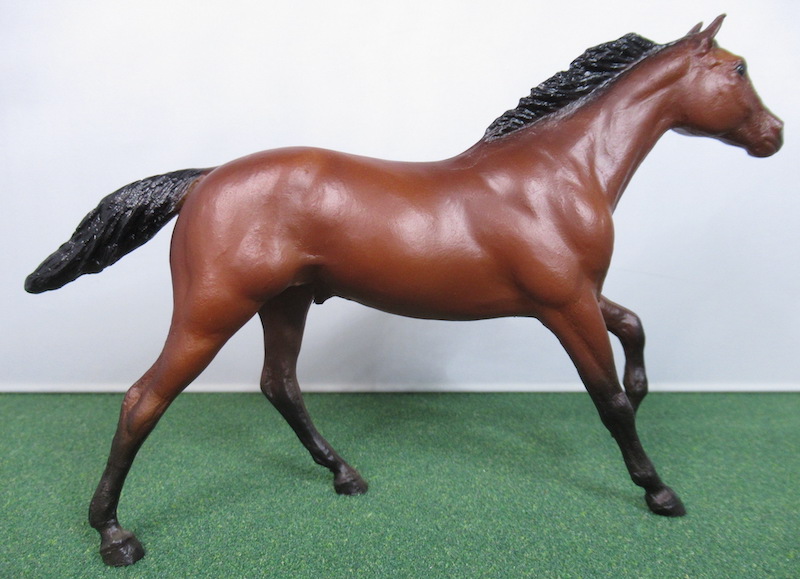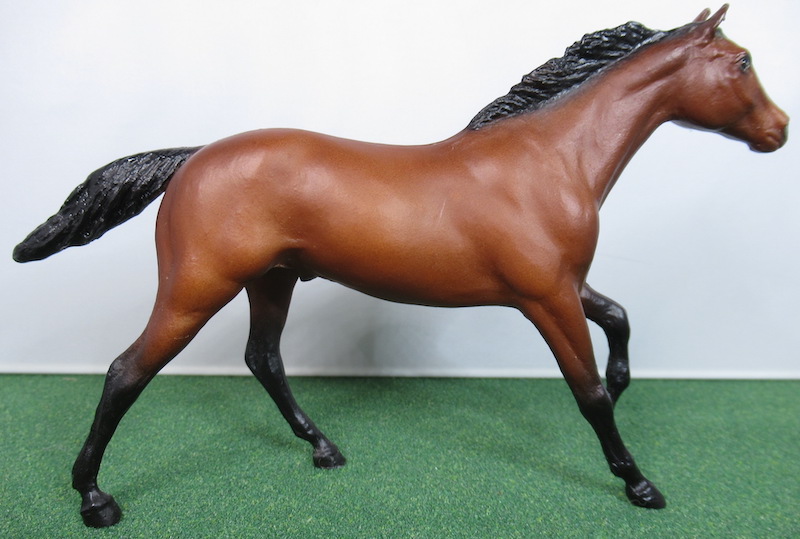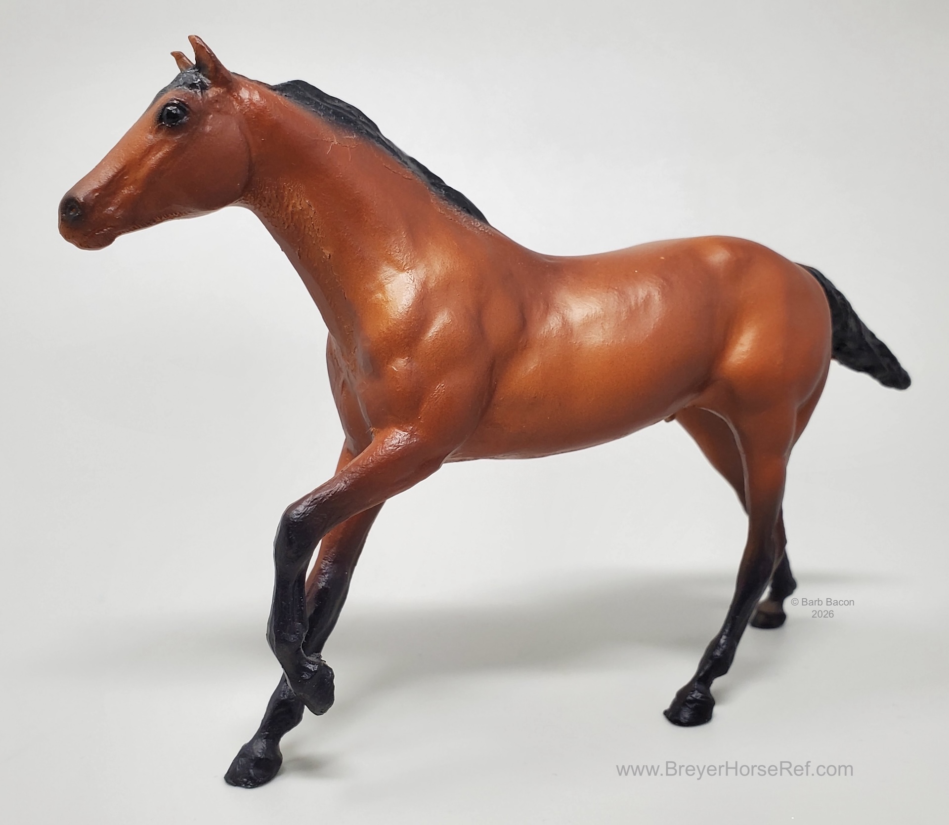 Bay with black points and a solid face. This model tends to be a medium/dark bay with no nose shading as compared with the #1017 Topside and Stevie set. Available as a single model #9010 from 1984-1988, in Bay, Chestnut and Black.