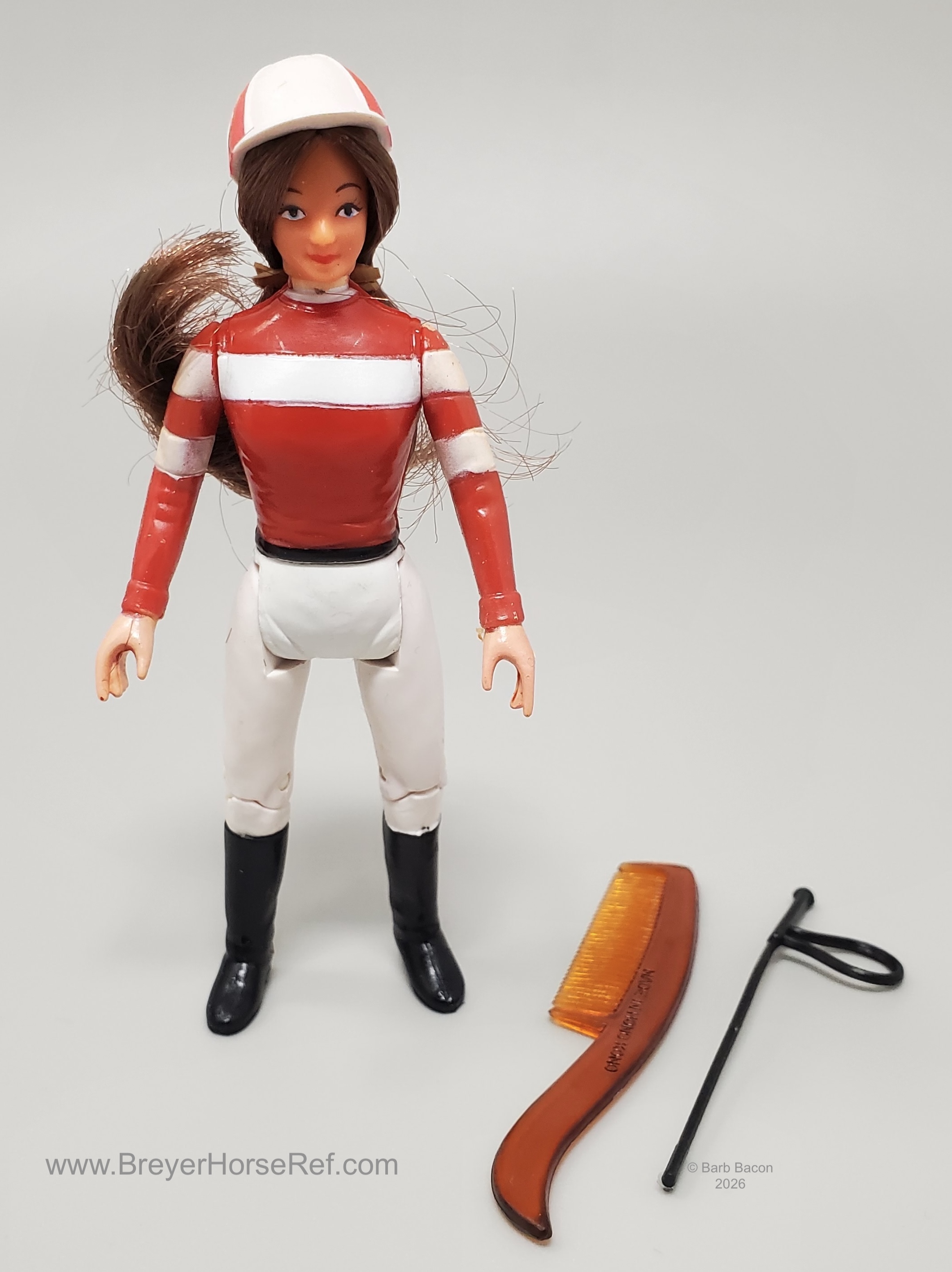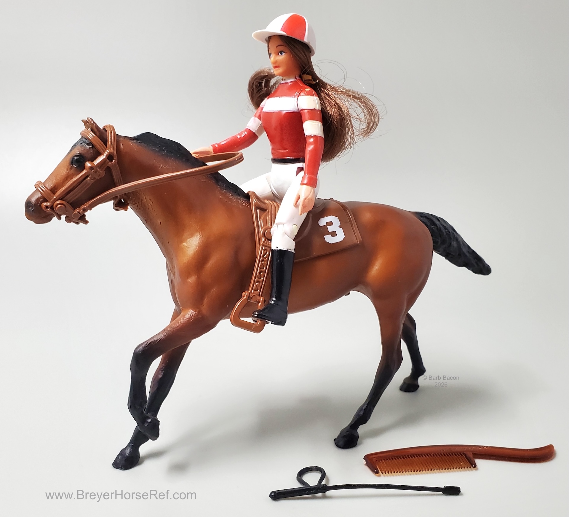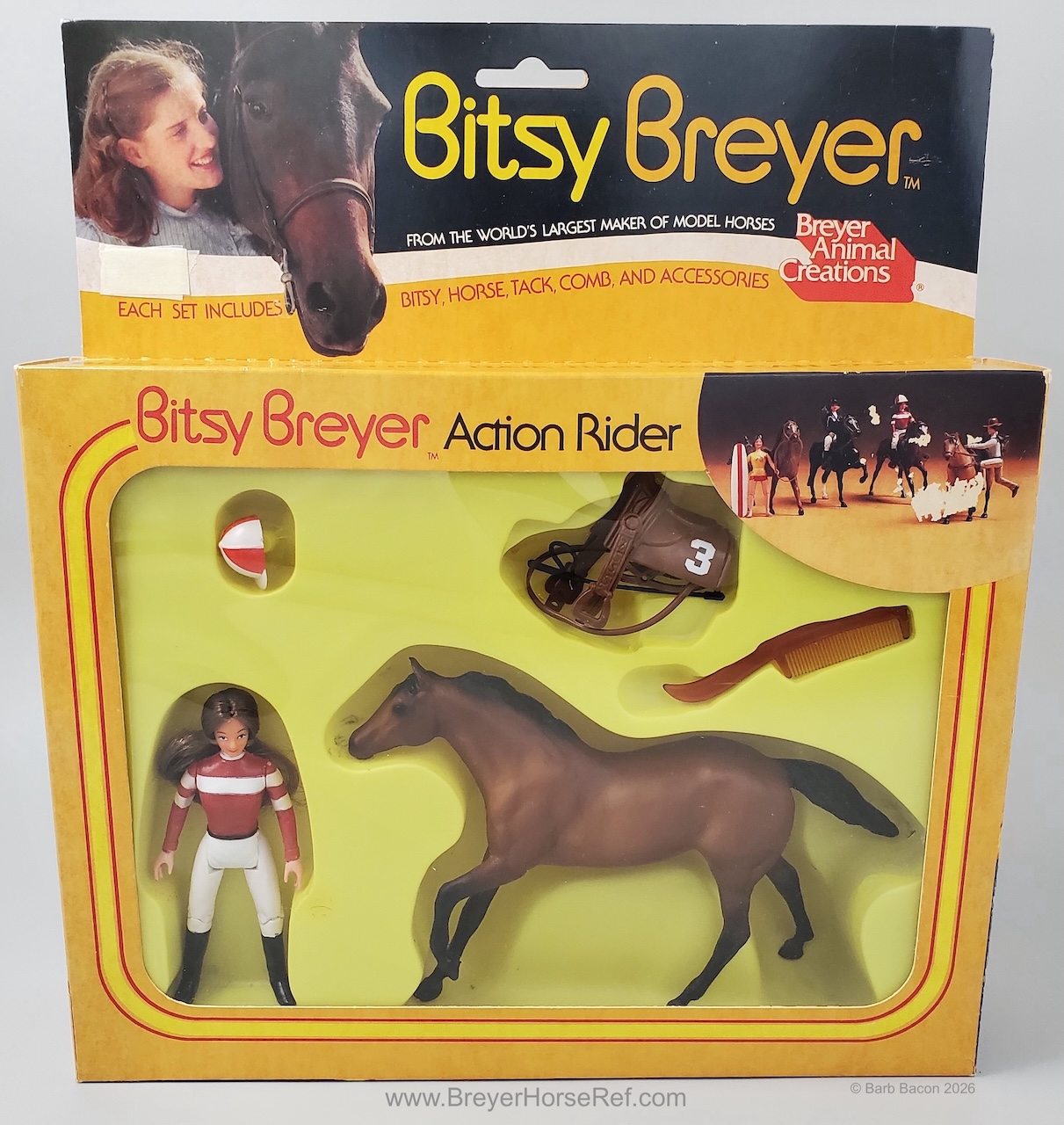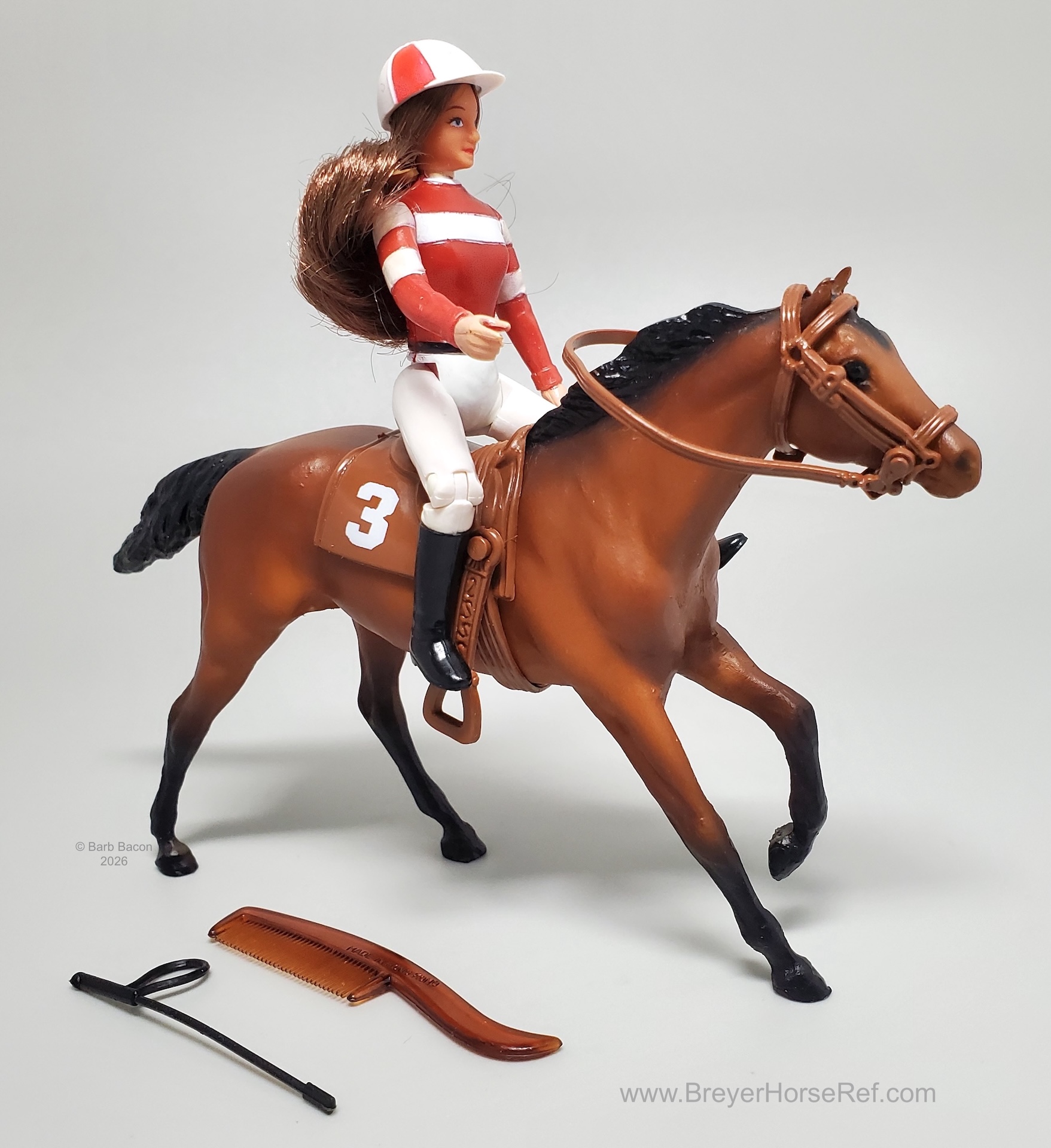 The Bitsy Breyer Jockey Set #1010 included Bitsy Breyer doll, Racing Tack, helmet and comb from 1984-1987, in Bay, Chestnut and Black.