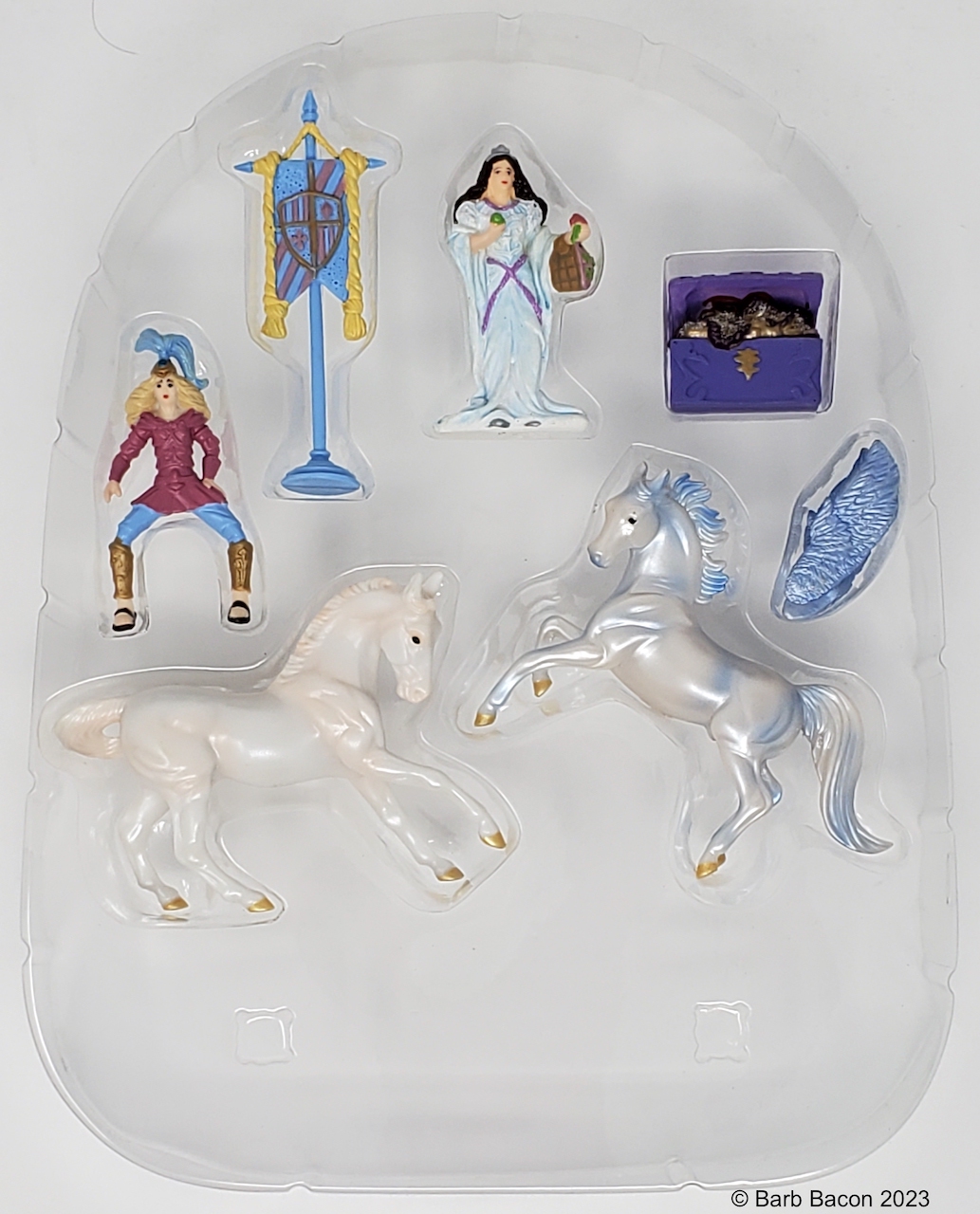 Included the Warmblood and Rearing Arabian with Removable Wings, 1 Queen Figurine, 1 Princess Kayla Rider, 1 Heraldic Sign, 1 Treasure Chest, and 1 Backdrop, in a plastic backpack.
