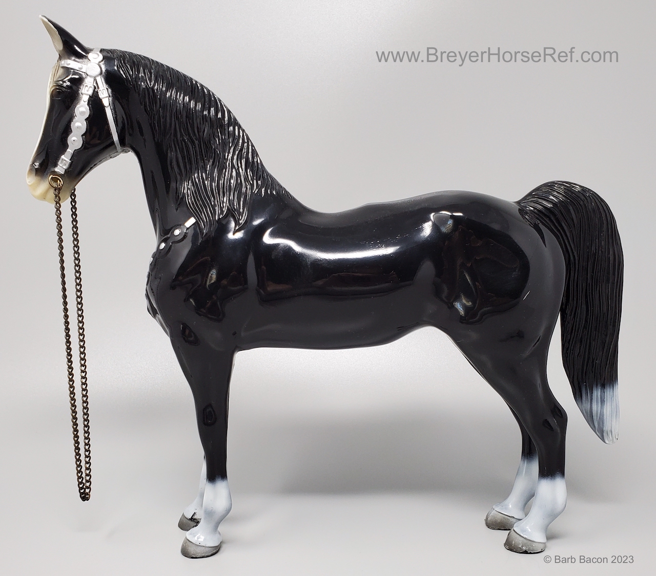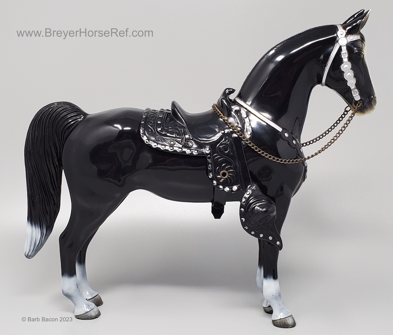 Glossy Black with bald face, four socks, white tail tip, and grey hooves. Some models may have pinking on the nose and ears. This model was molded white plastic, so the bald face is basically unpainted, and the socks could be either white plastic or painted white. The snap-on saddle is black with the low grommets and silver accents. The bridle is silver, and the breast collar has silver studs and straps. He came with the chain reins.