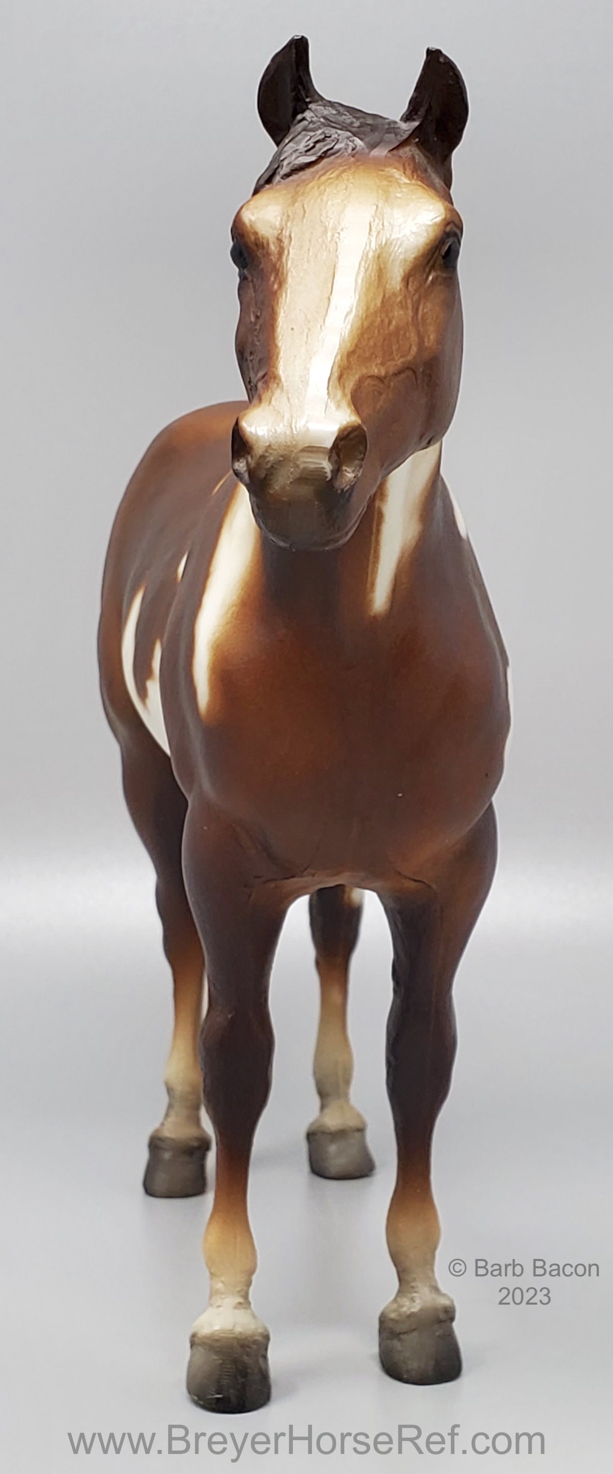 Has the round Breyer Molding Co Copyright Stamp and some models have a B Stamp, which signifies a different plastic blend was used for the mold.