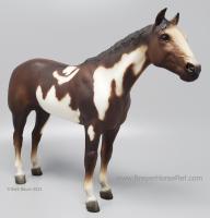 Chestnut Overo. Chestnut varied from light brown to dark brown. Variations included with or without spot on right foreleg, with or without spot on left foreleg, and an added spot with crescent shape on the right side of the back. The size of the spots also varied.