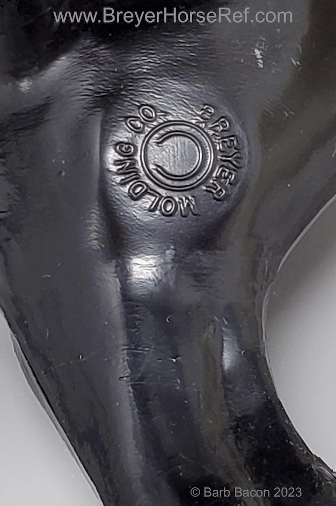 Glossy black tobiano with white stockings, grey hooves, and a bald face. Model has a charcoal colored hard plastic open stirrup saddle and chain reins. Many models had eye whites. From 1963-1968, this mold was called 'Cheyenne'.