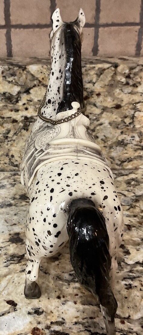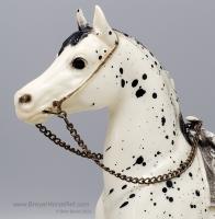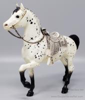 Semi-gloss black leopard appaloosa with black points, charcoal shaded hard plastic saddle and chain reins. Model was released in the Showcase Collection boxes in 1970-1972 as #1150. From 1963-1968, this mold was called 'Cheyenne'.