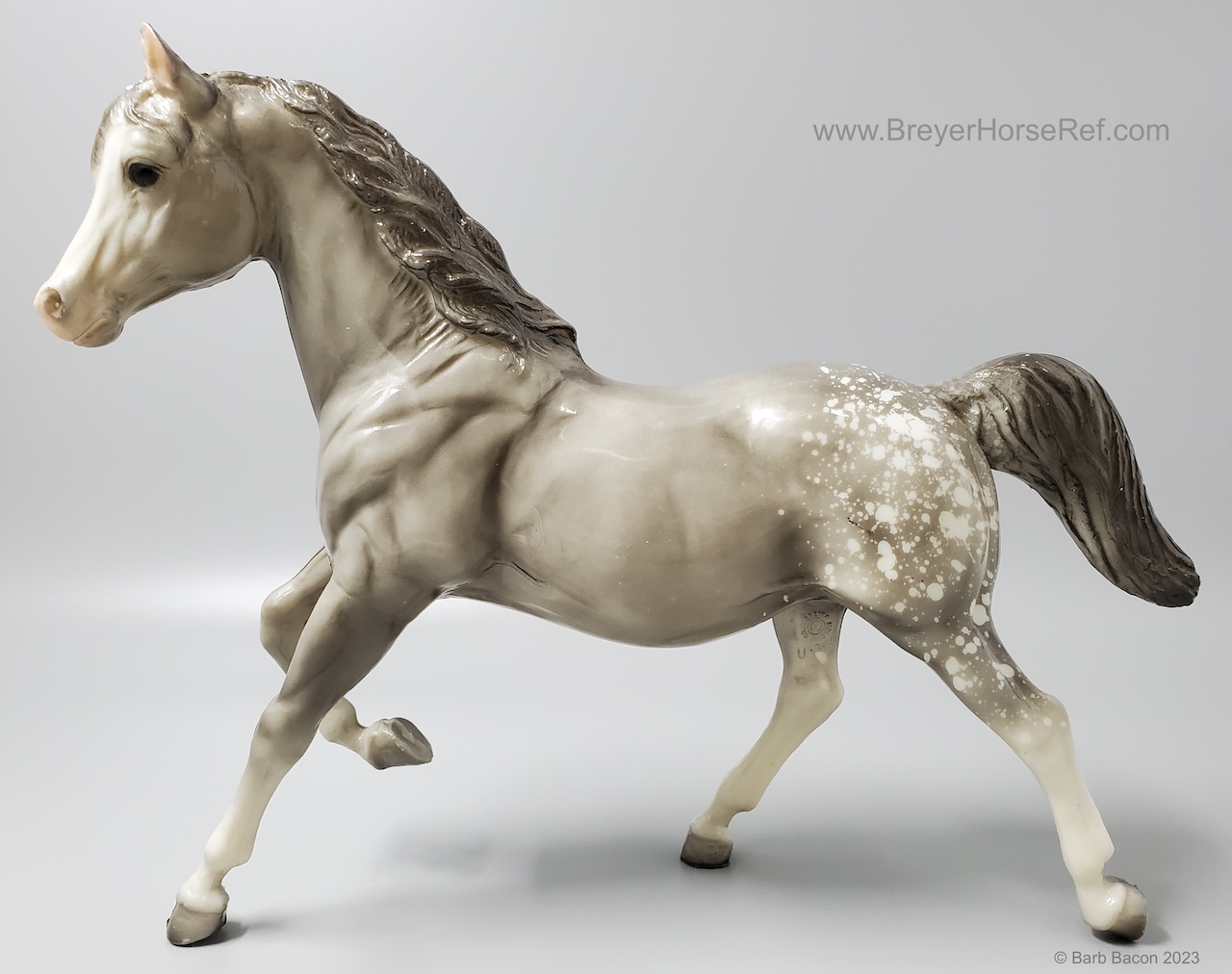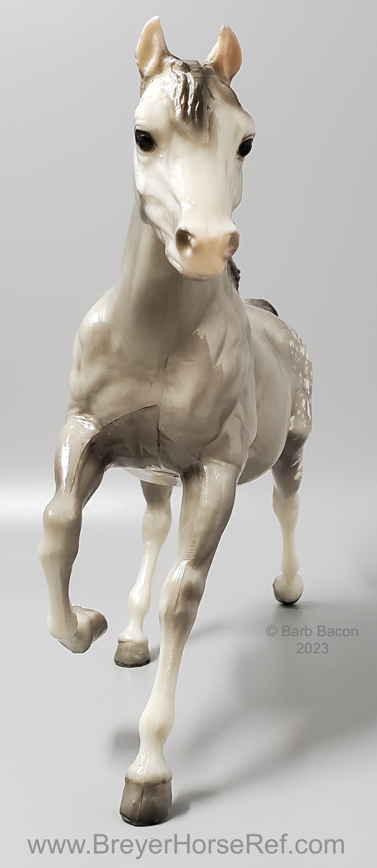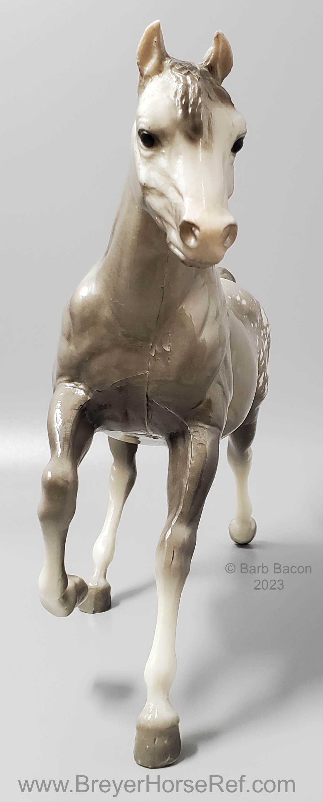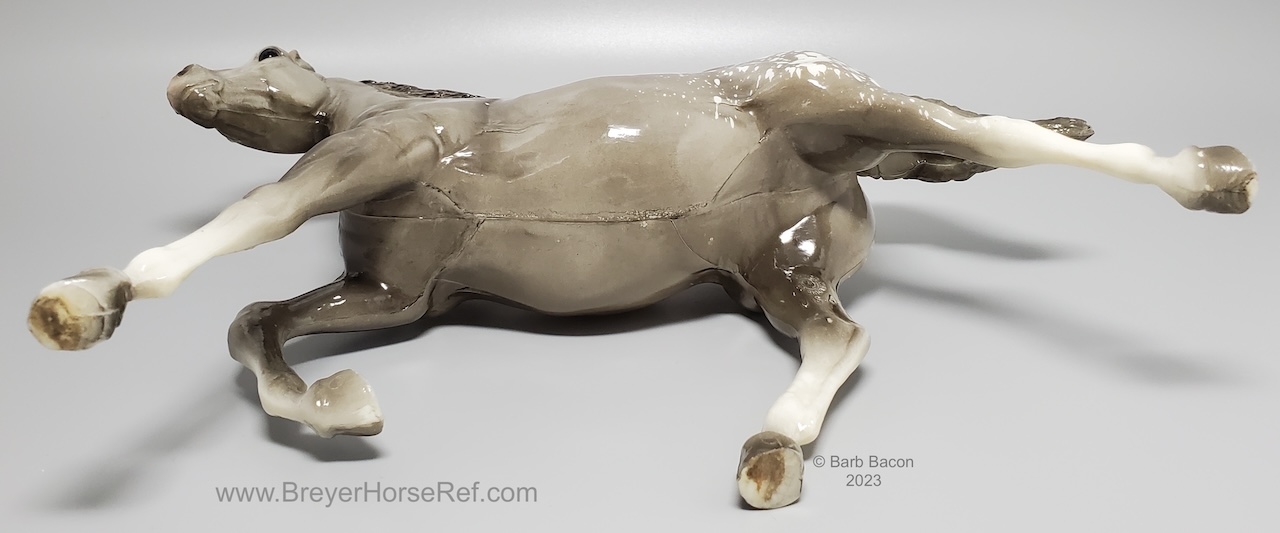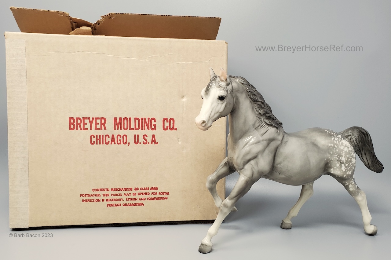 Glossy dapple grey, grey mane and tail, 4 stockings with grey hooves, and bald face with pink nose and ears. These white spots are considered dapples (black spots would be appaloosa spots). Most models just have the dapples on the rump, though there can be a wide range of variation. An uncommon variation was matte finish, late in the run. From 1962-1968, this mold was called 'Sugar', then starting in 1969, was just called 'Running Mare'.