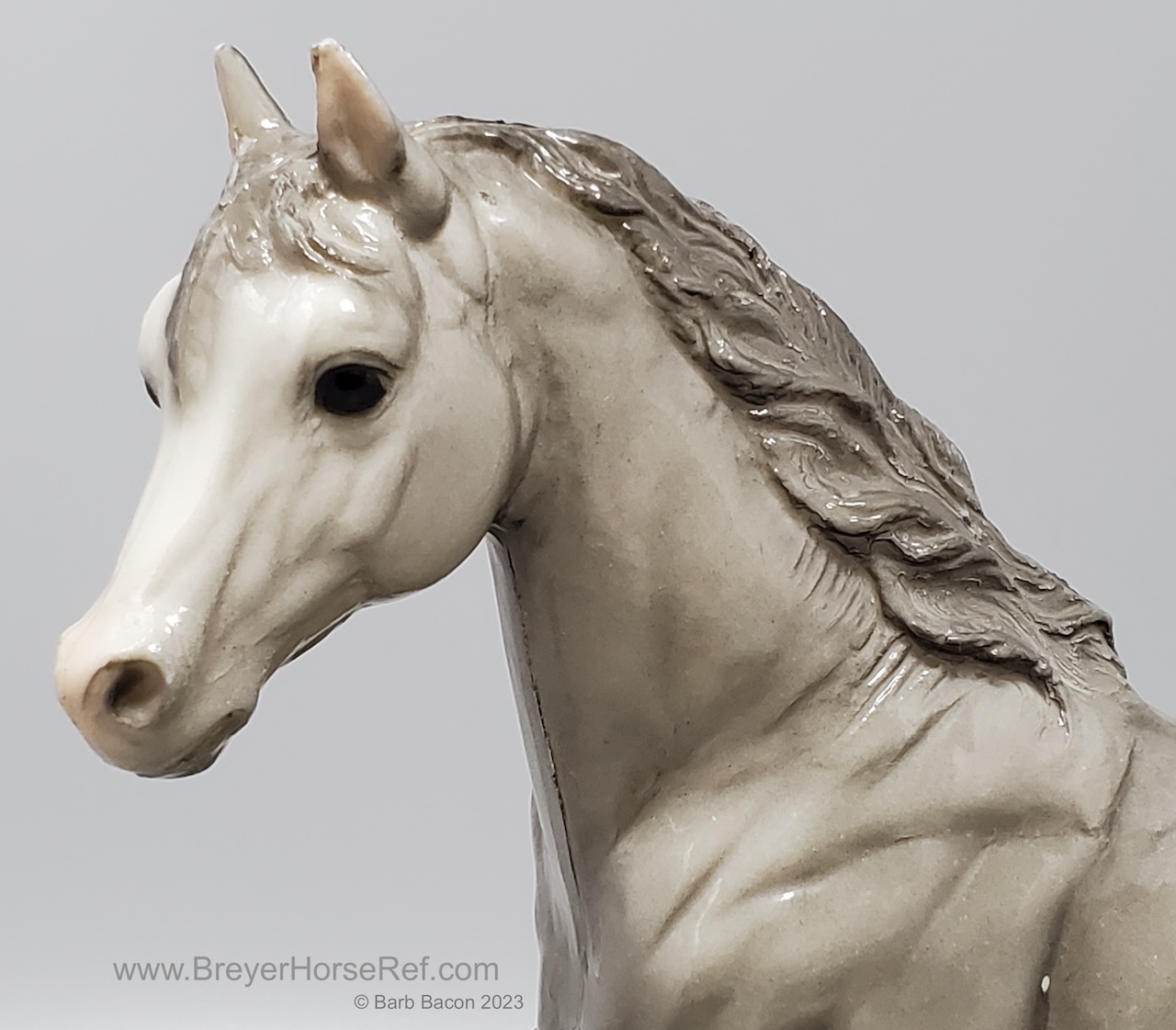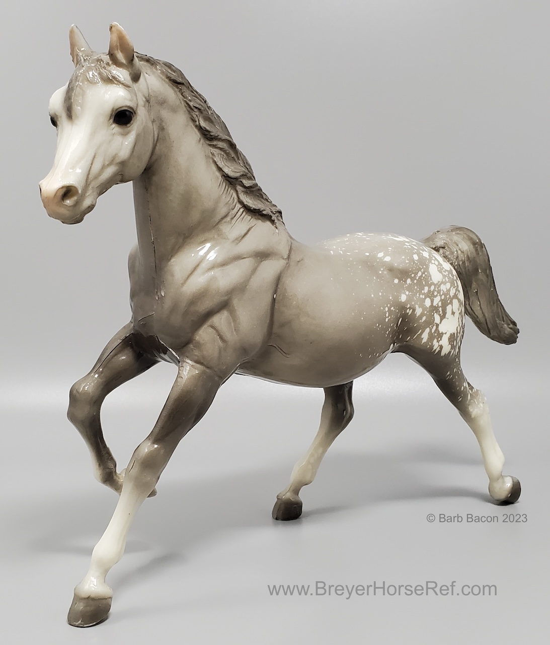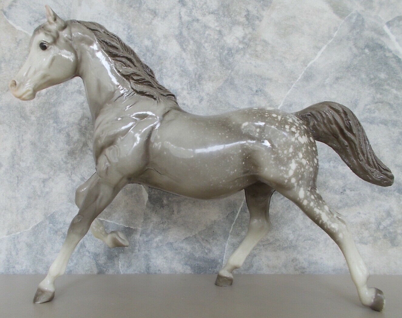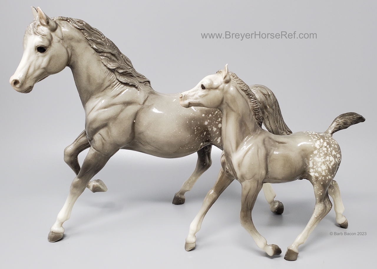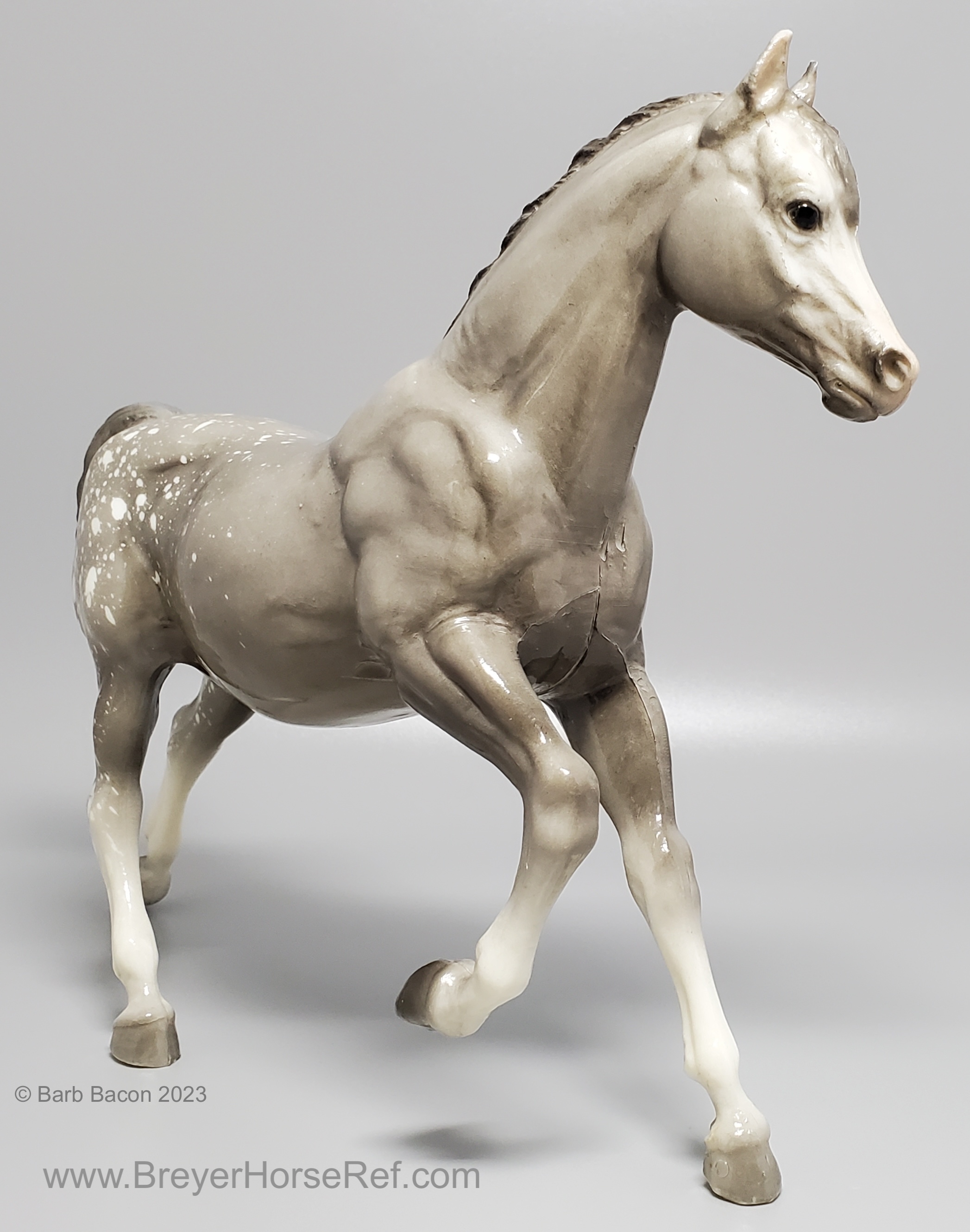 Glossy dapple grey, grey mane and tail, 4 stockings with grey hooves, and bald face with pink nose and ears. These white spots are considered dapples (black spots would be appaloosa spots). Most models just have the dapples on the rump, though there can be a wide range of variation. An uncommon variation was matte finish, late in the run. From 1962-1968, this mold was called 'Sugar', then starting in 1969, was just called 'Running Mare'.