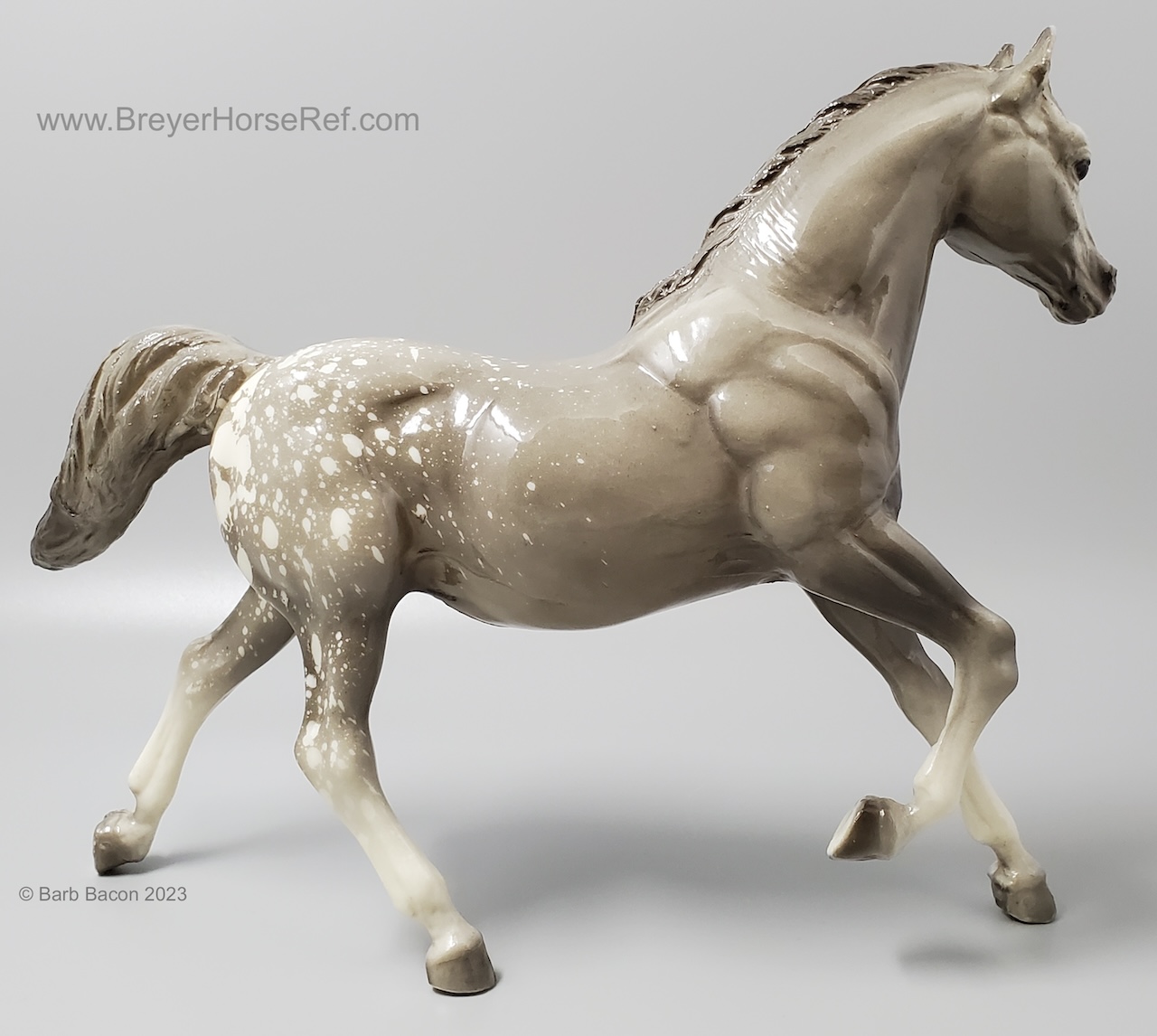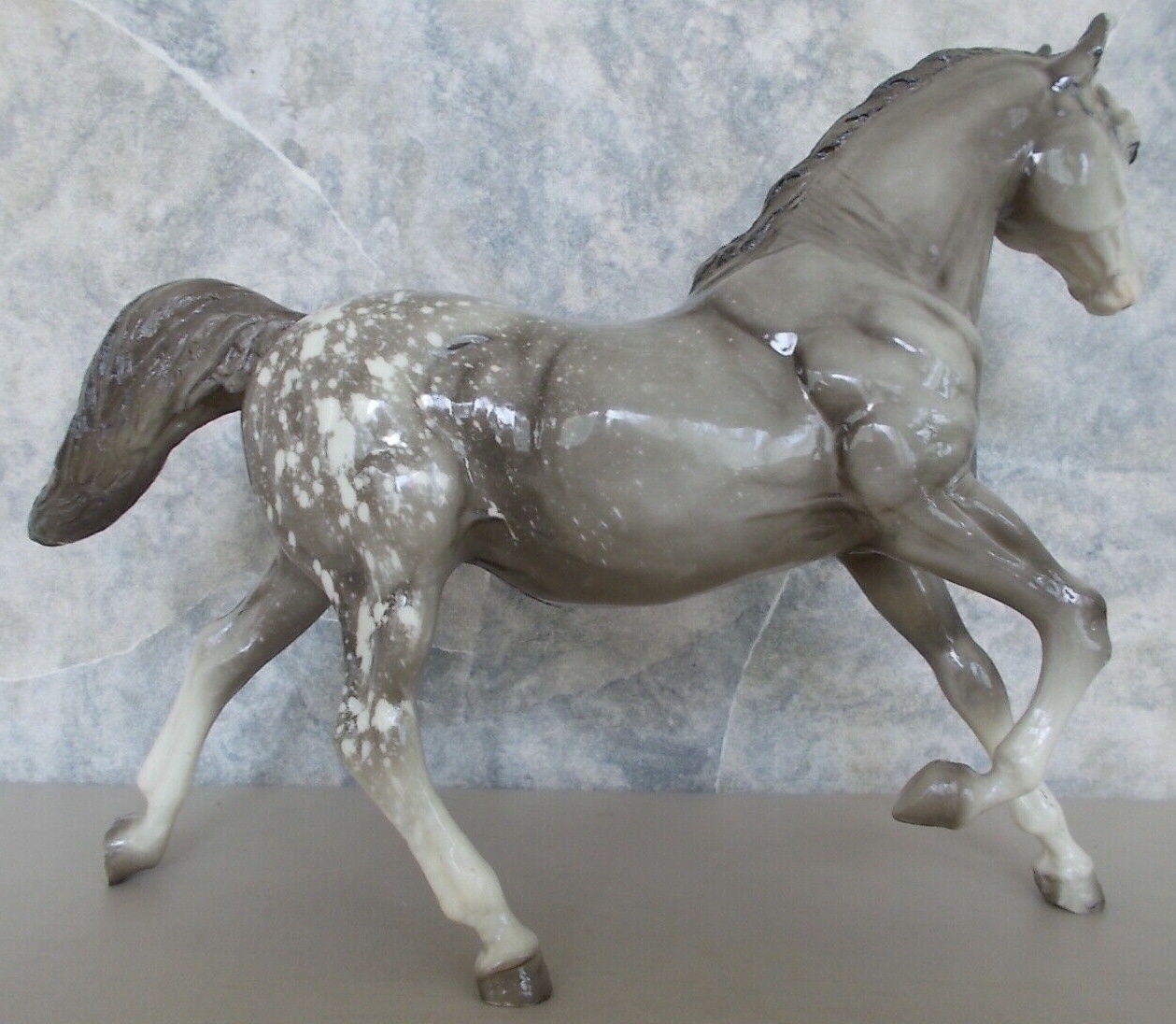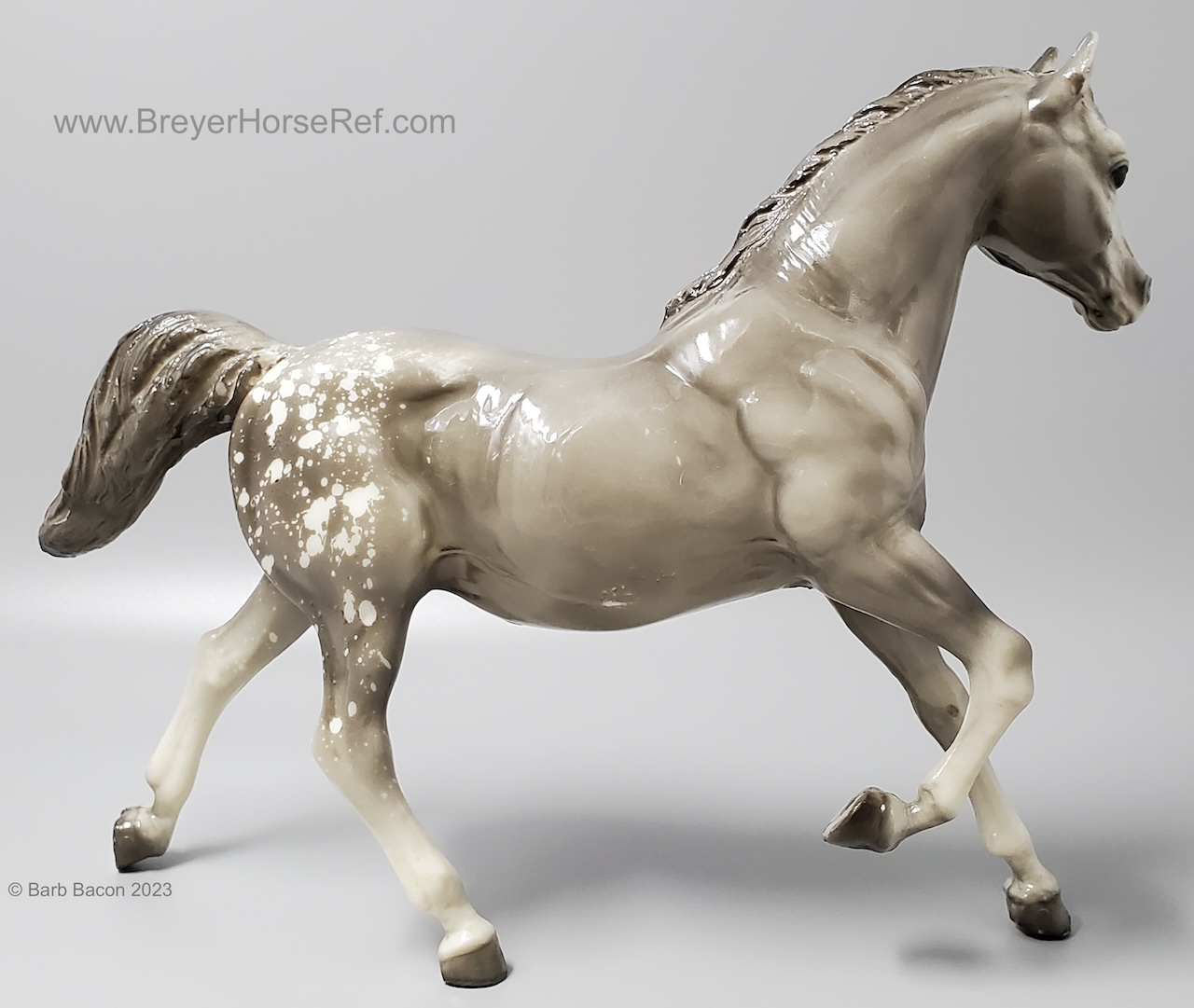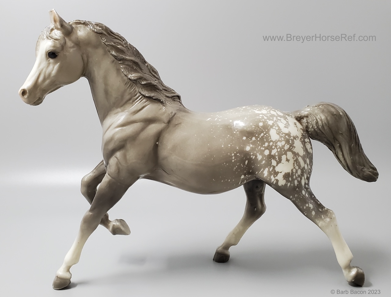 Glossy dapple grey, grey mane and tail, 4 stockings with grey hooves, and bald face with pink nose and ears. These white spots are considered dapples (black spots would be appaloosa spots). Most models just have the dapples on the rump, though there can be a wide range of variation. An uncommon variation was matte finish, late in the run. From 1962-1968, this mold was called 'Sugar', then starting in 1969, was just called 'Running Mare'.