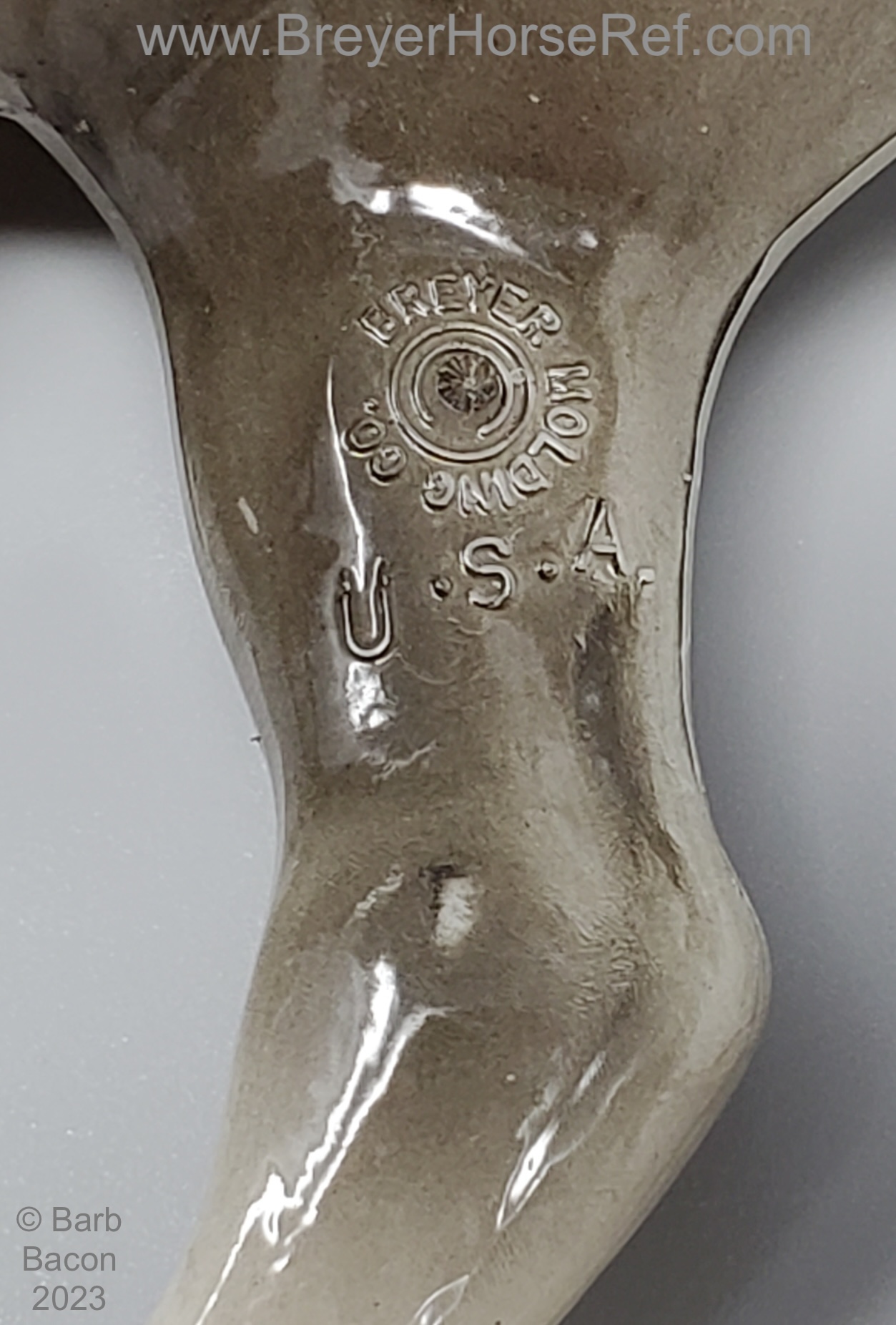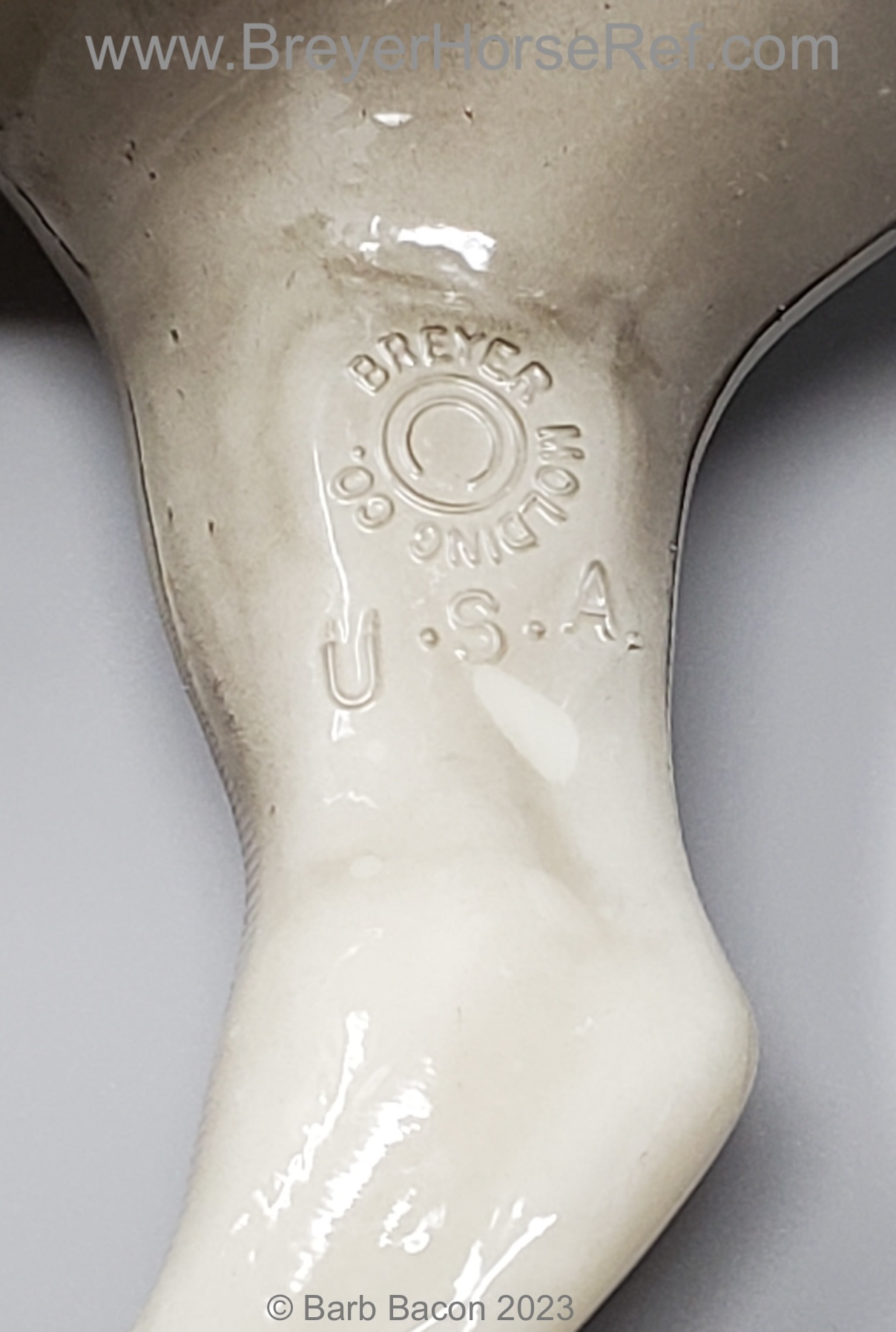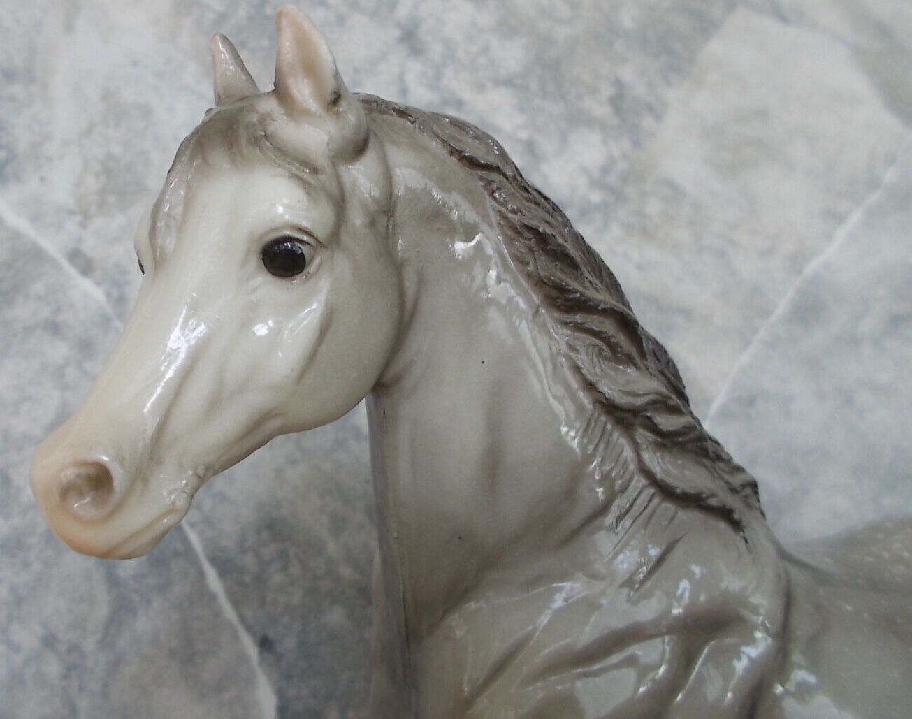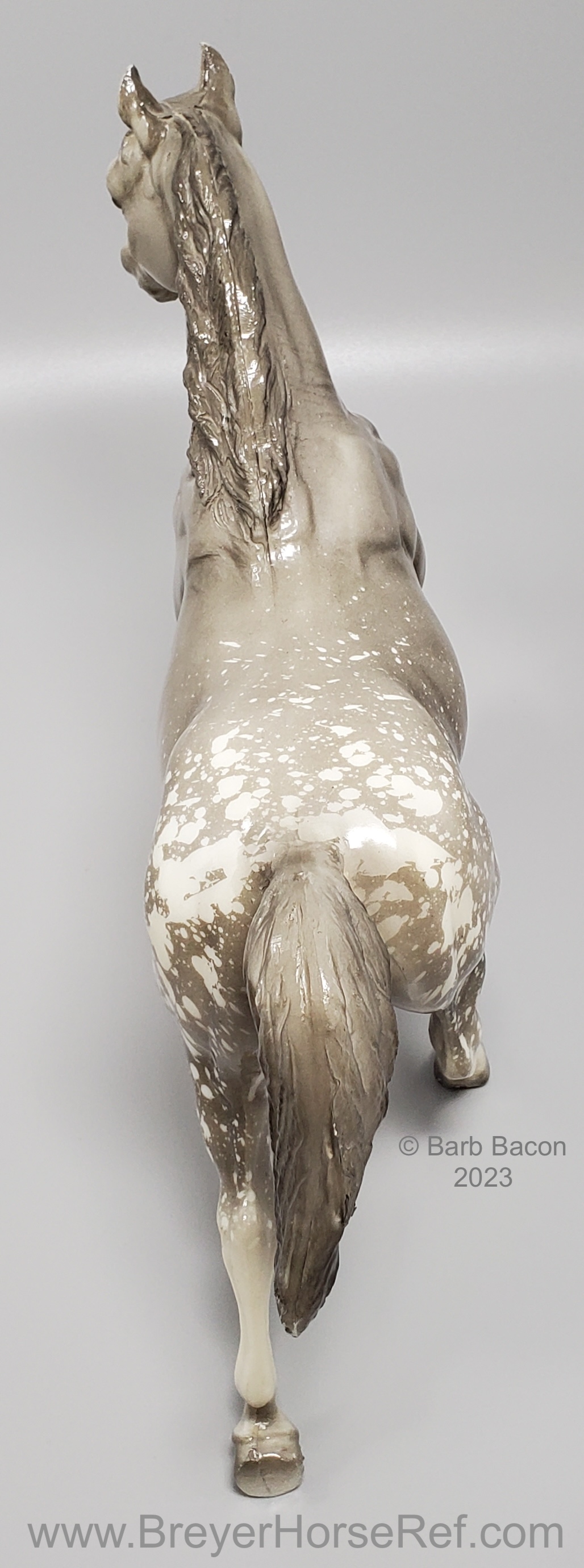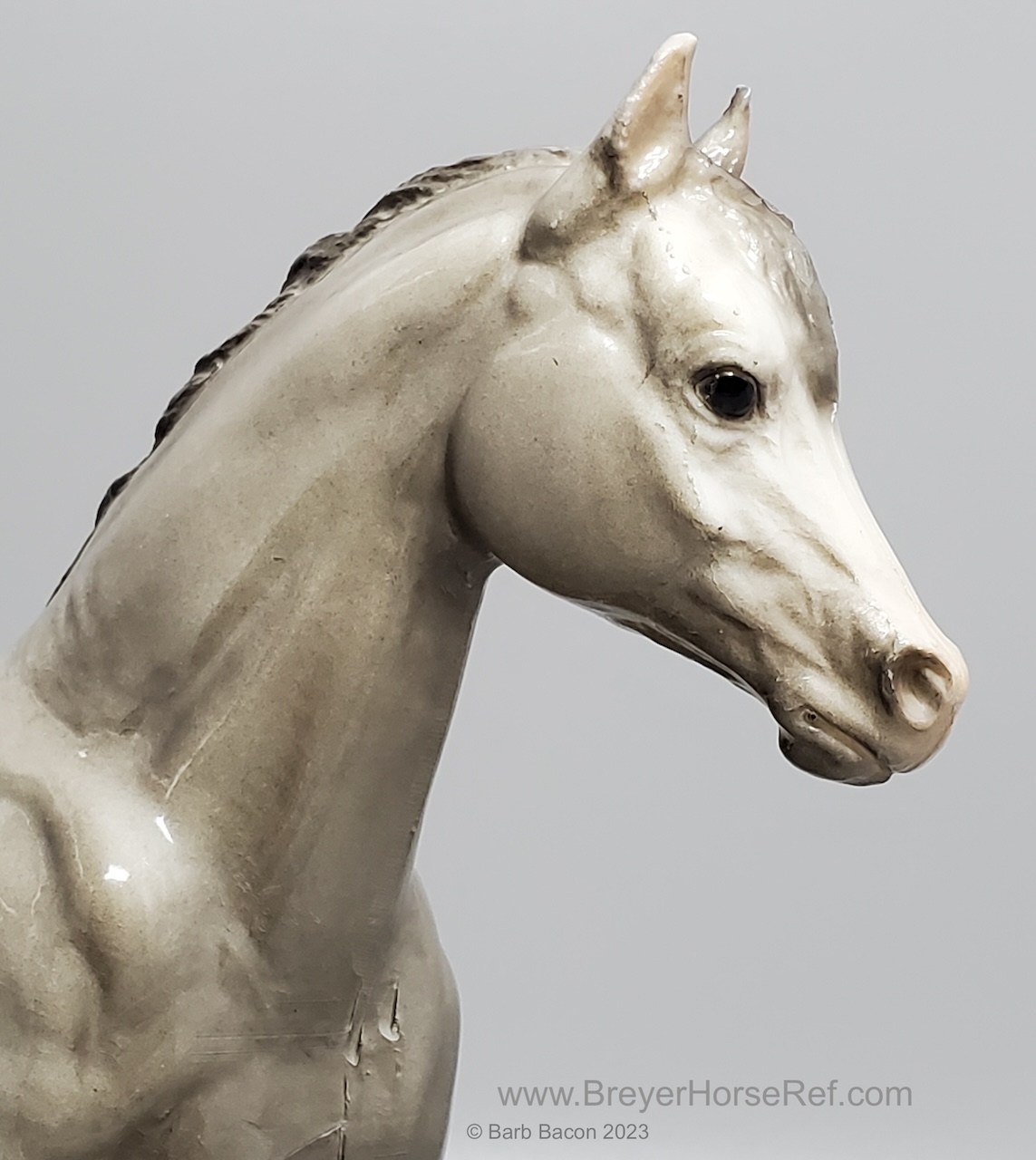 Glossy dapple grey, grey mane and tail, 4 stockings with grey hooves, and bald face with pink nose and ears. These white spots are considered dapples (black spots would be appaloosa spots). Most models just have the dapples on the rump, though there can be a wide range of variation. An uncommon variation was matte finish, late in the run. From 1962-1968, this mold was called 'Sugar', then starting in 1969, was just called 'Running Mare'.