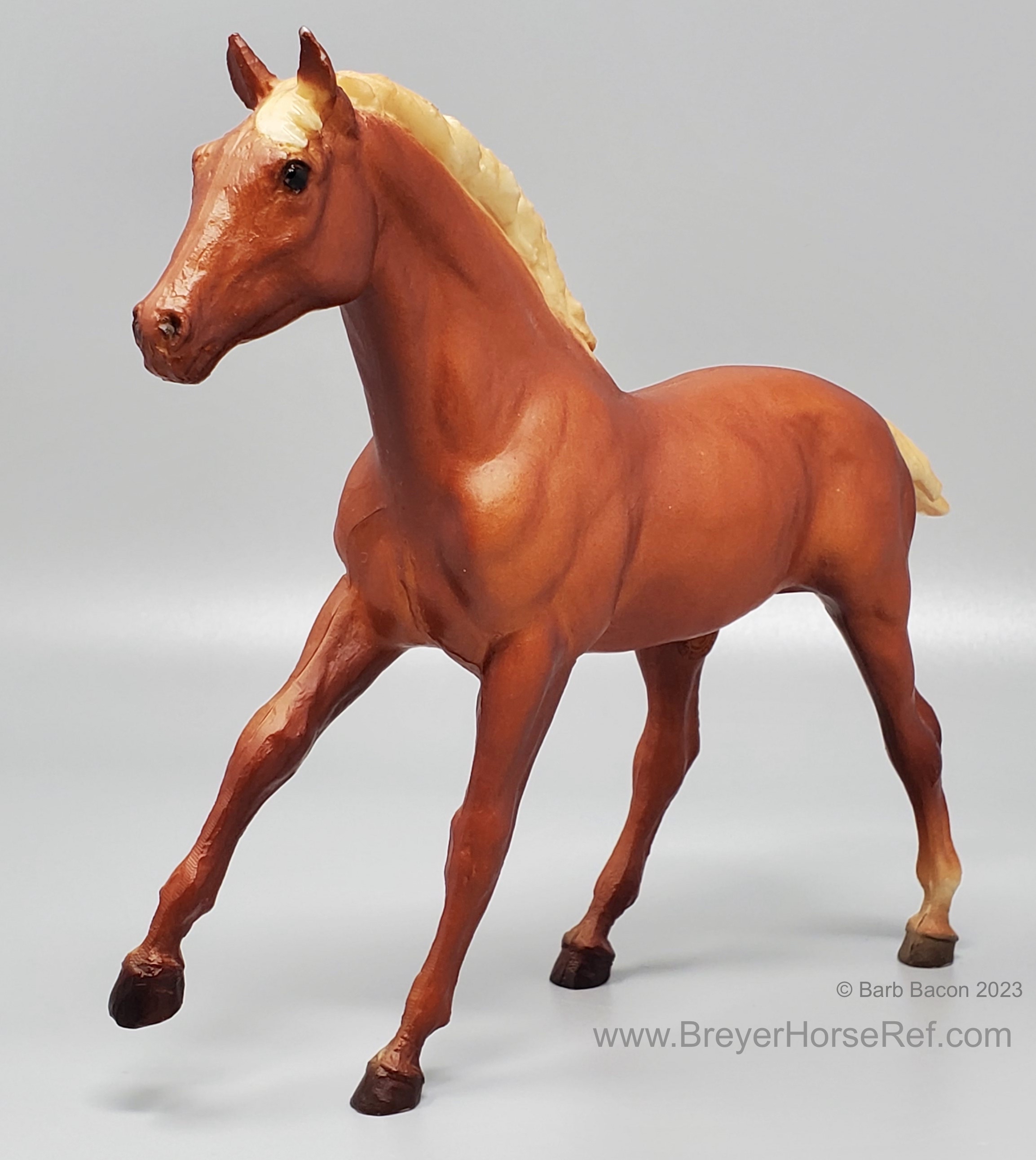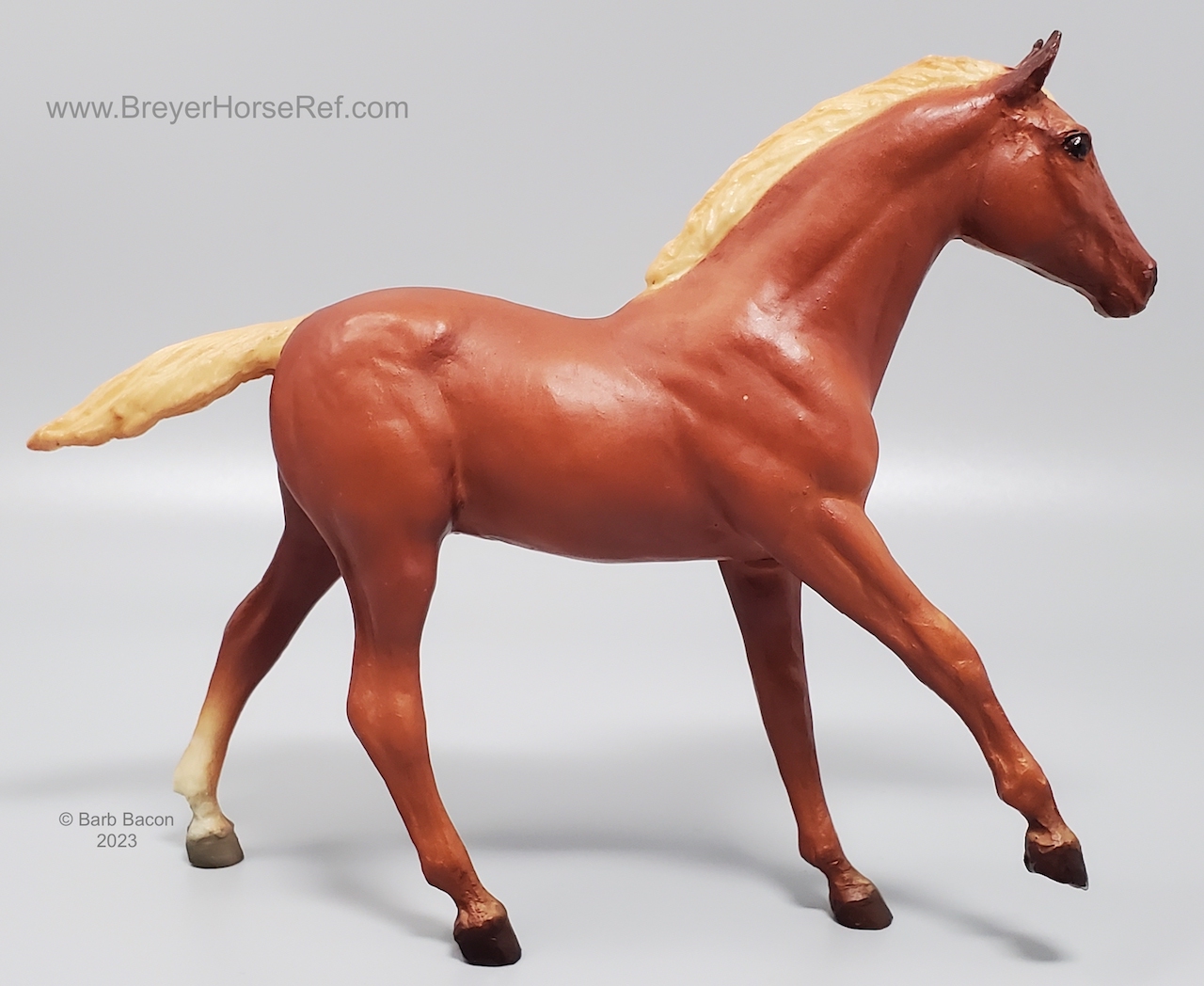 Red chestnut with flaxen mane and tail and left hind stocking. One variation is the mane is the same color as the body.