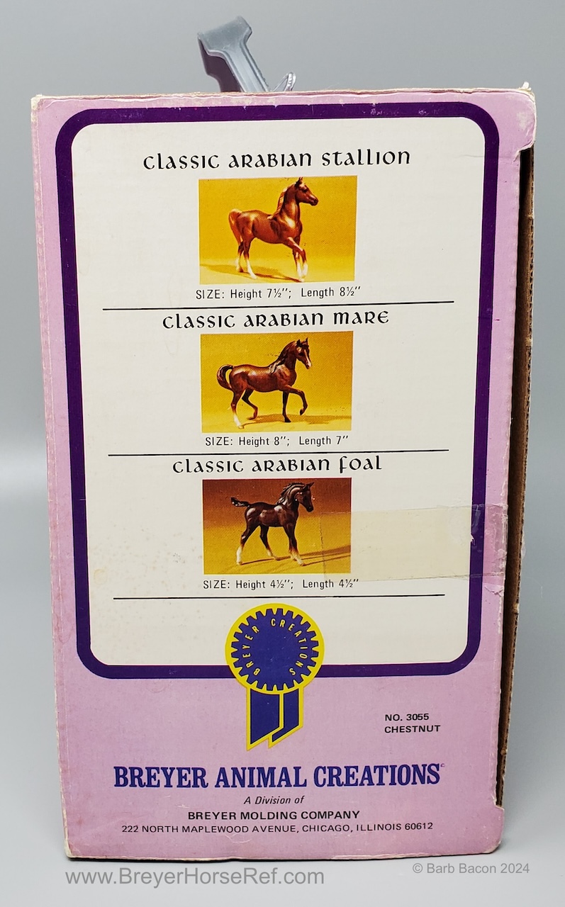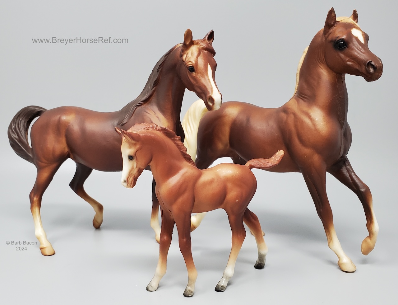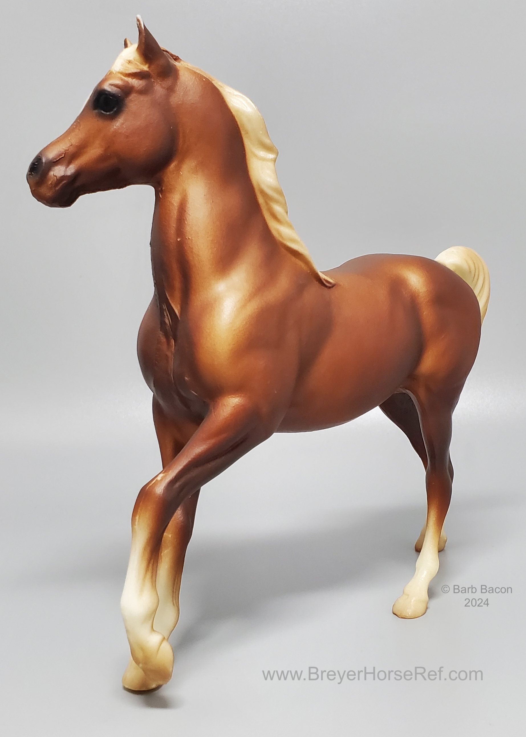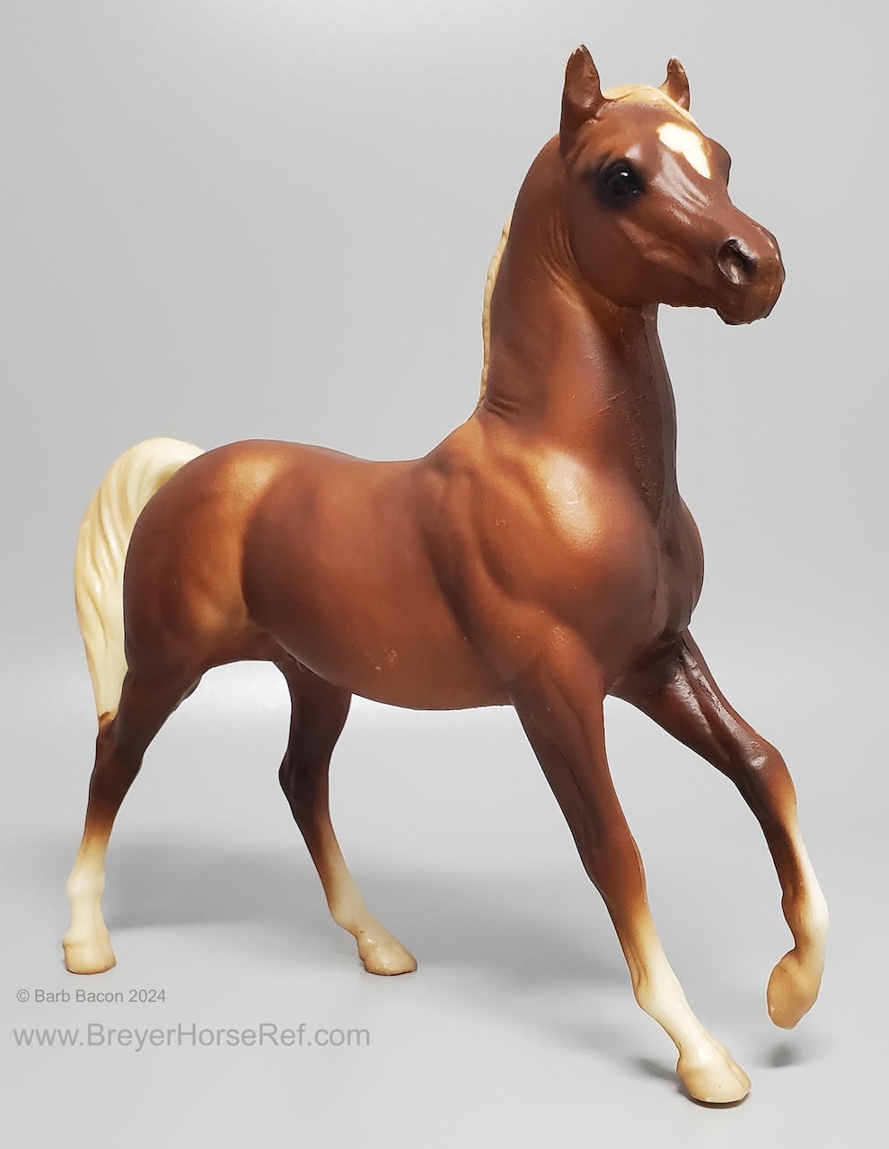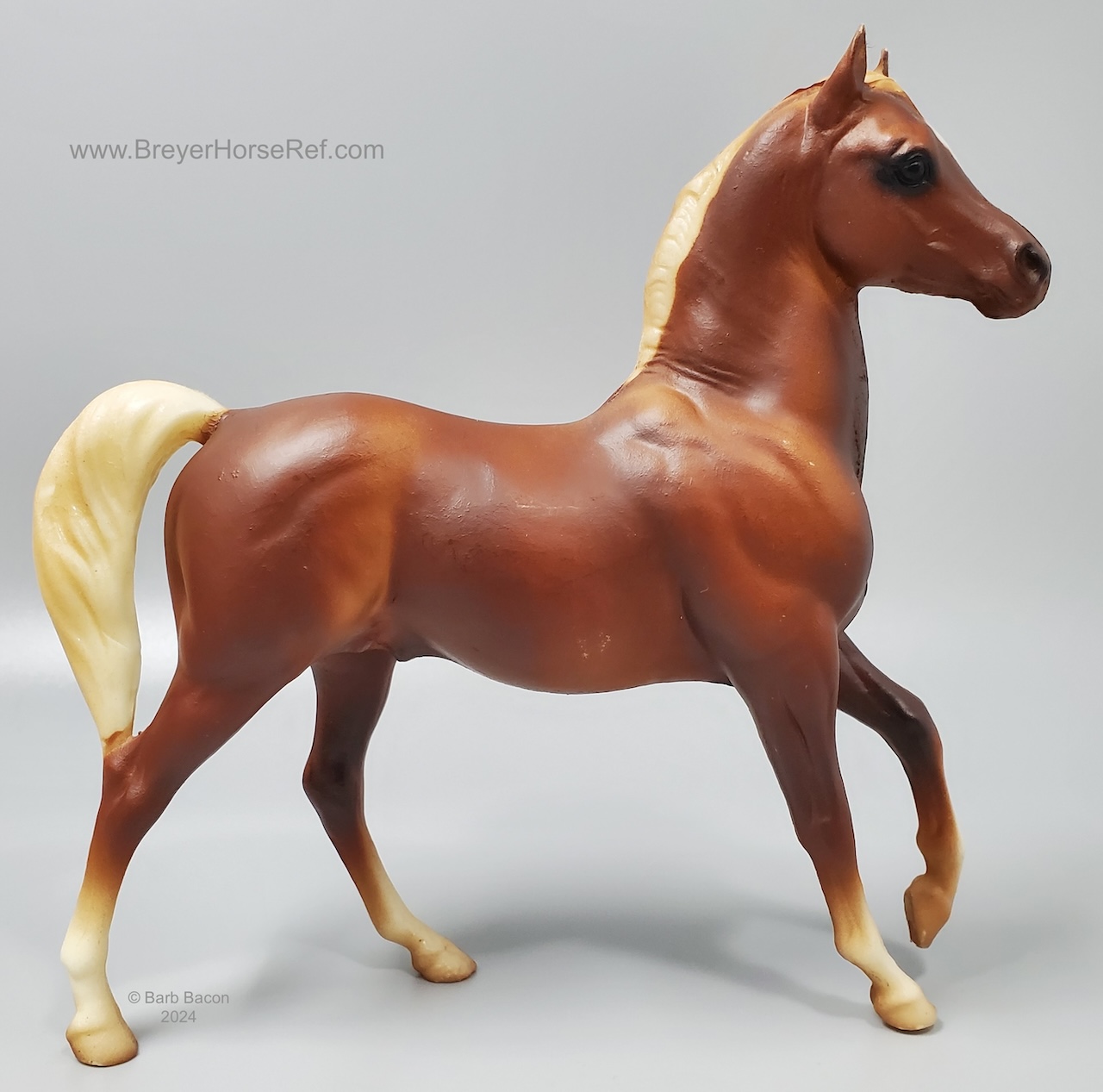 Chestnut with flaxen mane and tail and 4 stockings. Typically models in the 1970's had tan hooves and a star, after that the face was solid and the hooves were grey. Released in the Classic Arabian Family Set #3055 from 1973-1991, and included the Classic Arabian Mare, Stallion and Foal.