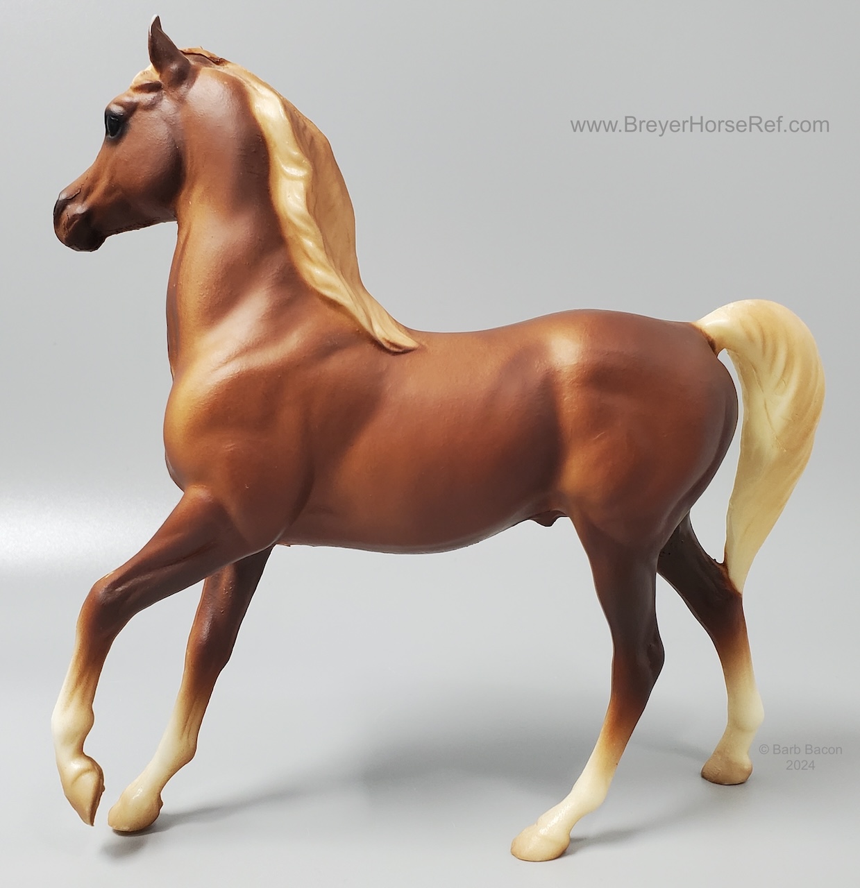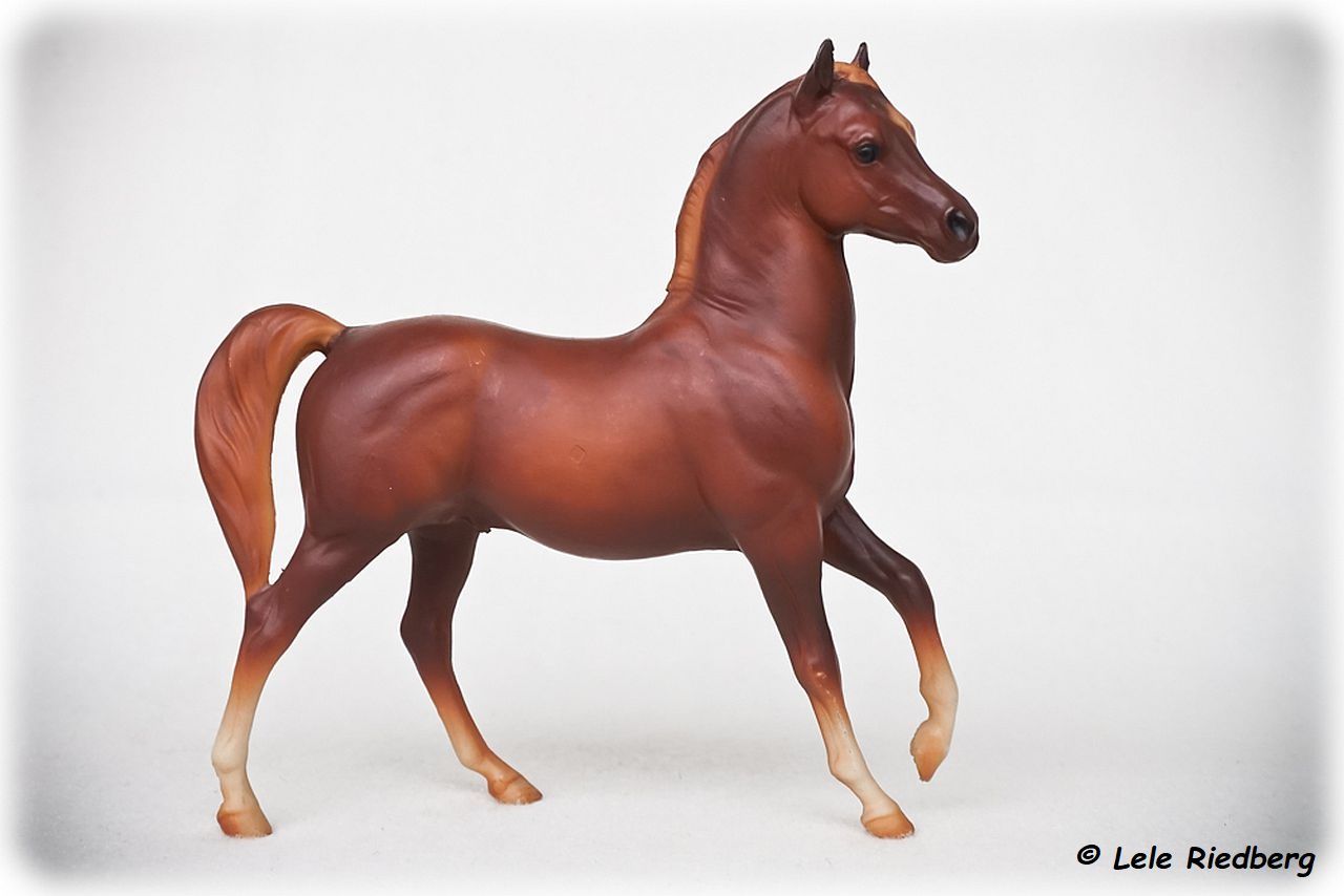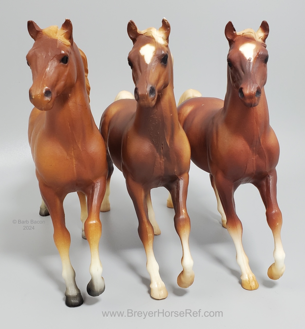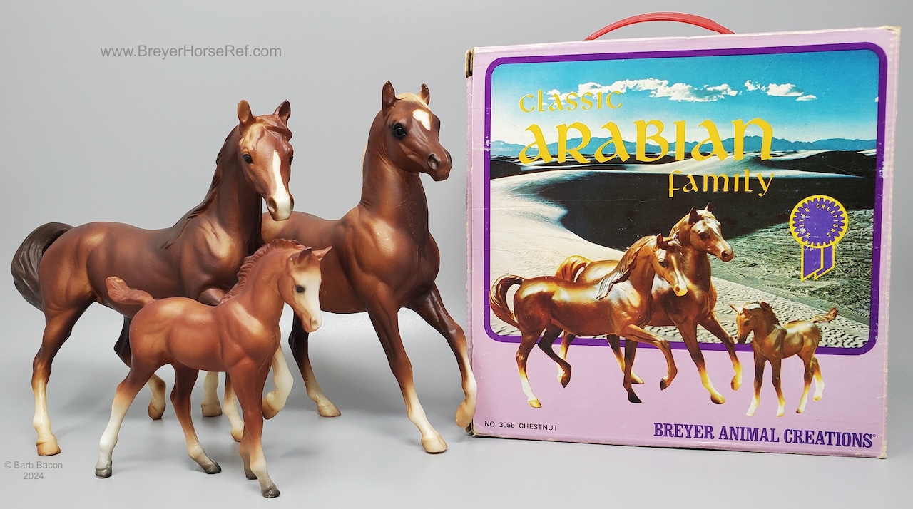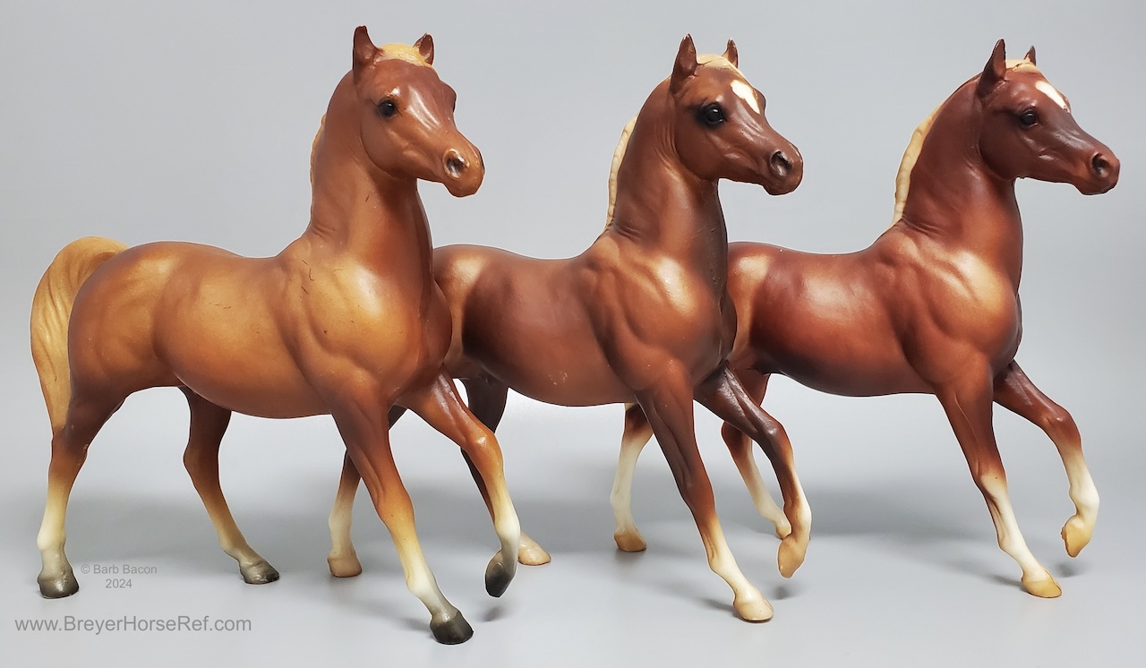 Chestnut with flaxen mane and tail and 4 stockings. Typically models in the 1970's had tan hooves and a star, after that the face was solid and the hooves were grey. Released in the Classic Arabian Family Set #3055 from 1973-1991, and included the Classic Arabian Mare, Stallion and Foal.