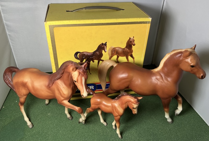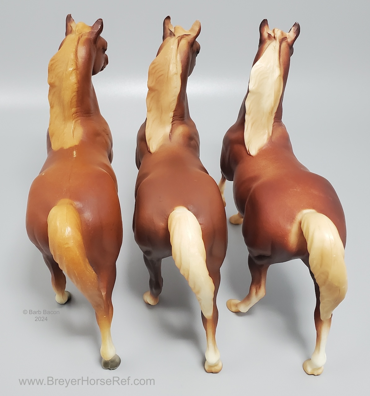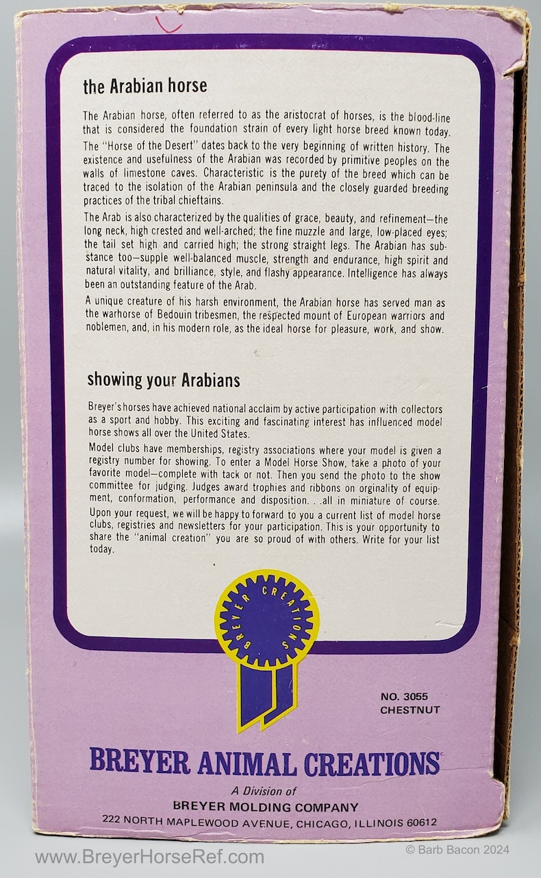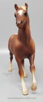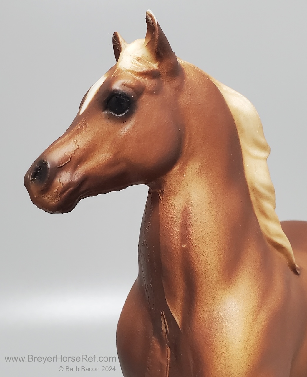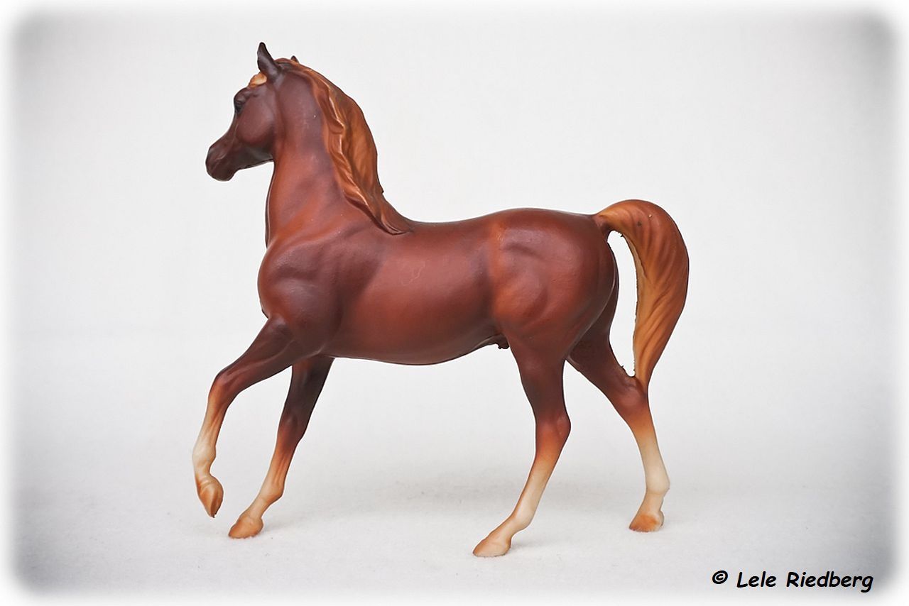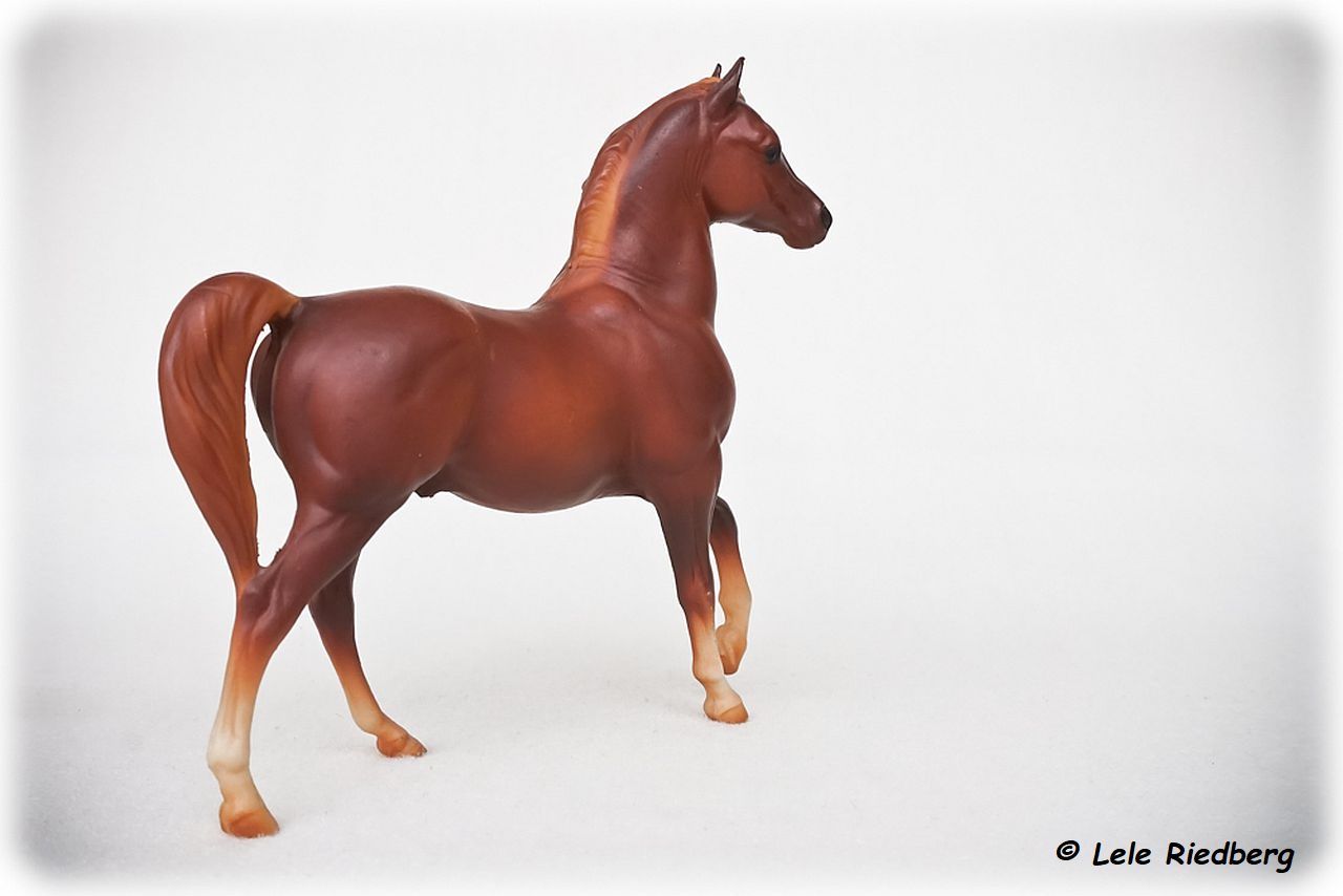 Chestnut with flaxen mane and tail and 4 stockings. Typically models in the 1970's had tan hooves and a star, after that the face was solid and the hooves were grey. Released in the Classic Arabian Family Set #3055 from 1973-1991, and included the Classic Arabian Mare, Stallion and Foal.