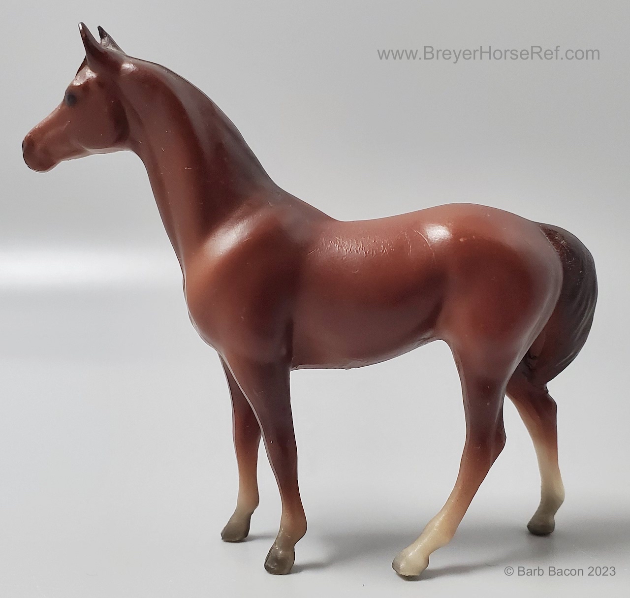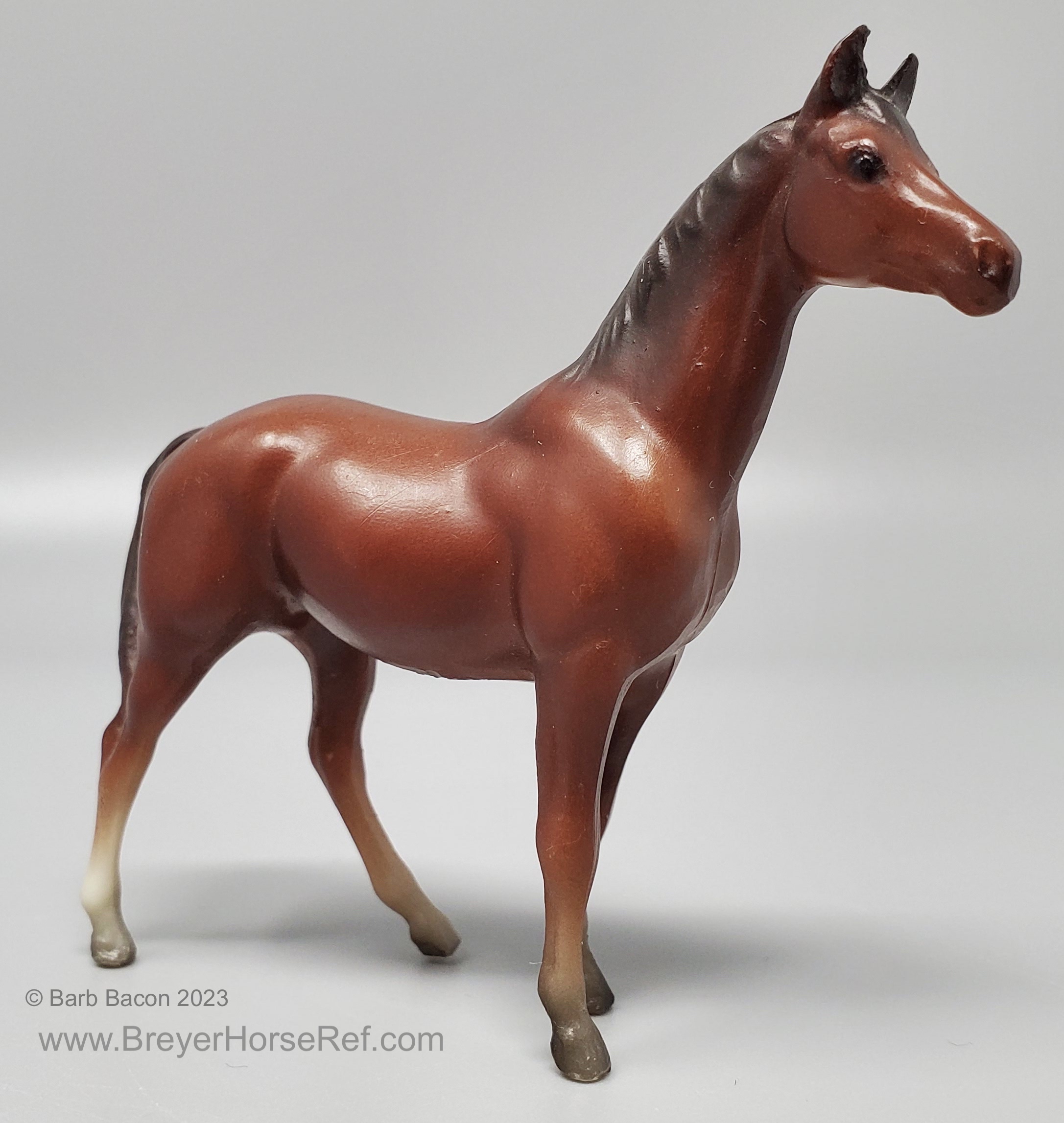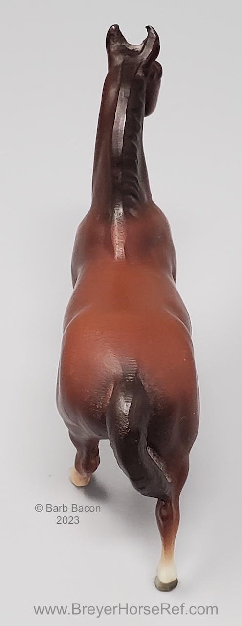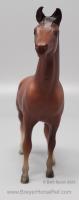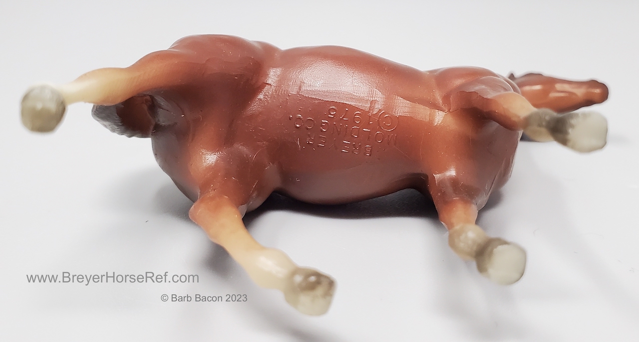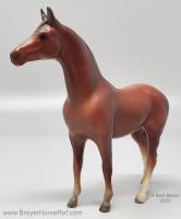 Chestnut with various socks, but most models have at least a prominent back right stocking. Originally sculpted by Maureen Love for Hagen-Renaker as a portrait of the famous race horse. Models are stamped with Copyright Breyer Molding Co 1975. Some models have a B Stamp, which signifies a different plastic blend was used for the mold. Early models had a space between the tail and leg, but that was soon filled in, until 2004 when Breyer retooled the mold to again have that space.