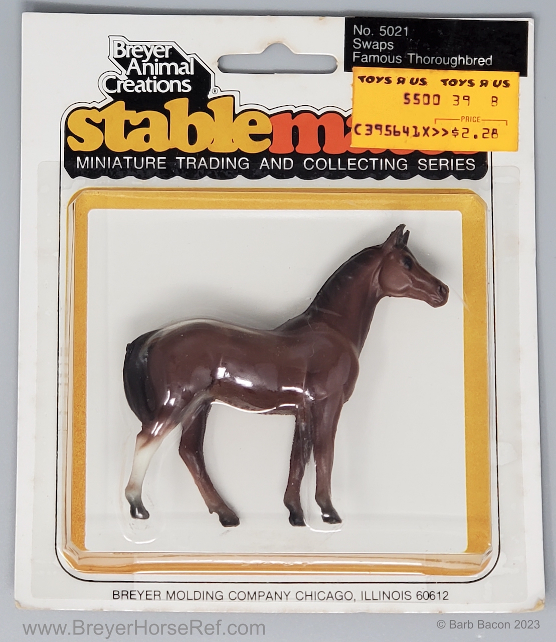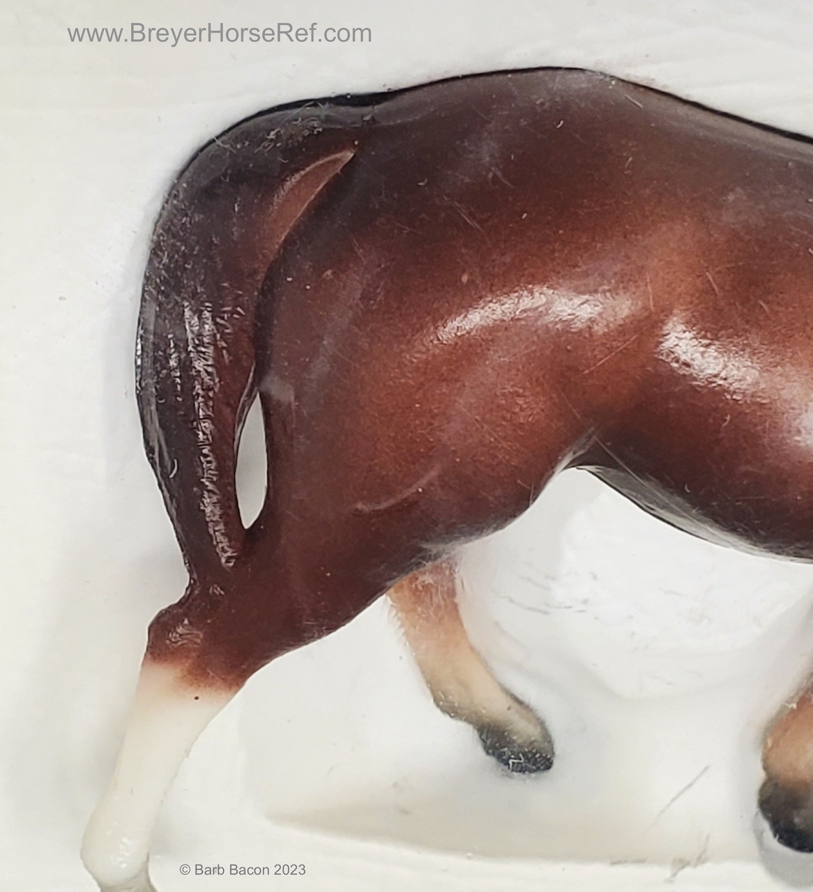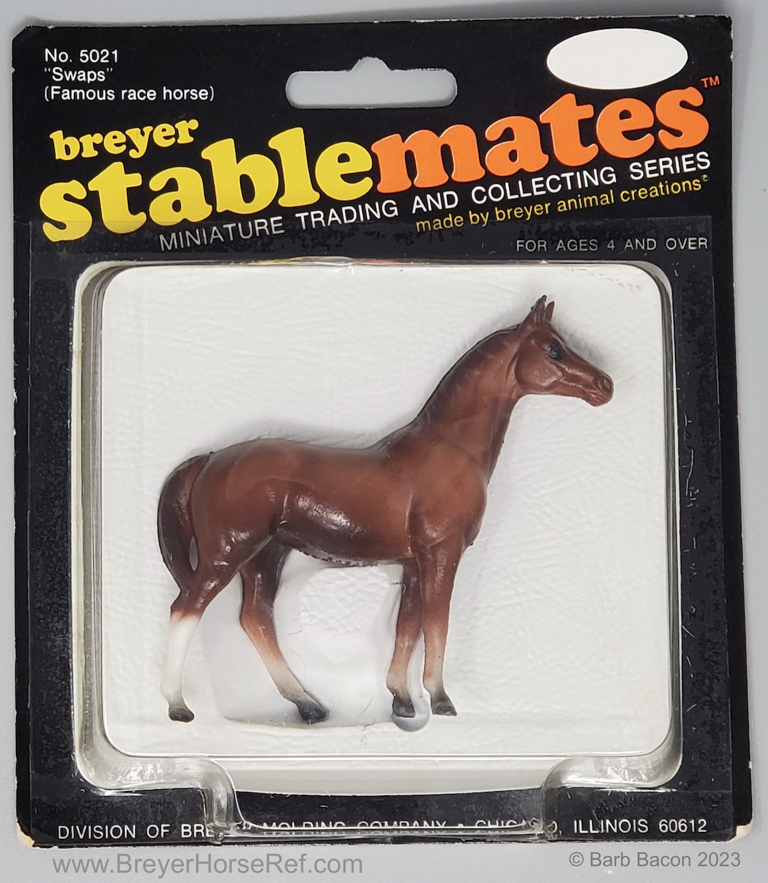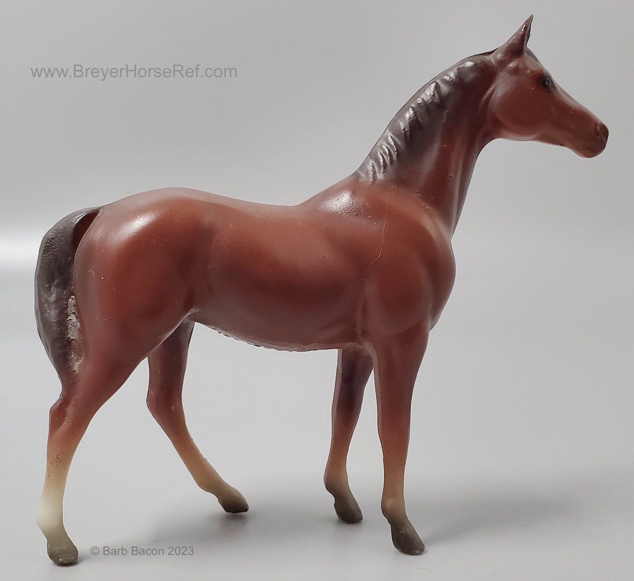 Chestnut with various socks, but most models have at least a prominent back right stocking. Originally sculpted by Maureen Love for Hagen-Renaker as a portrait of the famous race horse. Models are stamped with Copyright Breyer Molding Co 1975. Some models have a B Stamp, which signifies a different plastic blend was used for the mold. Early models had a space between the tail and leg, but that was soon filled in, until 2004 when Breyer retooled the mold to again have that space.
