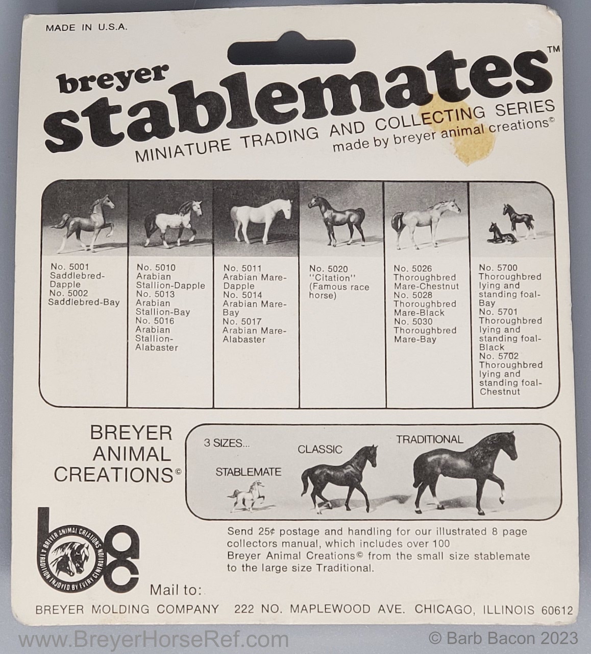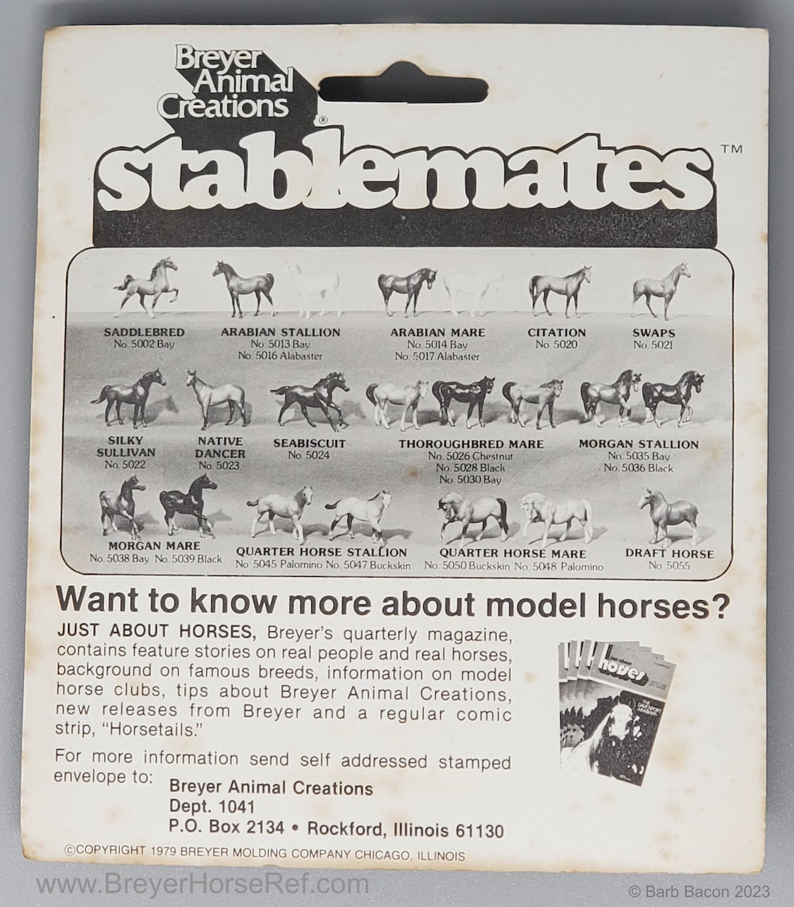 Released as a single #5021 from 1975-1994, and available in the Stablemate Assortment Set #5600 from 1990-1994. Models were released late in 1975, so not pictured in the catalog. These models were made from the heavier Cellulose Acetate plastic, except from 1992-1994 when they were made with the ABS plastic.