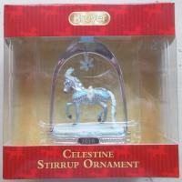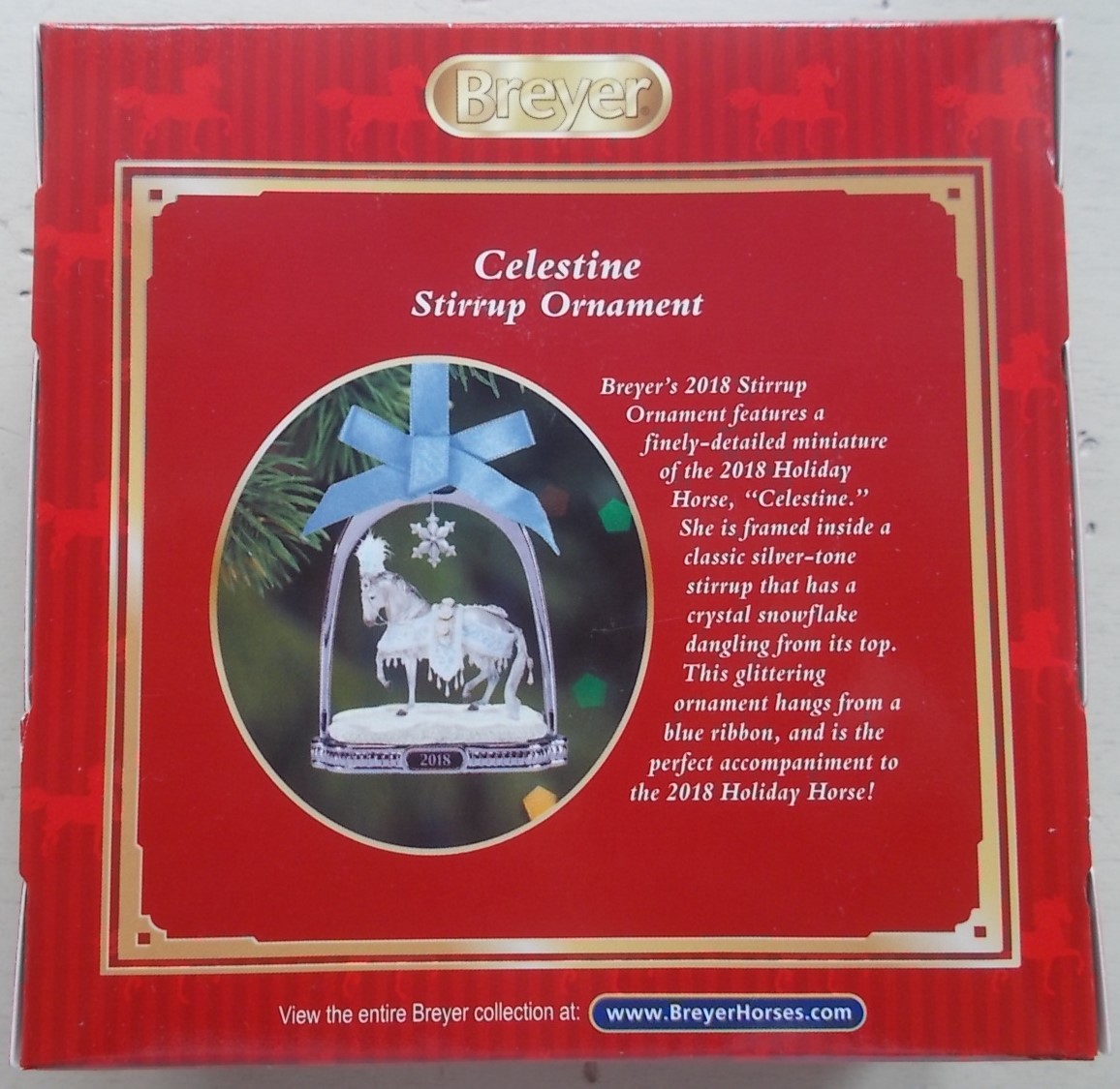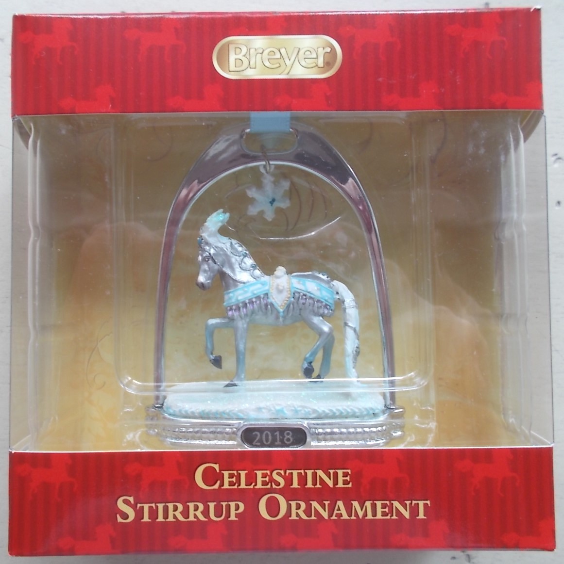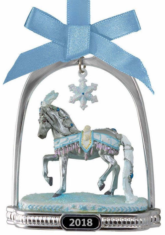 "Breyer’s 2018 Stirrup Ornament features a finely-detailed miniature of the 2018 Holiday Horse, “Celestine.” She is framed inside a classic silver-tone stirrup that has a crystal snowflake dangling from its top. This glittering ornament hangs from a blue ribbon, and is the perfect accompaniment to the 2018 Holiday Horse!" www.breyerhorses.com. 20th in the Stirrup Ornament Series.