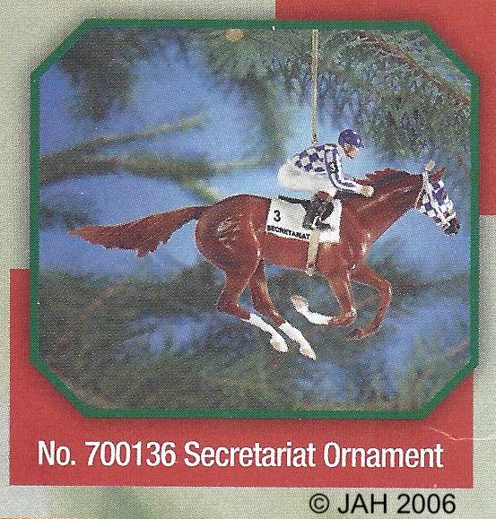 Secretariat won the Triple Crown in 1973, and was the 9th horse in history to win it. This was the 3rd model released in Breyer's Triple Crown Ornament Series. Sculpted by Donna Chaney. #10104 was released in 2004 and came in a yellow or red box, #700135 was released in 2005 in a red box, and in 2006, the number changed to 700136.