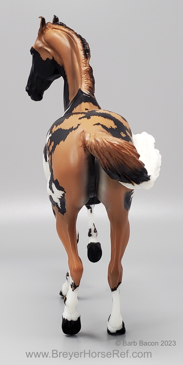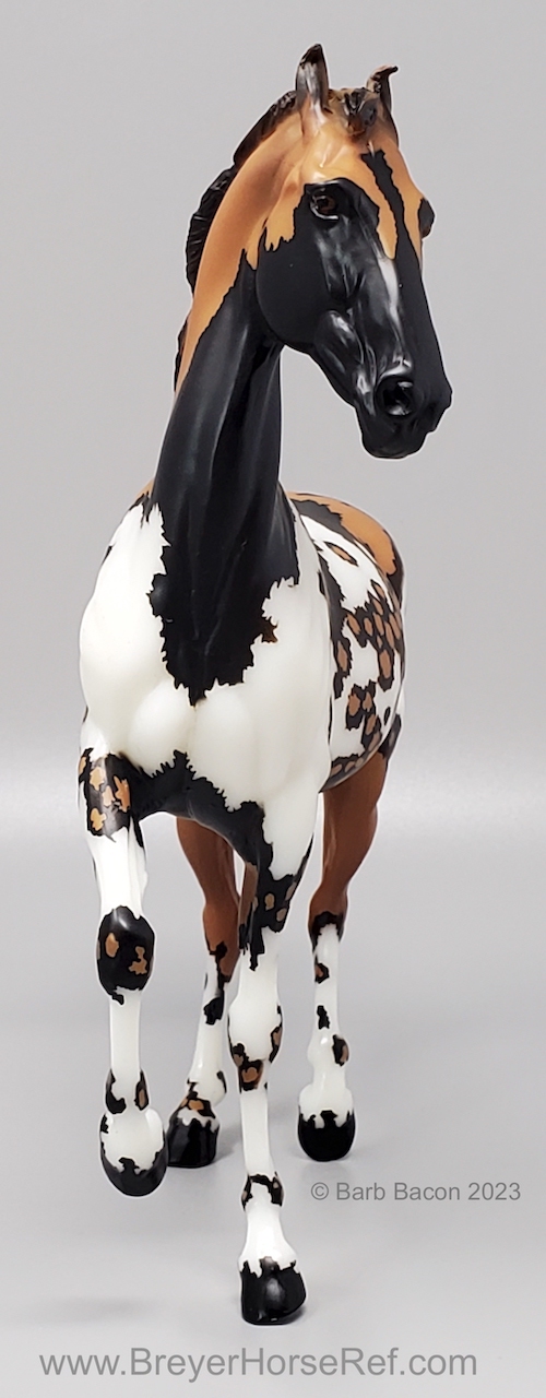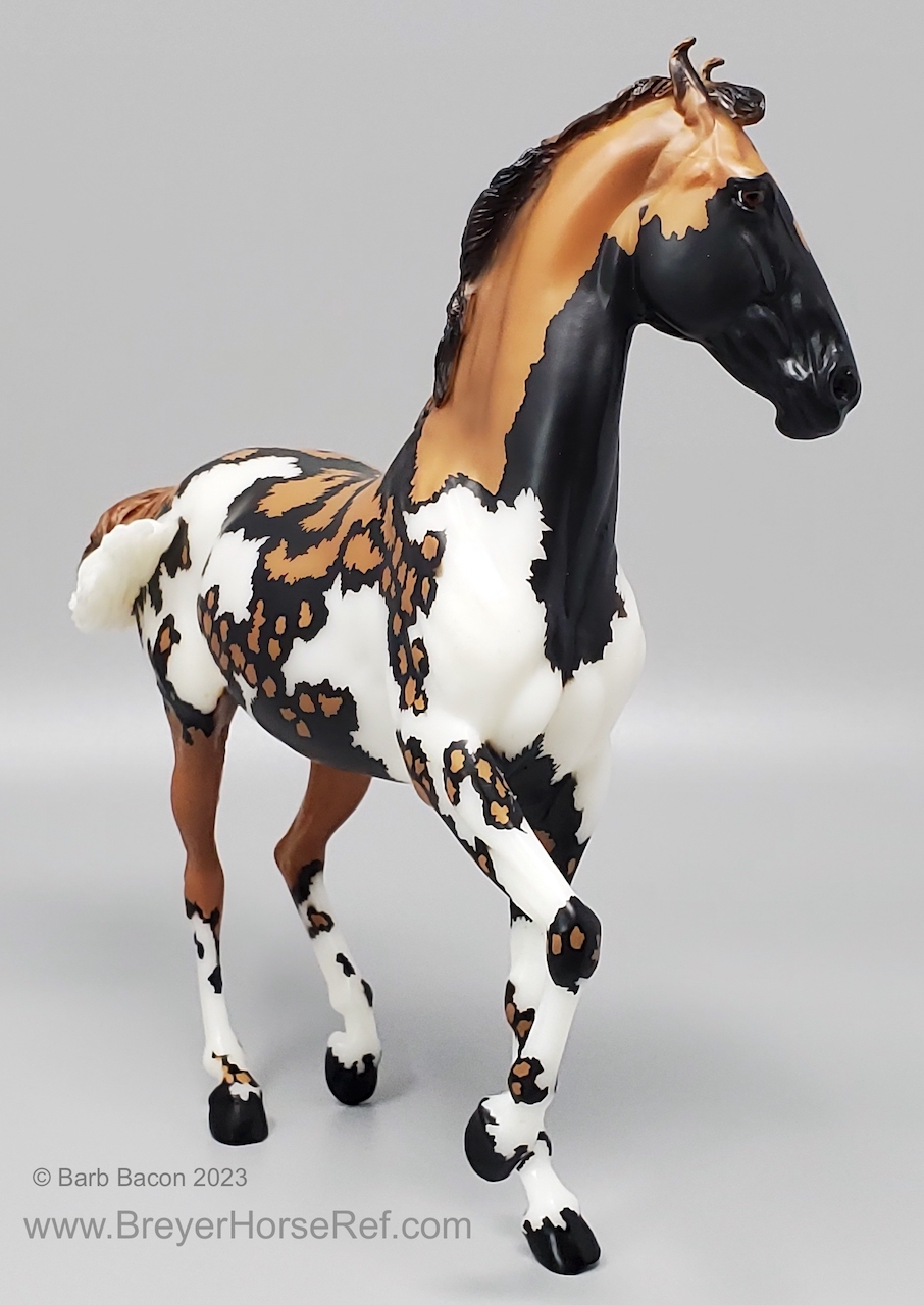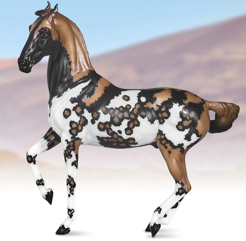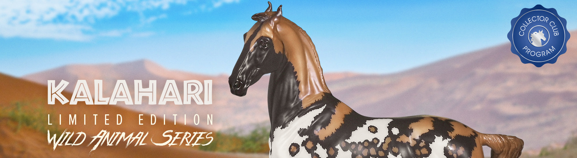 "Kalahari - The 5th Edition in the Breyer Wild Animal Series. The exotic and endangered African Wild Dog can be found in Africa’s grasslands, forests, and deserts - including the Kalahari! Extremely social, these beautiful pack animals are also known as “painted dogs” for their coat’s distinctive appearance. Each African Wild Dog’s coat is completely unique. Artist Lauren Hoeffer creatively reimagined the Marwari as an African Wild Dog. Kalahari sports mottled spotting along his body and legs, with a cape of lighter coloring draping his head and neck. Kalahari’s long legs and athletic appearance will serve him well, as African Wild Dogs can reach speeds of up to 44 mph! Kalahari has "Wild Animals Series, Limited Edition" on his belly. Limited to just 750 pieces and available exclusively to Collector Club members, Kalahari is priced at $195.00." www.breyerhorses.com.