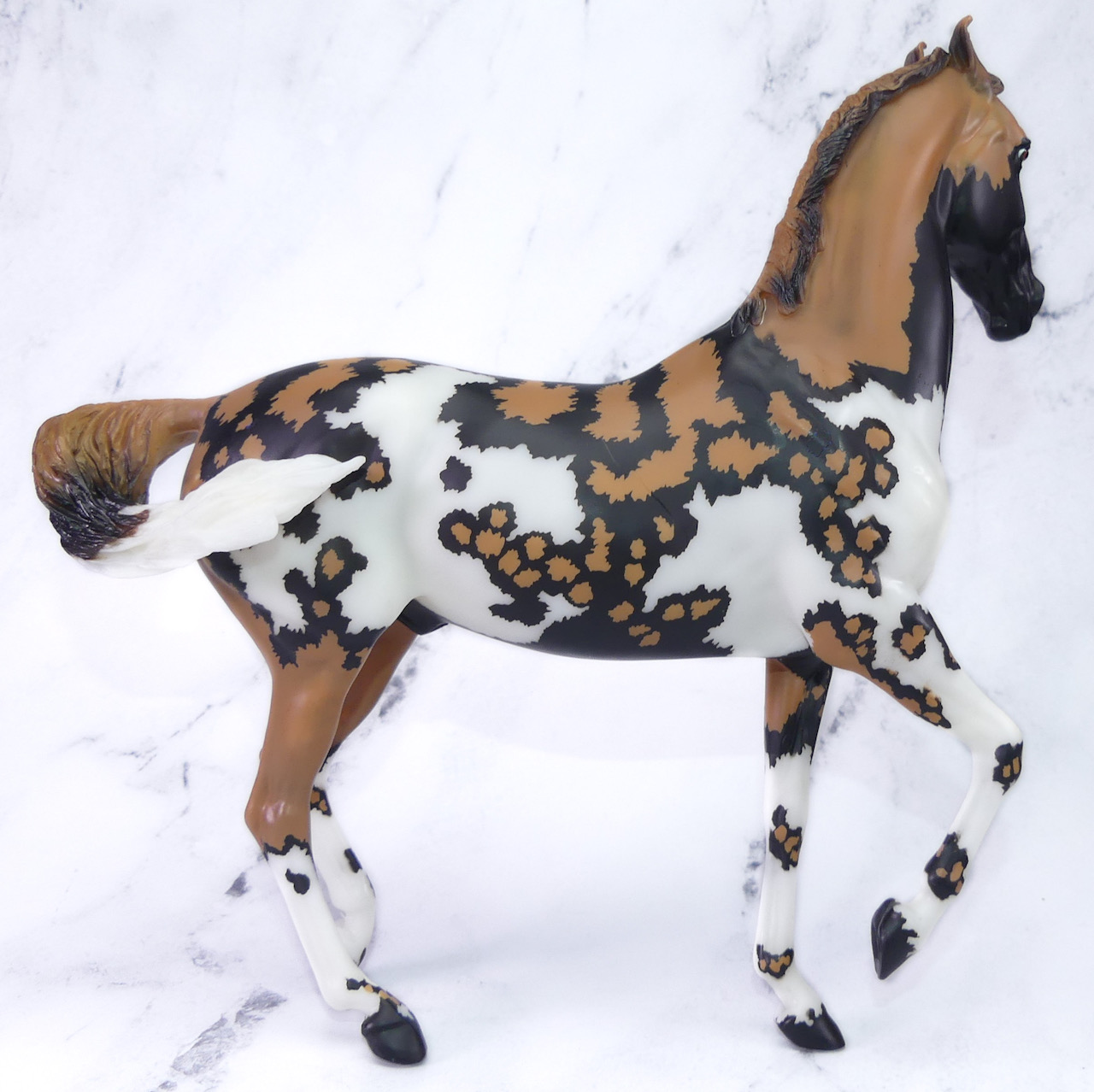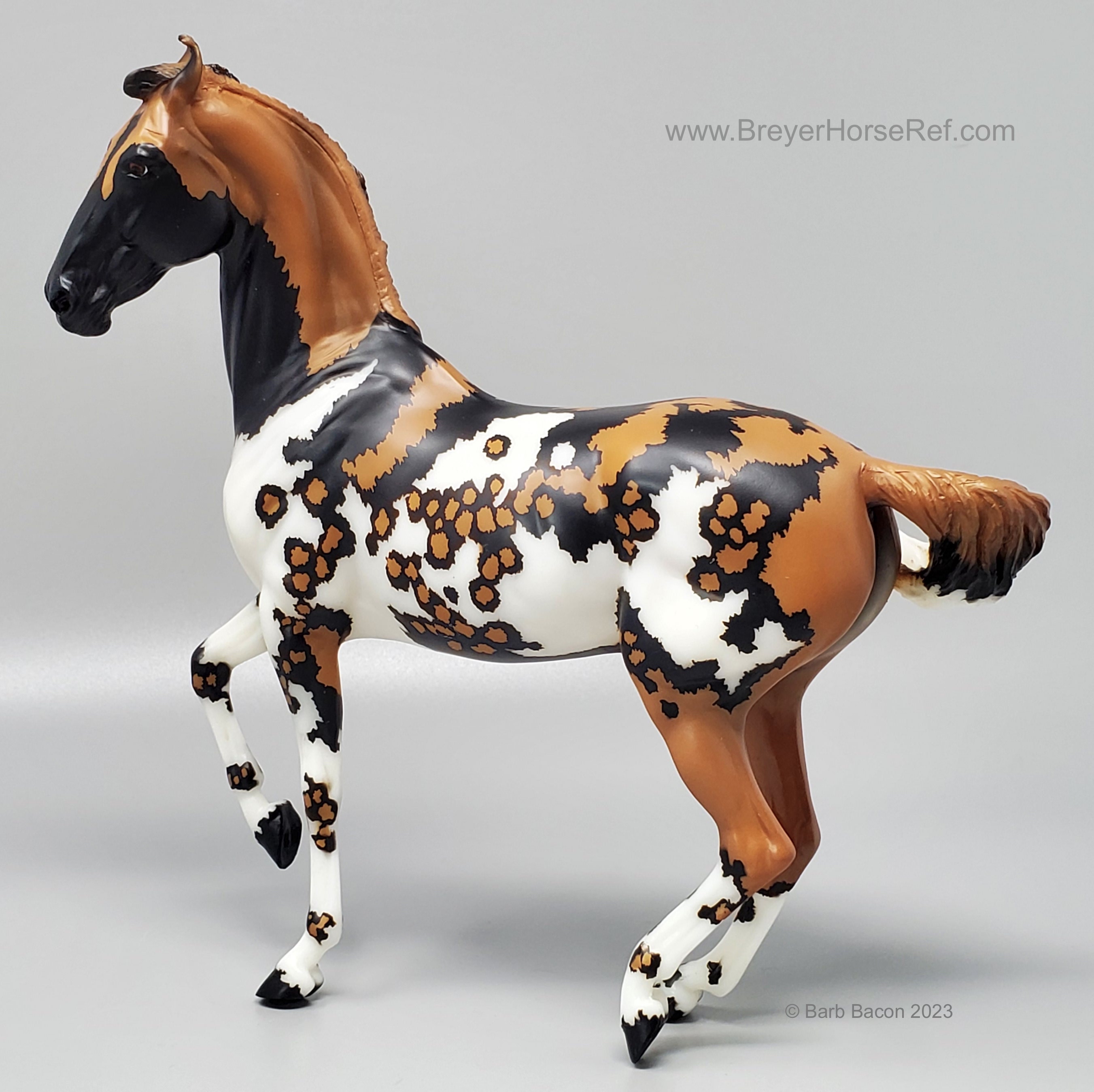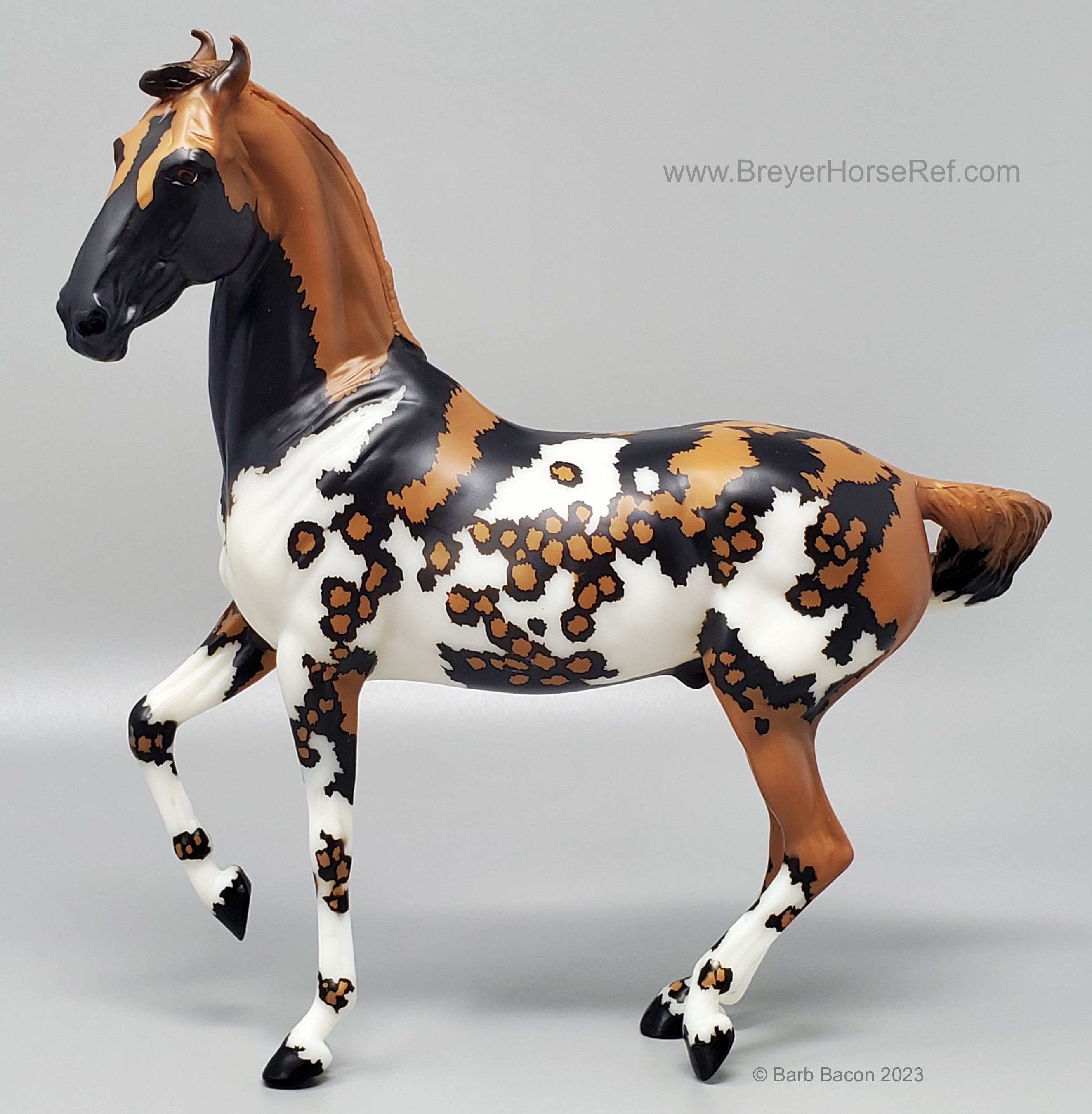 "Kalahari - The 5th Edition in the Breyer Wild Animal Series. The exotic and endangered African Wild Dog can be found in Africa’s grasslands, forests, and deserts - including the Kalahari! Extremely social, these beautiful pack animals are also known as “painted dogs” for their coat’s distinctive appearance. Each African Wild Dog’s coat is completely unique. Artist Lauren Hoeffer creatively reimagined the Marwari as an African Wild Dog. Kalahari sports mottled spotting along his body and legs, with a cape of lighter coloring draping his head and neck. Kalahari’s long legs and athletic appearance will serve him well, as African Wild Dogs can reach speeds of up to 44 mph! Kalahari has "Wild Animals Series, Limited Edition" on his belly. Limited to just 750 pieces and available exclusively to Collector Club members, Kalahari is priced at $195.00." www.breyerhorses.com.