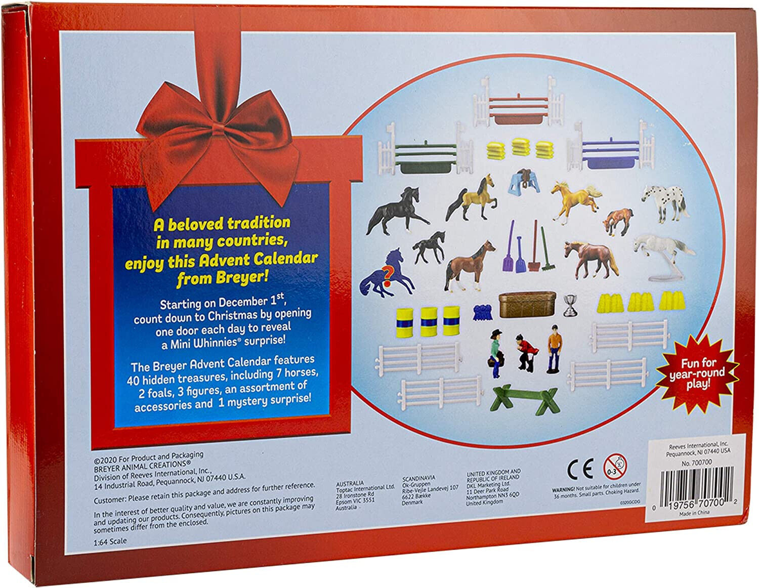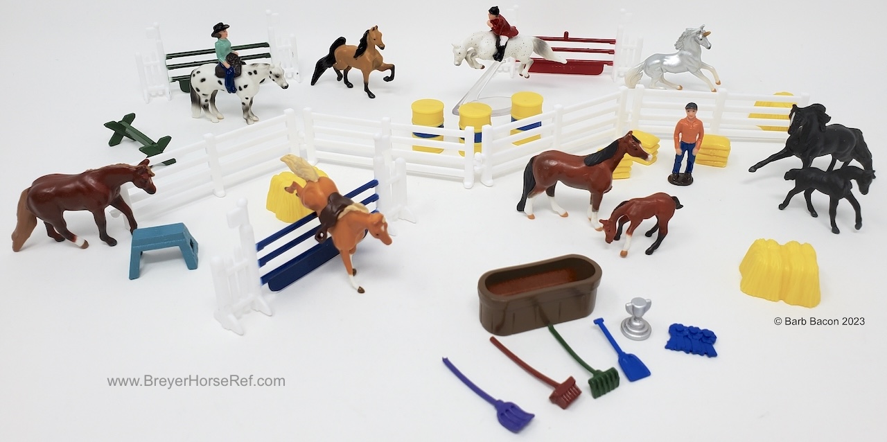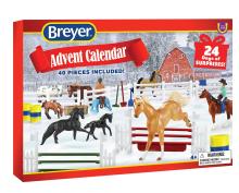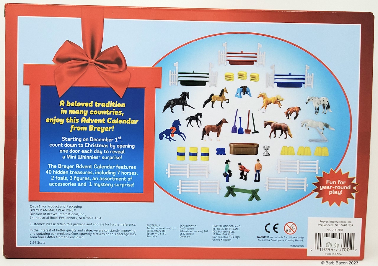 "The holiday tradition of the Advent Calendar gets a Breyer spin! Starting on December 1st, count down to Christmas by opening one door each day to reveal Mini Whinnies item(s)! Features 40 hidden treasures, including 7 horses, 2 foals, 1 unicorn, 3 people figures, and a wide assortment of barn and riding accessories!" www.breyerhorses.com. Set included Firebird, Grazing Foal, High Stepping Saddlebred, Jog Trot QH, Jumping Morgan, Jumping TB, Romping Foal, Standing QH, Standing TB, and Trotting Morgan.