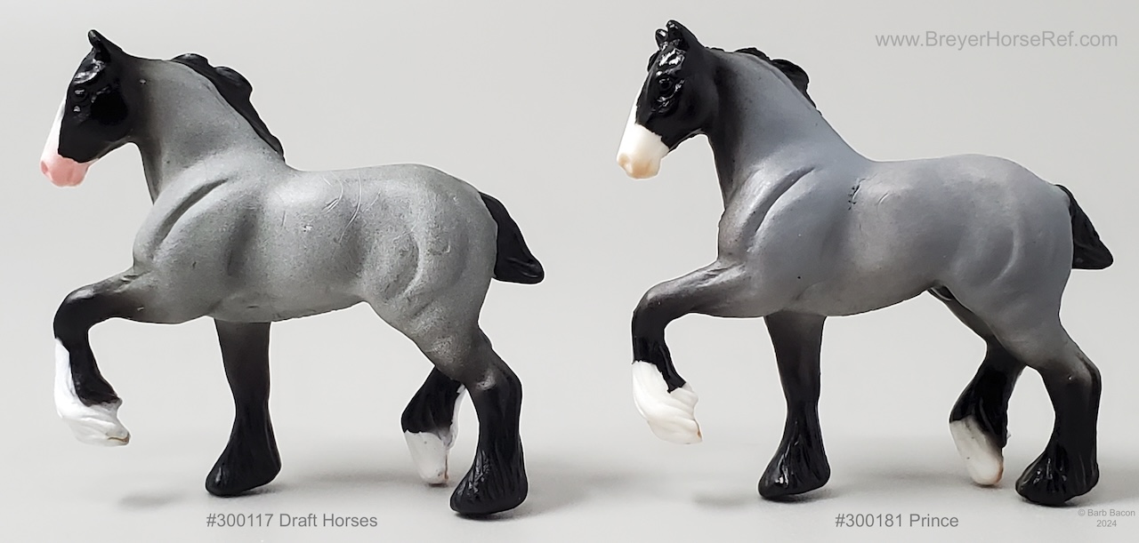 Model #300117 Draft Horses and #300181 Prince have similar color and pattern. The Prince model has unpainted white plastic markings; whereas the other has painted white markings. Body color, hoof and nose colors vary slightly between each model. Individual records created for each of these models as they have different accessories.