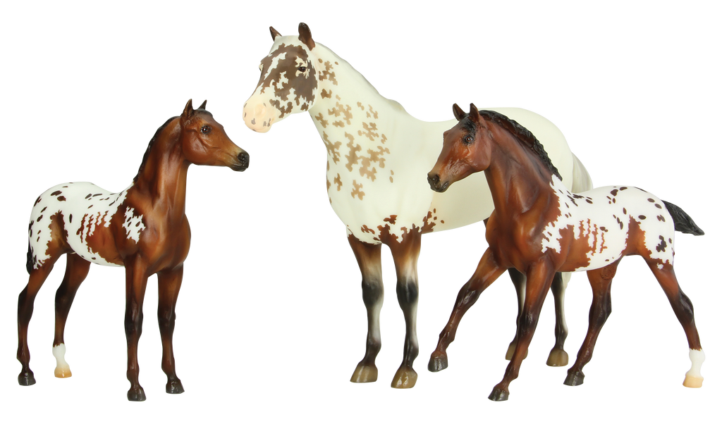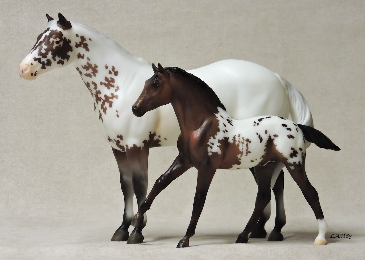 "First manufactured in Surrey, England, the Surrey cart was a doorless, two-axled carriage that was popular in the United States during the late 19th and early 20th centuries. The Surrey offered a variety of top options, from rigid to convertible to fringed, allowing drivers to show off their own particular style. To commemorate these trendy carriages for our celebration of Driving Forward this summer, we’ve done our Surrey & Axle models as a gorgeous few spot leopard appaloosa mare on Lady Phase, mold #40, with a swish tail and an adorable blanket appaloosa foal on the Stock Horse Foal, mold #228, both sculpted by Chris Hess." www.breyerhorses.com.