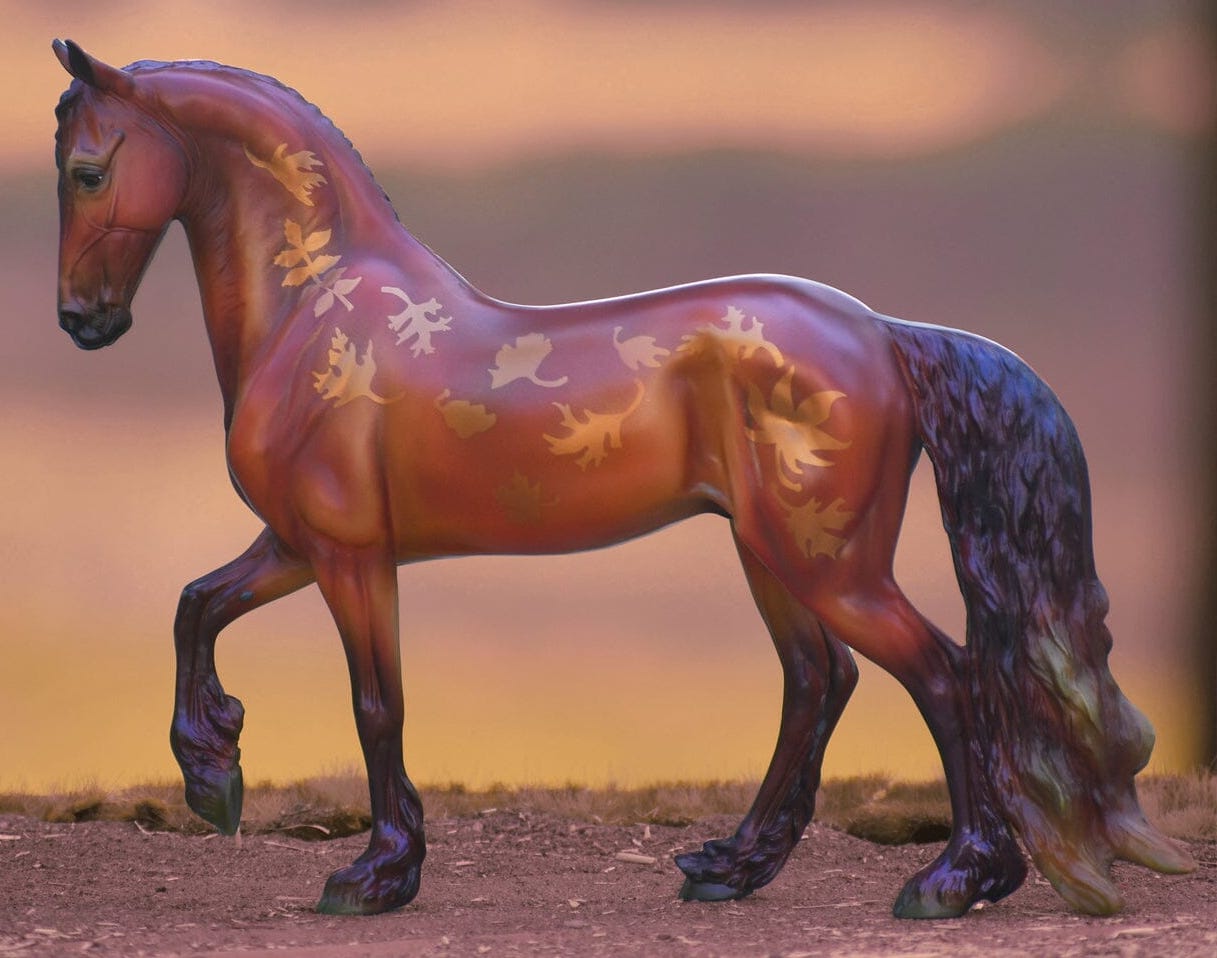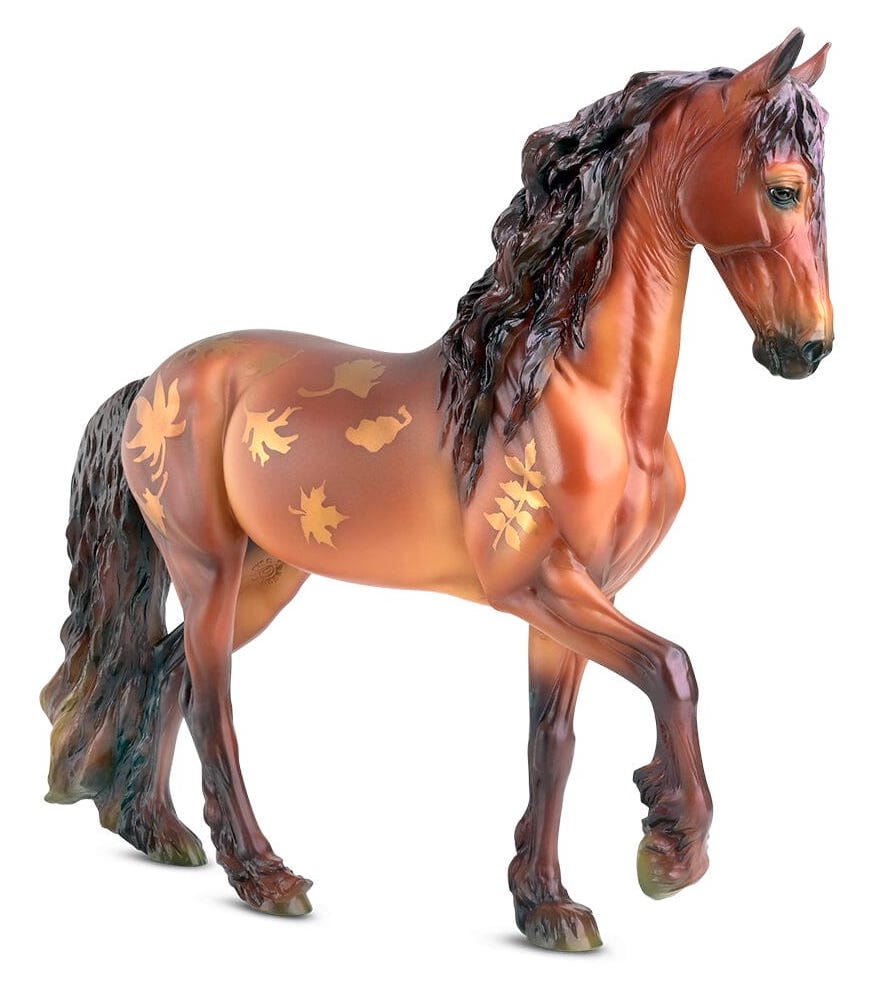 "Leif (#1879) is the Fall Decorator model for 2023. Amidst the dazzling colors of autumn, a quiet and graceful horse takes the road less traveled. Leif blends in perfectly with his surrounding scenery – his coppery coat has hints of gold, red, orange and green, and golden leaves swirl up and over his sides. His baroque-style conformation adds to this majestic stallion’s mystique. Like the leaves themselves, he’ll only be visible for a fleeting moment before dashing away on the brisk winds. Leif celebrates this gorgeous season with his fall hues, and will happily bring a bit of autumn magic to your Breyer stable." www.breyerhorses.com.