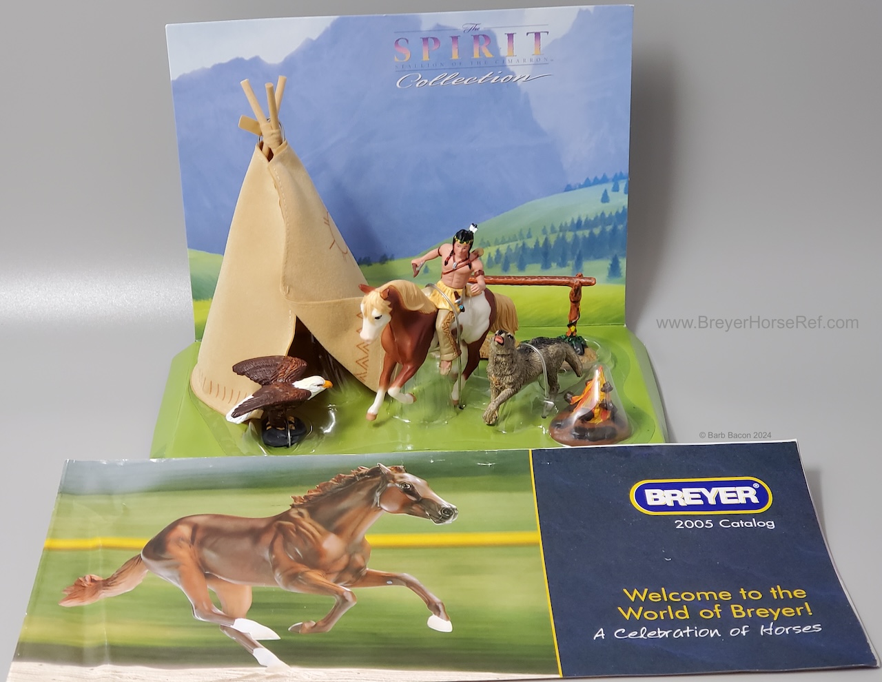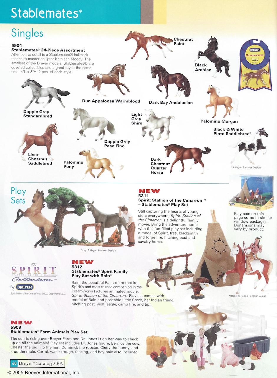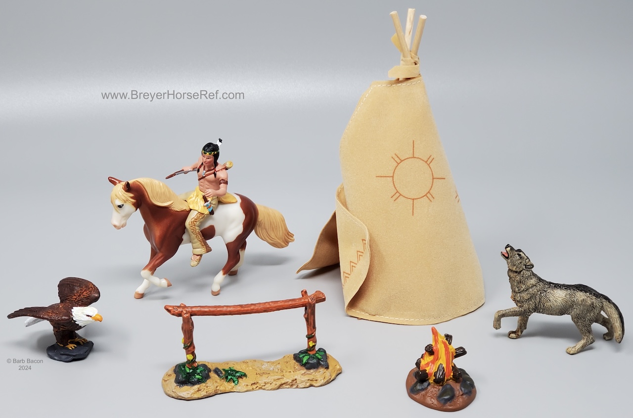 The Spirit Family Play Set with Rain #5312 was originally released with the Morgan Mare in 2005. The Paso Fino replaced the Morgan Mare for 2006-2007 (maybe late 2005 as an early box still has a copyright date of 2005 and included a 2005 catalog). Set included a doll, wolf, eagle, hitching post, camp fire, and tipi. On the 2007 Retired List.