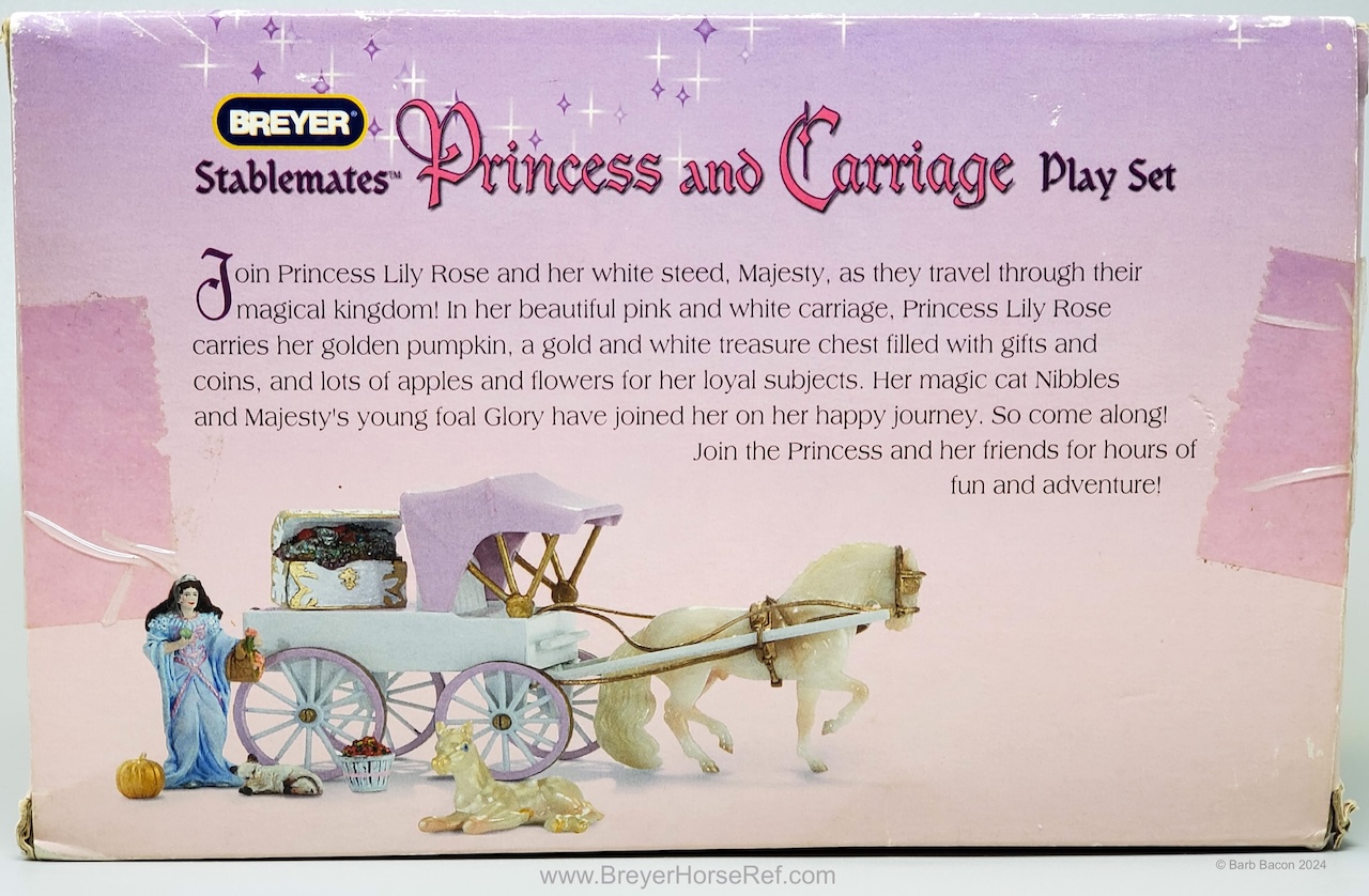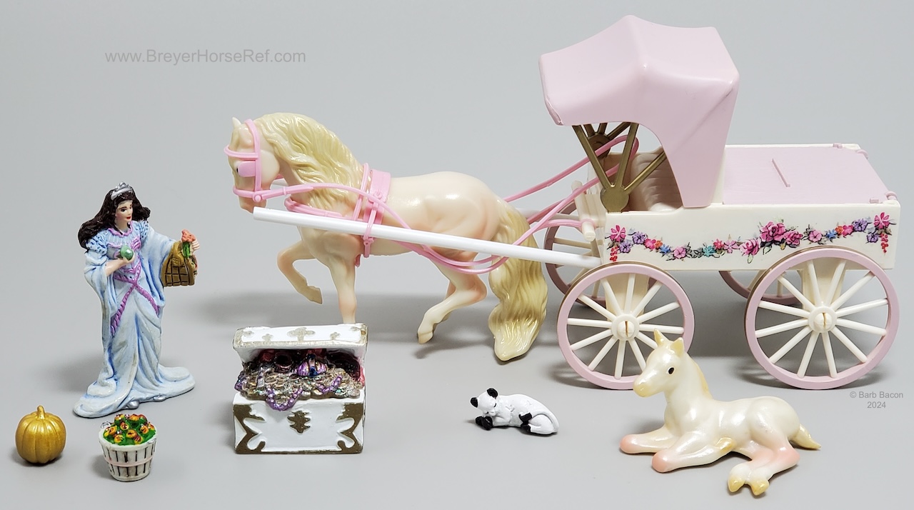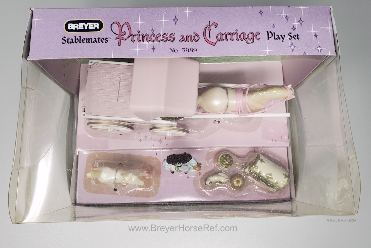 The Princess and Carriage Play Set #5989 was released 2005-2006. Set included an Andalusian and either the Trotting Foal or the TB Lying Foal, a carriage with plastic harness, princess doll, Sitting Cat, gold pumpkin and basket of apples. The carriage does have a Copyright Stamp date of 2003 because of previous wagon sets. It is estimated the TB Lying Foal was replaced by the Trotting Foal for 2006 sets. On the 2006 Retired List.