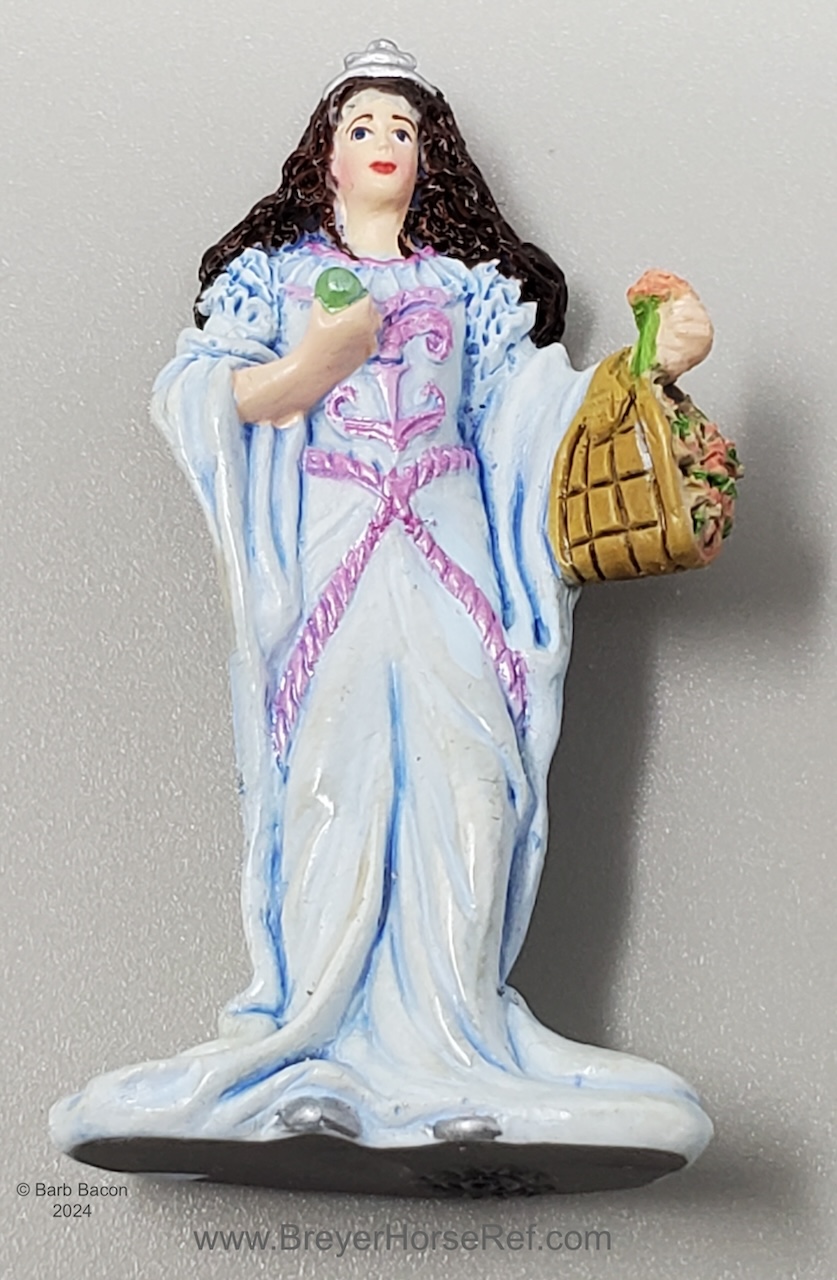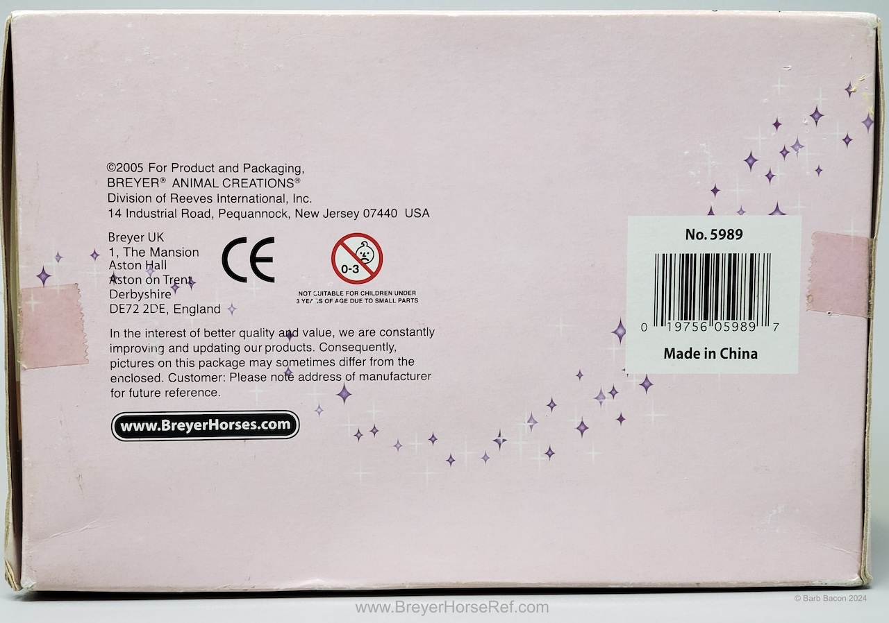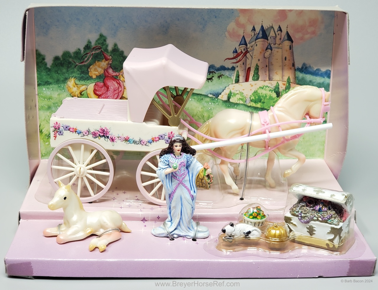 The Princess and Carriage Play Set #5989 was released 2005-2006. Set included an Andalusian and either the Trotting Foal or the TB Lying Foal, a carriage with plastic harness, princess doll, Sitting Cat, gold pumpkin and basket of apples. The carriage does have a Copyright Stamp date of 2003 because of previous wagon sets. It is estimated the TB Lying Foal was replaced by the Trotting Foal for 2006 sets. On the 2006 Retired List.