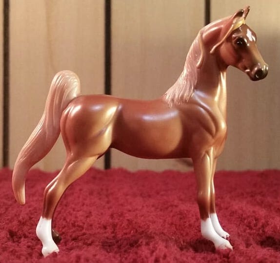 Chestnut with flaxen mane and tail, has a yellow ribbon and three socks, with no sock on back left leg. On the 2010 Retired List.