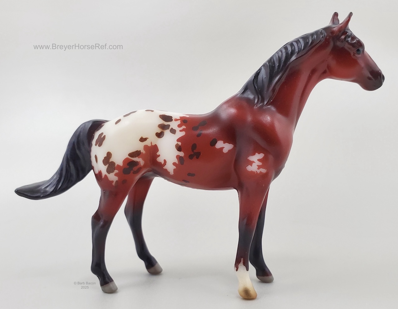 "The Third Release in the 2025 Stablemates Club! Appaloosa Sport Horses combine the iconic, spotted coats of the Appaloosa with the sleek athleticism of Thoroughbreds and warmblood - the result is a stunning sporthorse that stands out in the show ring. Our third release of the 2025 Stablemates Club, Spencer, is a beautiful bay blanket Appaloosa Sport Horse designed by artist Sommer Prosser. He brings a fresh coat of paint to one of our original 1975 Stablemates sculptures, Silky Sullivan (mold #5022), in his first appearance since 2005!" www.breyerhorses.com.