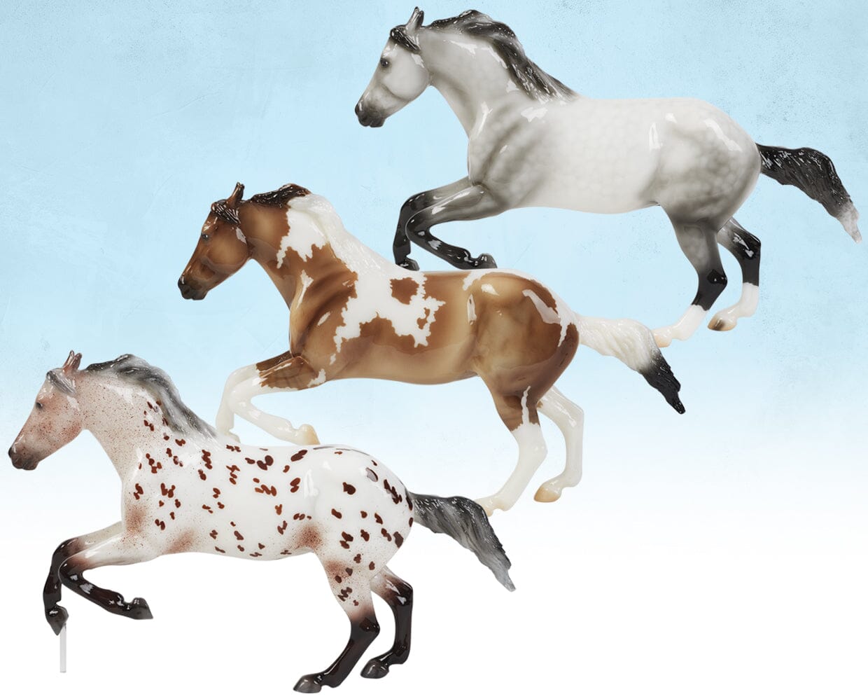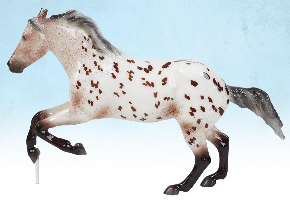 "Stock horses are incredibly versatile – they can excel at multiple disciplines of both the English and Western variety. Speed events are especially popular in the Western world, and Rambler is ready to dash to the finish line or complete the catch in record time. Rambler is our 2025 Freedom Series (1:12 scale) gambler’s choice model, created on the Wahoo King mold (#466) and available exclusively to Breyer Collector Club members. Rambler’s three coat colors represent the three most popular breeds of stock horses: the Appaloosa, the Paint Horse, and the Quarter Horse: