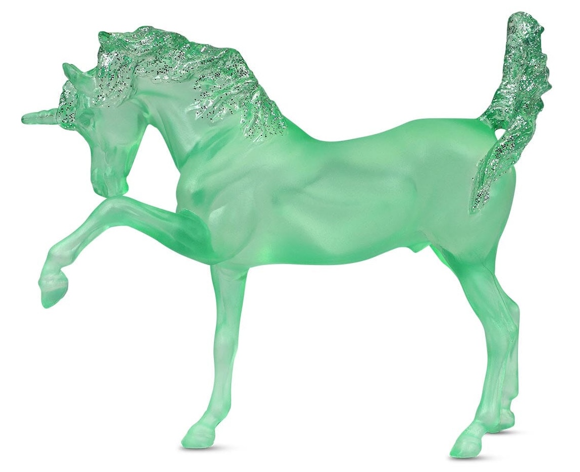This lovely set includes four translucent unicorns - blue, green, pink, and purple - designed to look like sea glass, each with a touch of glitter on its mane and tail." www.breyerhorses.com. Mid Year Release - Available at Retailers and the Breyer Website. Pictured in the 2025 Holiday Catalog.