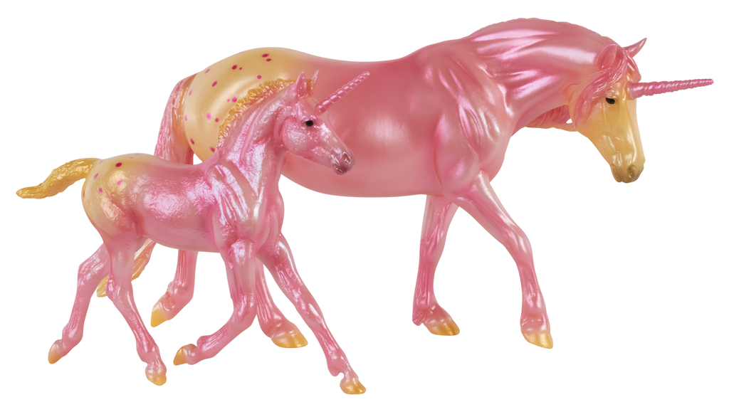 "Candy Delights Unicorn & Foal Set - Cotton Sprinkle and her foal Sugar Puff are inspired by the fun colors of strawberry lemonade." www.breyerhorses.com.