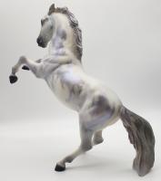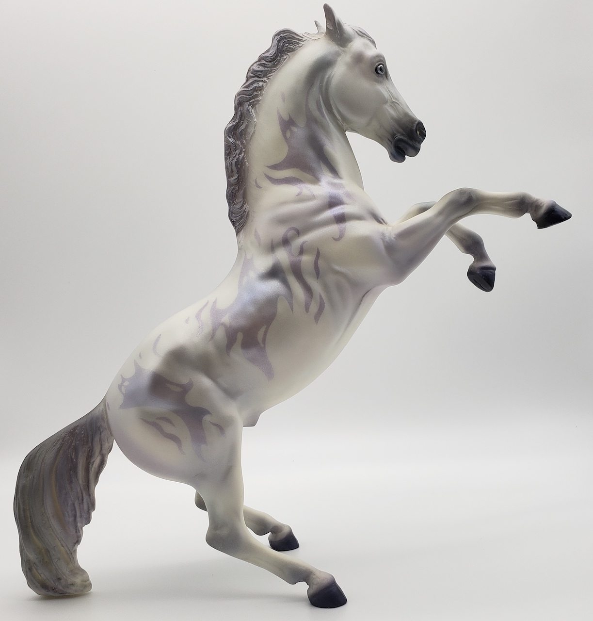 "Breyer's 2008 VIP Collector Event, the Velvet Rope Event, was held just a few short weeks before Halloween, and featured a few spooky Special Run models. One of these models was Spirit of Hallowed Eve, a Fighting Stallion decorated with ghostly ghouls atop his pale coat. He is pictured with a test run Mustang in the same color - the Fighting Stallion was the winner in the battle of who would become the final production model!" www.breyerhorses.com. Breyer Velvet Rope Event 2008 Stamp on belly.