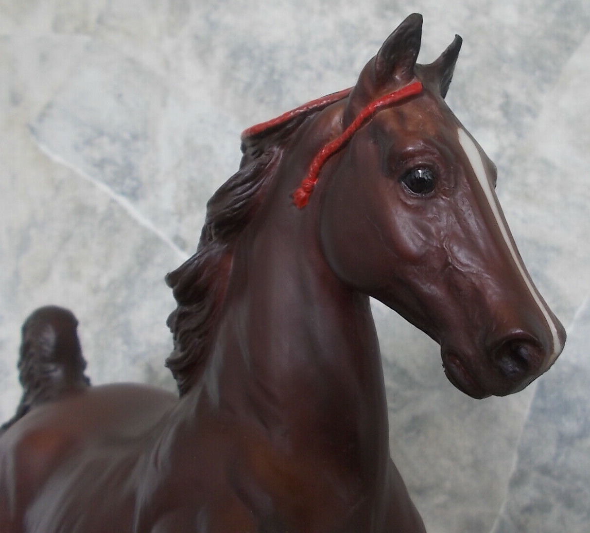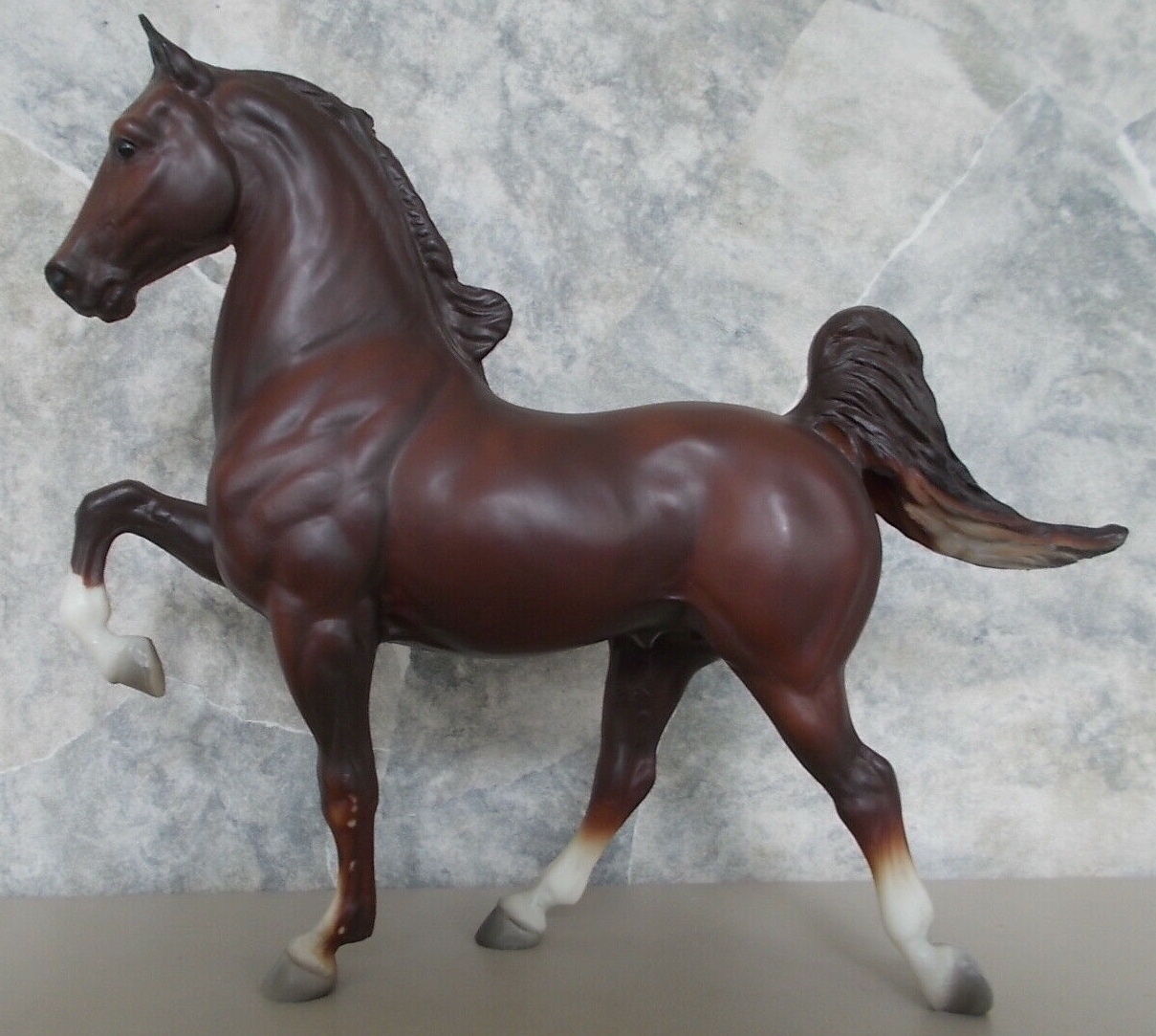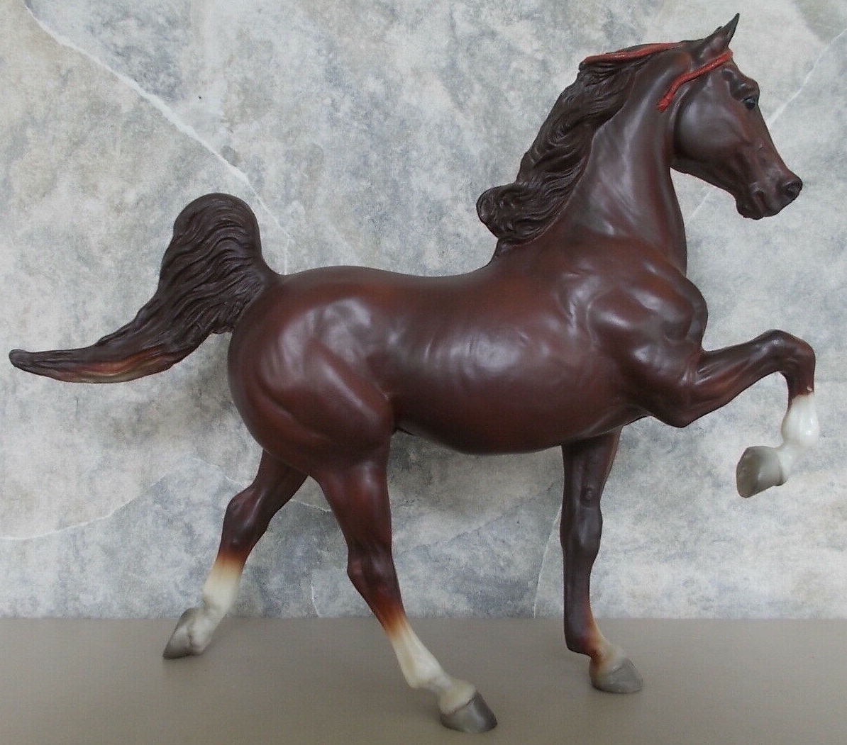 Based on the real horse 'Wing Commander'. Dark chestnut with three socks, and one partial/full 4th sock, grey hooves, blaze and solid red mane ribbon. The model #904 CH Imperator is a portrait of the grandson of Wing Commander.