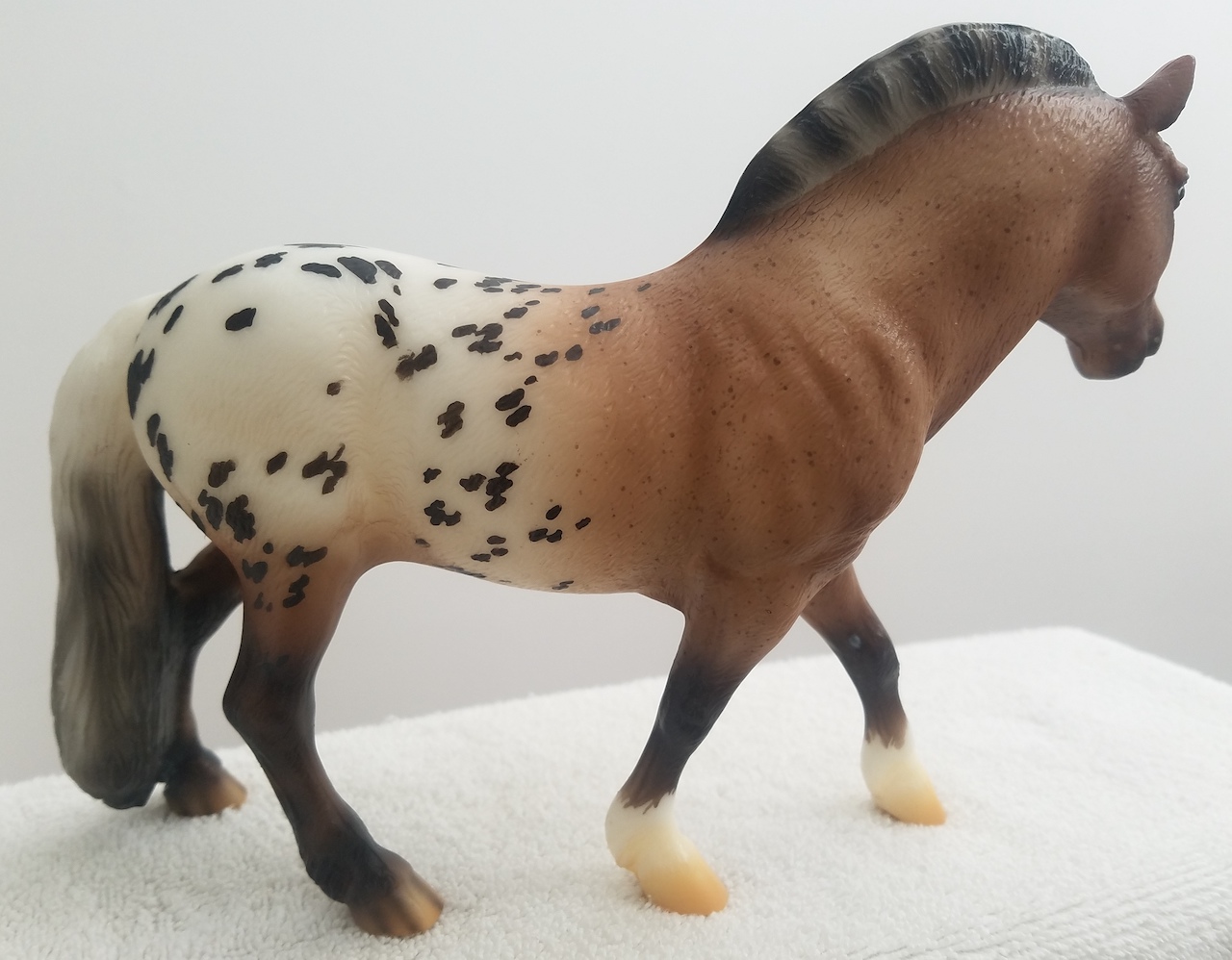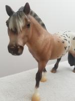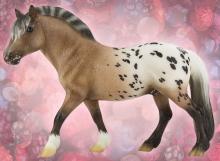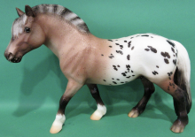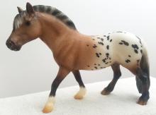 "Protective and medicinal, the Goji berry is quickly becoming popular outside its native Asia, where it has been used to improve health for thousands of years. A member of the nightshade family, they taste a bit like a sweet tomato. This sturdy Fjord cross is strong and willing to help carry new friends across the toughest terrain. Goji is not overly sweet, but is always ready and willing to help when asked. Sommer Prosser designed Goji’s unique shaded bay varnish roan blanket appaloosa coat." www.breyerhorses.com. Goji 2019 Stamp on belly.
