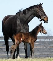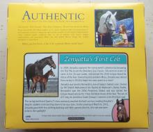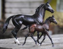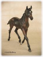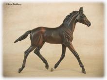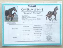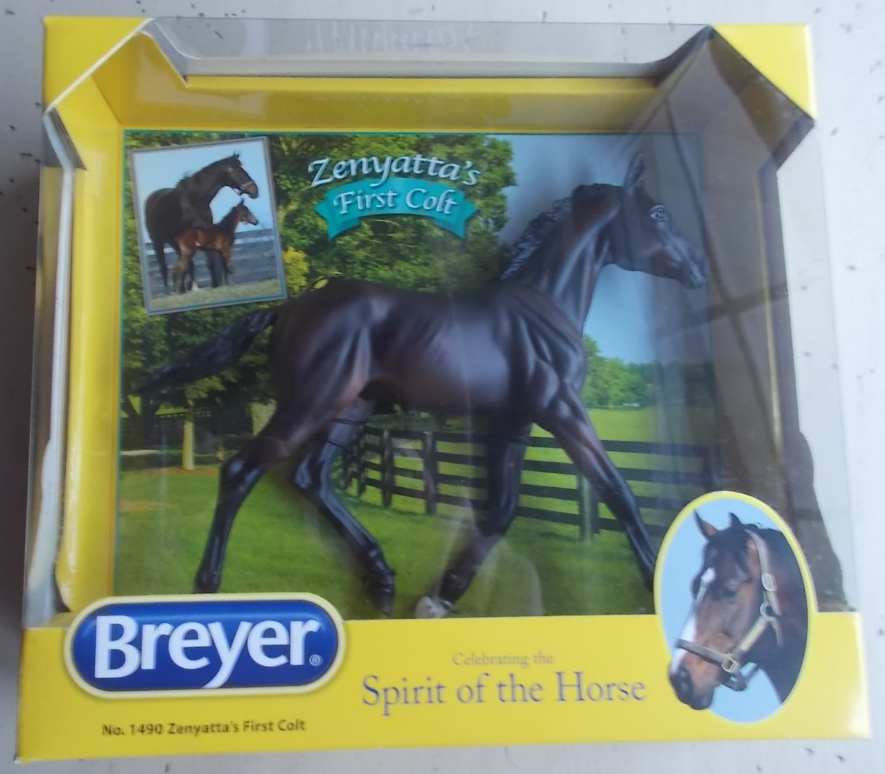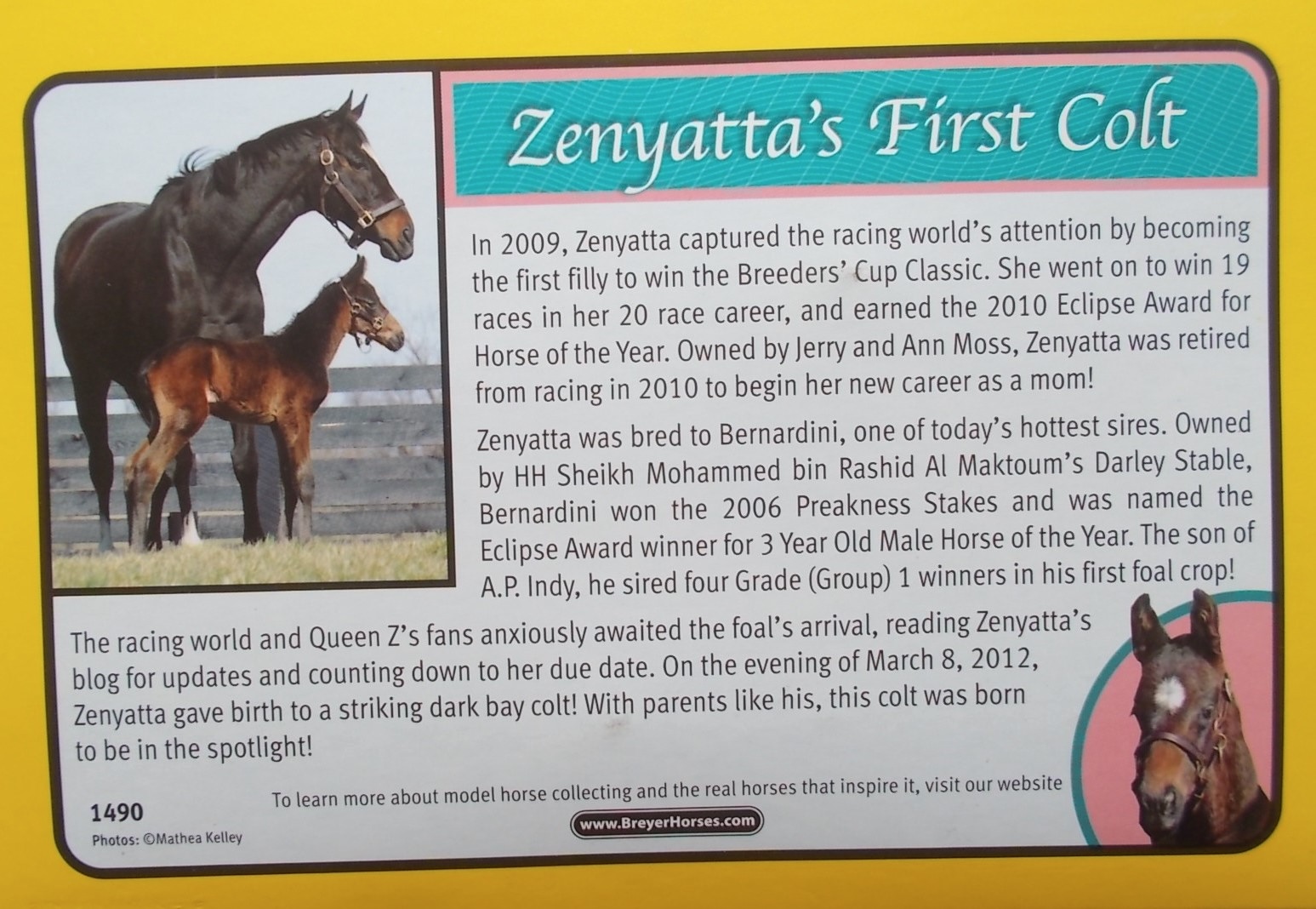 "The racing world and Queen Z’s fans anxiously awaited the foal’s arrival, reading Zenyatta’s blog for updates and counting down to her due date. On the evening of March 8, 2012, Zenyatta gave birth to a striking dark bay colt. Unfortunately, Cozmic One's racing career was less than stellar, only earning $5,770 in five starts. However, he has now moved on to a new job: public ambassador! "Coz" has been retrained under saddle as a show jumper by Isabela de Sousa of De Sousa Stables as part of the Retired Racehorse Project, an equine movement dedicated to giving off-the-track Thoroughbreds a second career after their racing days come to an end. Isabela and Coz placed 5th out of 97 entries in the show jumping division at RRP's annual "Thoroughbred Makeover" challenge in 2018!. It's safe to say that this isn't the last we'll see of Cozmic One, his career is only just beginning. Cozmic One was released by Breyer as "Zenyatta's First Colt" in 2013, before the real foal even had an official name." www.breyerhorses.com.