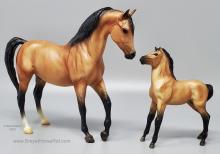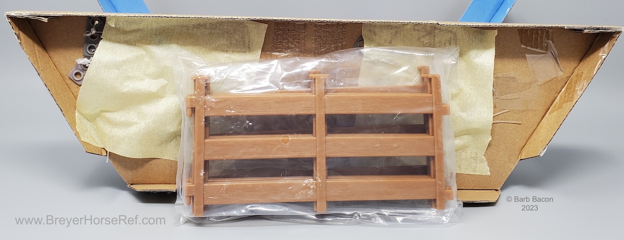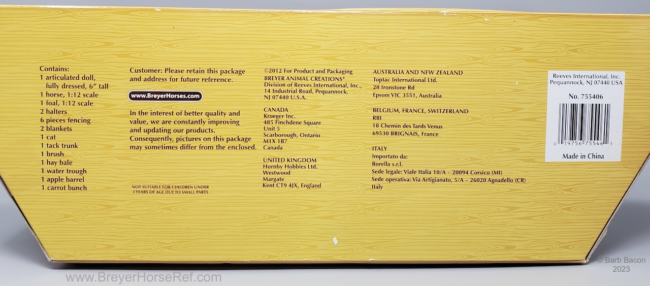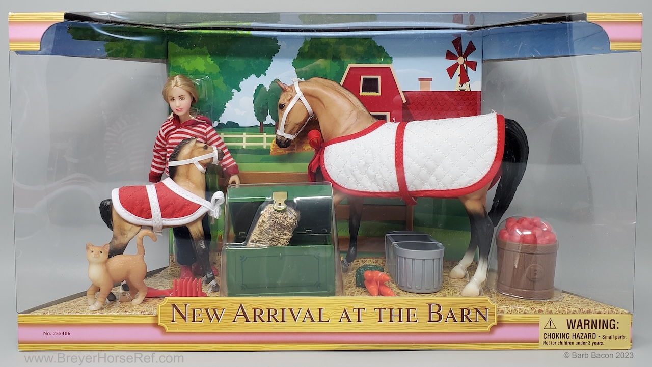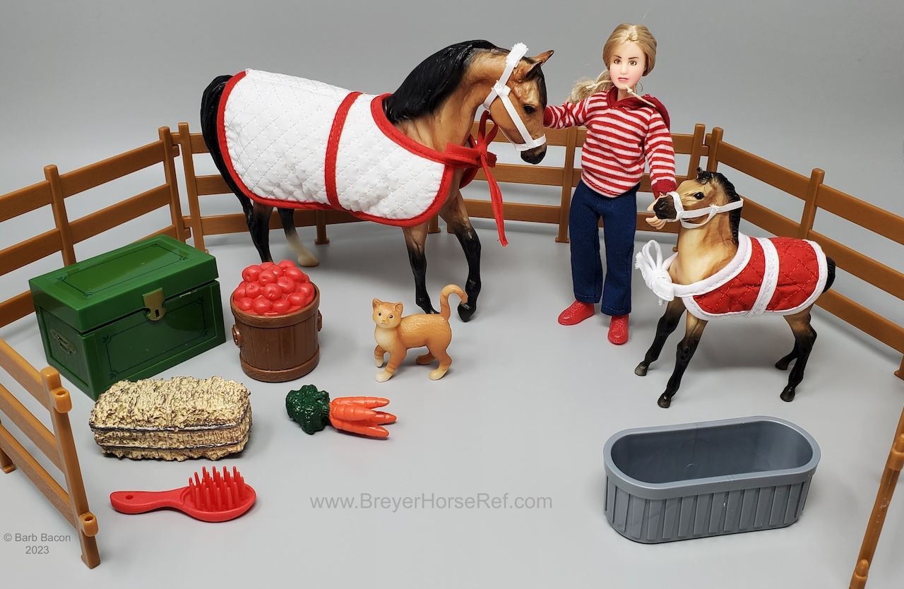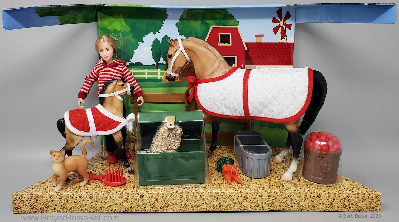 Included Johar, Mesteño the Foal, Silver Tabby, doll, 2 halters, 2 blankets, 6 pieces of fencing, water trough, tack trunk, apple barrel, 1 carrot bunch, hay bale and brush.