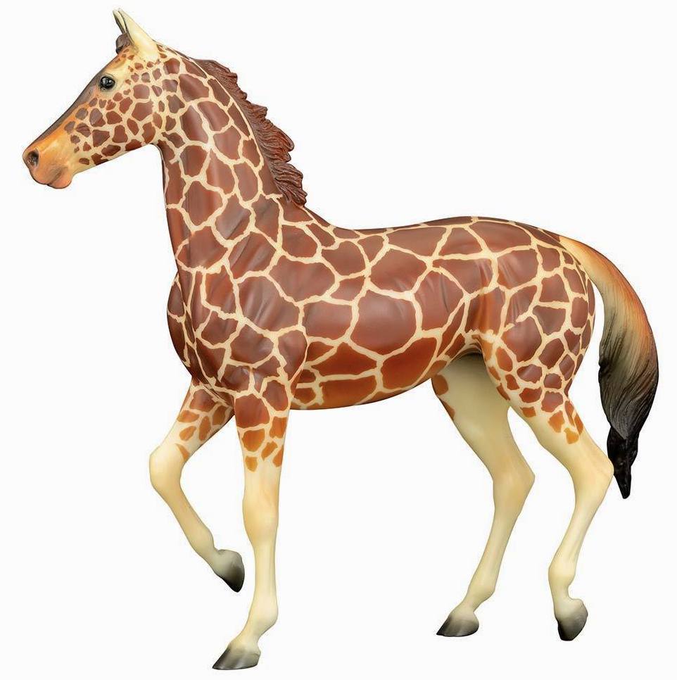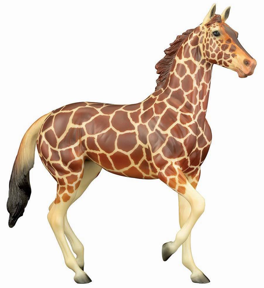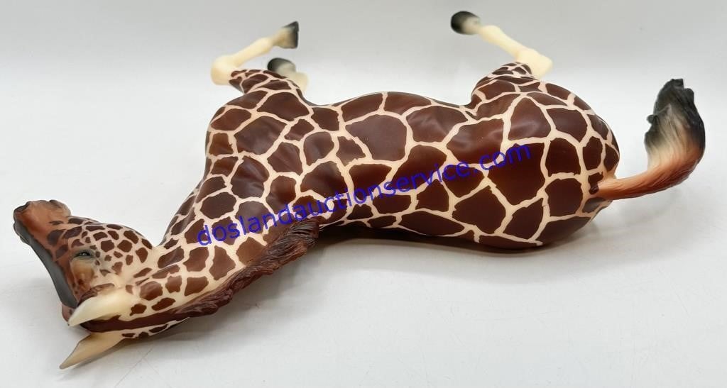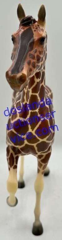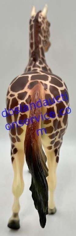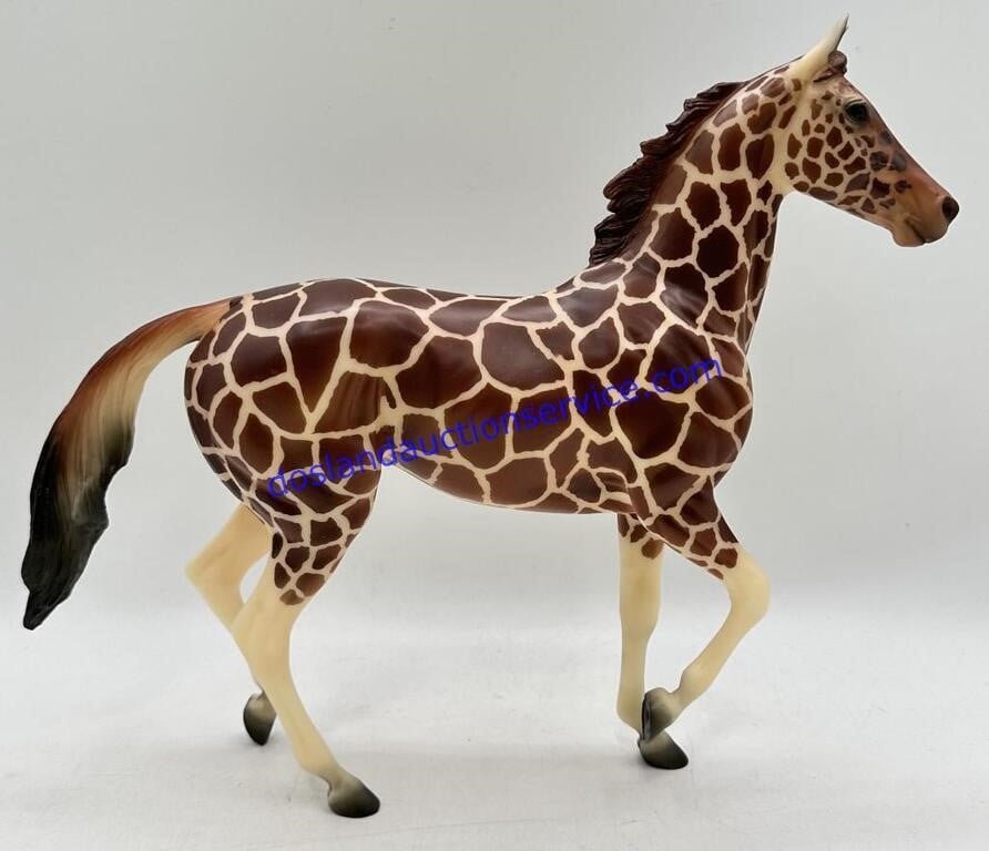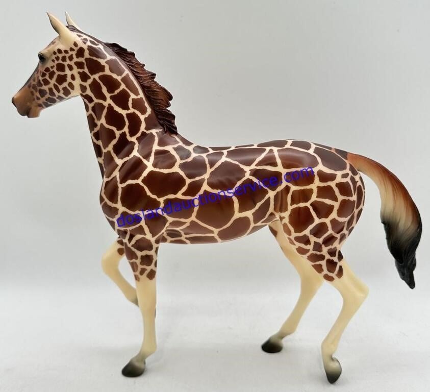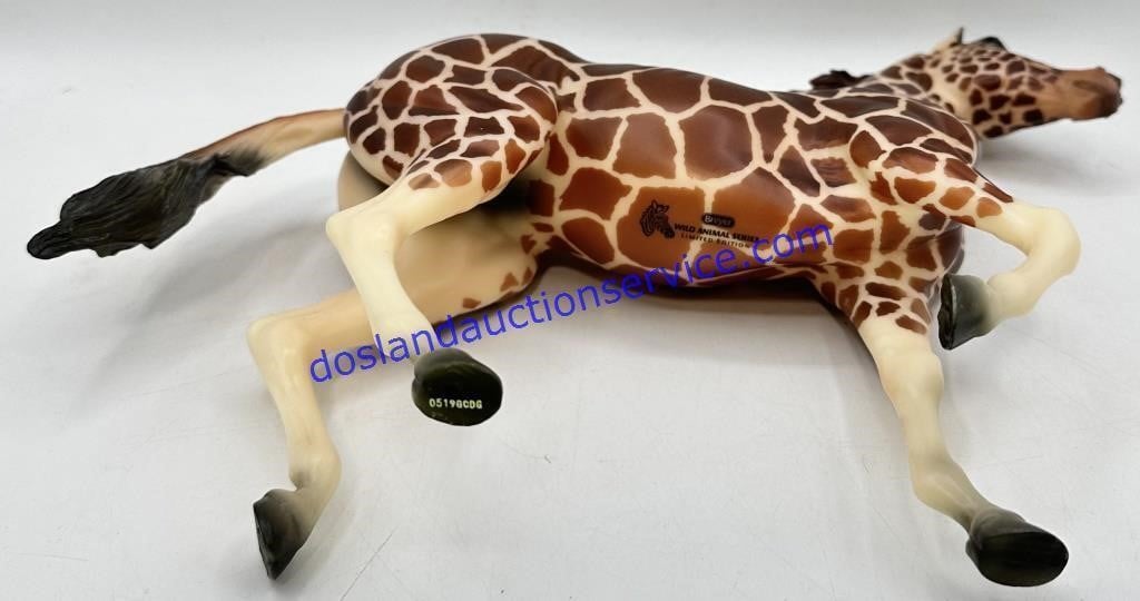 "The Second Edition in the Wild Animal Series. Artist Karen Williams brings one of Africa’s most beautiful creatures to life – the reticulated giraffe! They call the African savanna home, and their unique orange-brown patches and creamy white basecoat help to camouflage them with their surroundings. Nadifa’s upright head carriage, alert expression, and long legs help to evoke the spirit of the giraffe. Her coat features reticulated giraffe spotting that gently fades to the soft cream color of her legs, and a giraffe-inspired tail." www.breyerhorses.com. 'Wild Animal Series Limited Edition' Stamp on belly. This run is modified as a Mare.