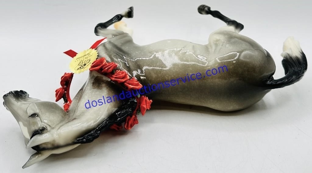 30 of these models were available as centerpieces and came with a silk rose wreath and tag. These models were a lighter dapple grey; whereas there were 61 models made for volunteers that were a darker dapple grey, and did not come with a wreath.