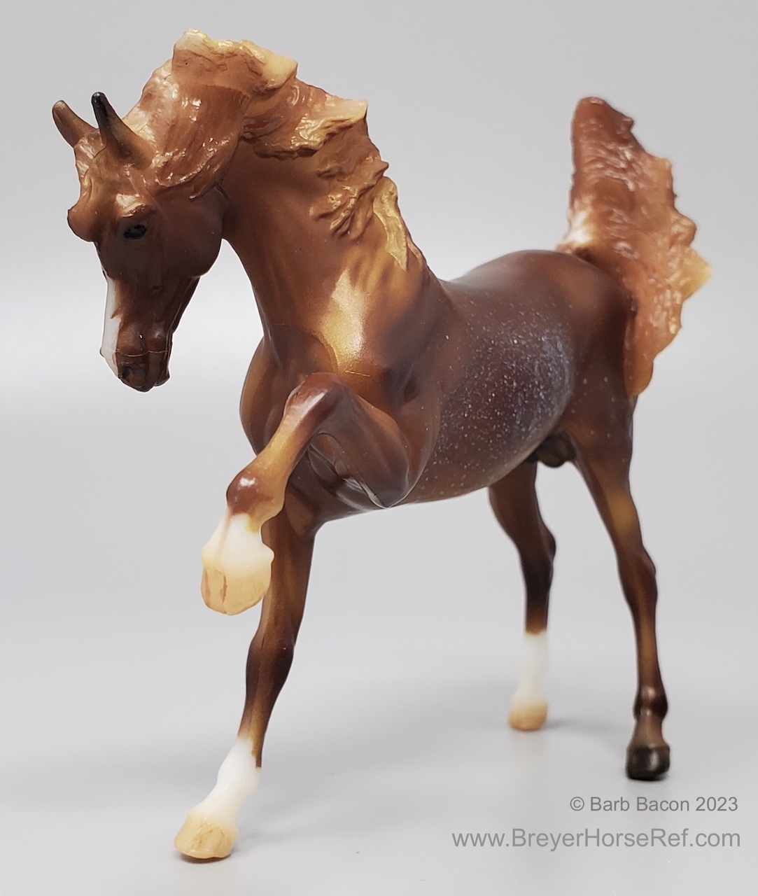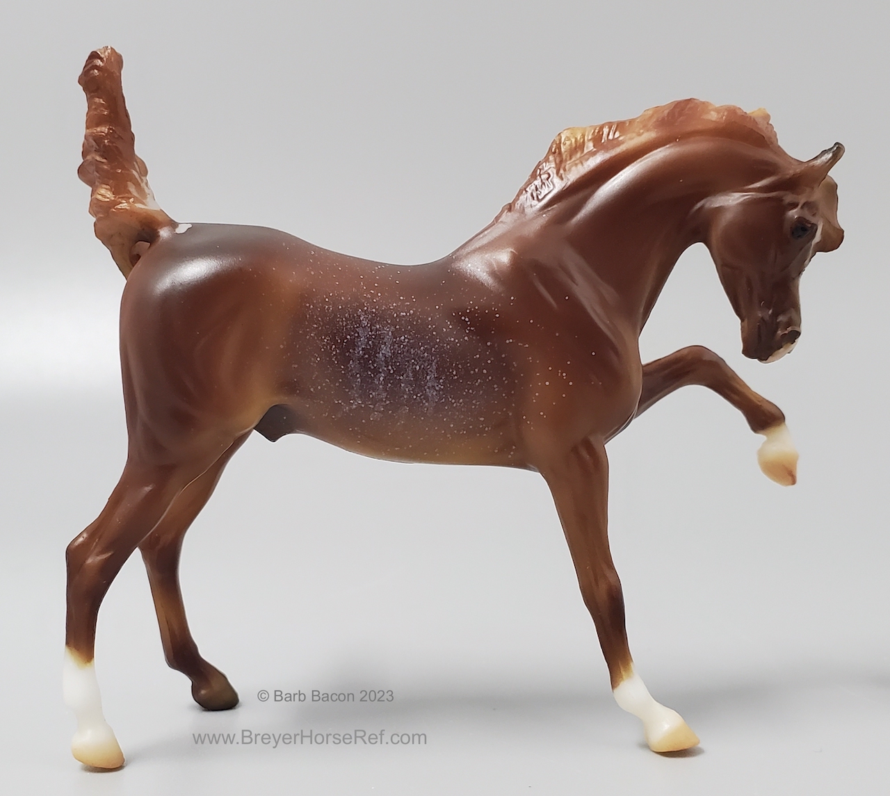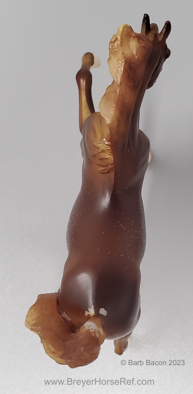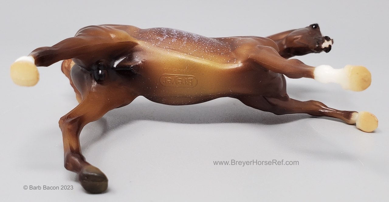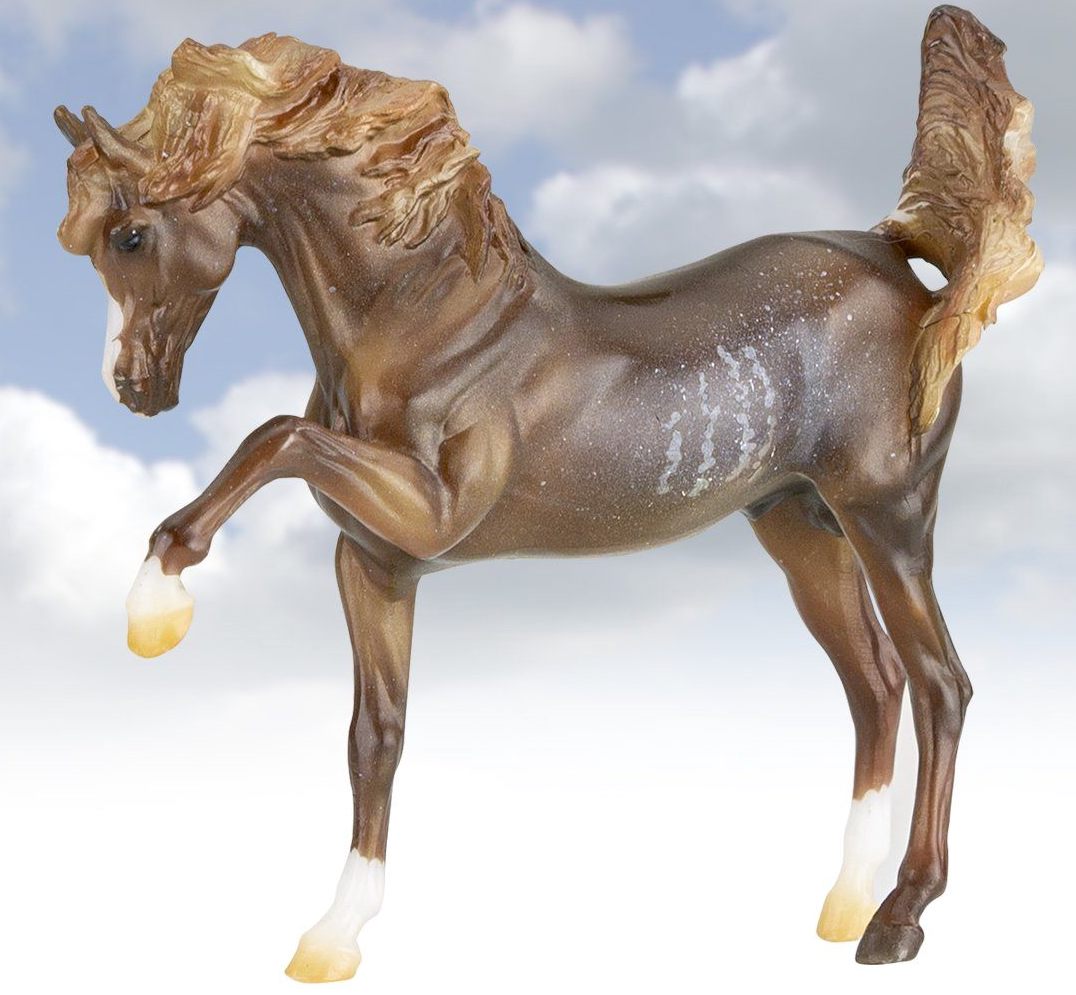 "The Sixth Release in the 2021 Stablemates Club. The newest addition to the lineup of Stablemates sculptures is an exquisite Arabian stallion sculpted by German artist Brigitte Eberl! Twist is painted as a Chestnut Rabicano. This unique pattern is especially prized in the Arabian world. Although similar to roan, rabicano produces flecks of white only on certain parts of the horse’s body, usually around the flank and tail. Twist also sports unique “ribbing” in his coat. Twist comes packaged in a mini hatbox." www.breyerhorses.com. These models were made from the heavier Cellulose Acetate plastic.