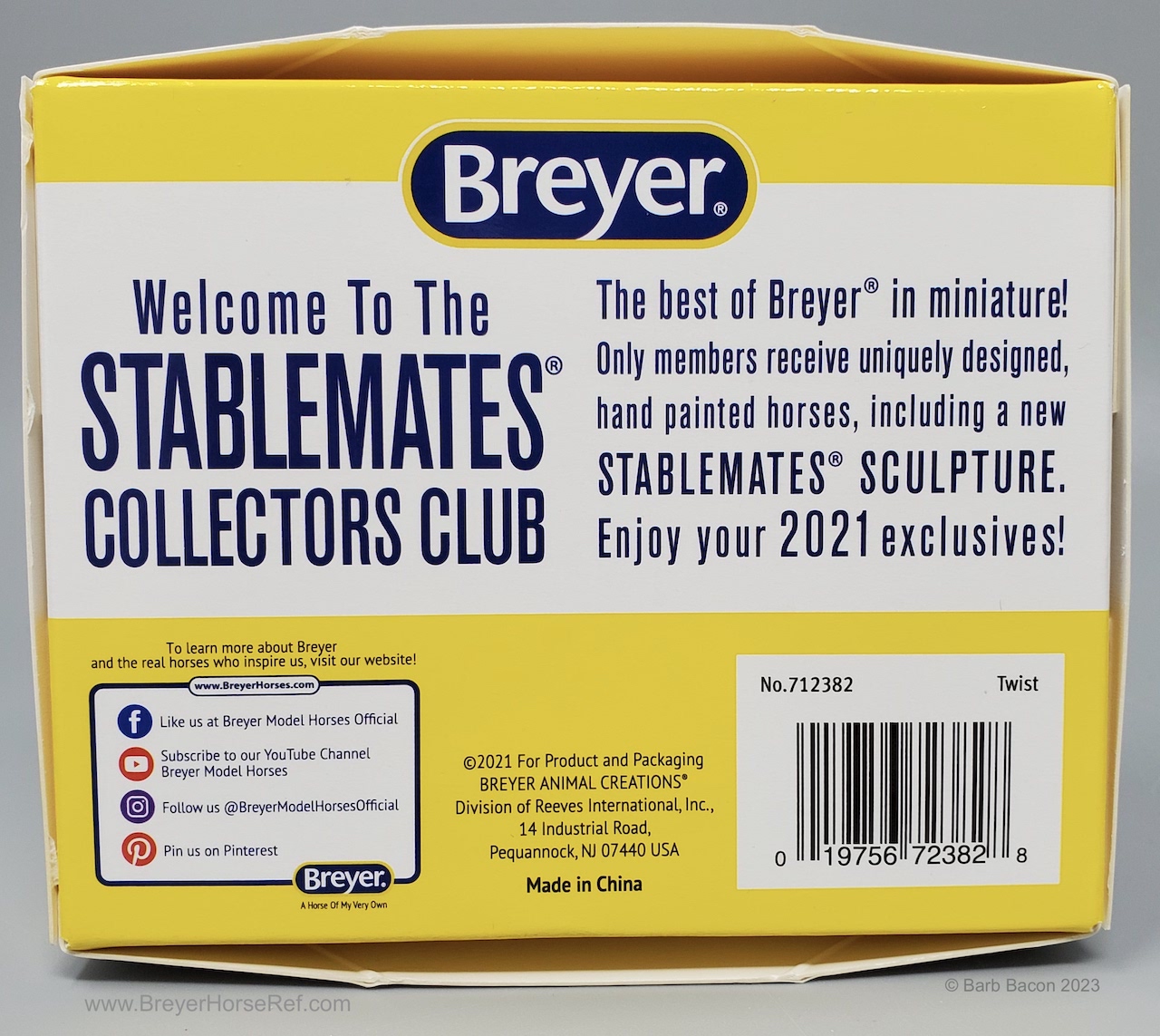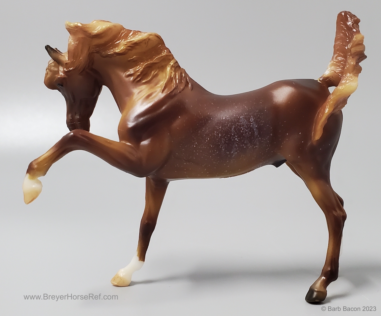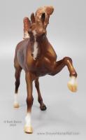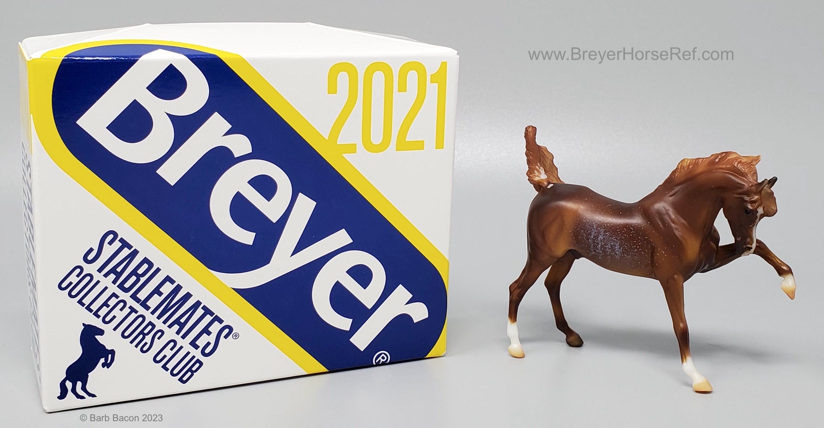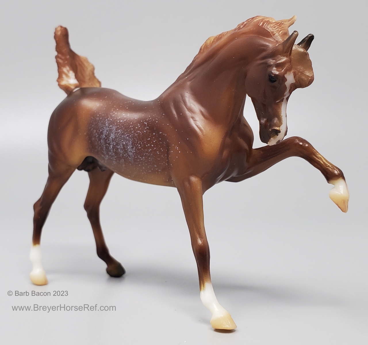 "The Sixth Release in the 2021 Stablemates Club. The newest addition to the lineup of Stablemates sculptures is an exquisite Arabian stallion sculpted by German artist Brigitte Eberl! Twist is painted as a Chestnut Rabicano. This unique pattern is especially prized in the Arabian world. Although similar to roan, rabicano produces flecks of white only on certain parts of the horse’s body, usually around the flank and tail. Twist also sports unique “ribbing” in his coat. Twist comes packaged in a mini hatbox." www.breyerhorses.com. These models were made from the heavier Cellulose Acetate plastic.