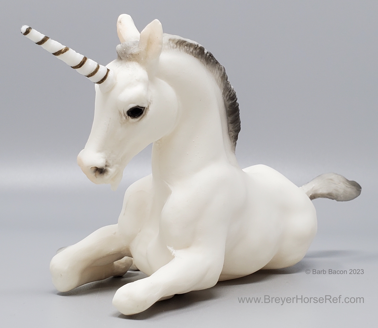 Alabaster with grey mane, tail and beard, with a gold and white striped horn. Models have either a white plastic look, or a chalky painted white look. The horn is a separate piece that is glued to the head, and the beard was added to the metal injection mold so that it could be altered for future runs of both regular horses or unicorns.