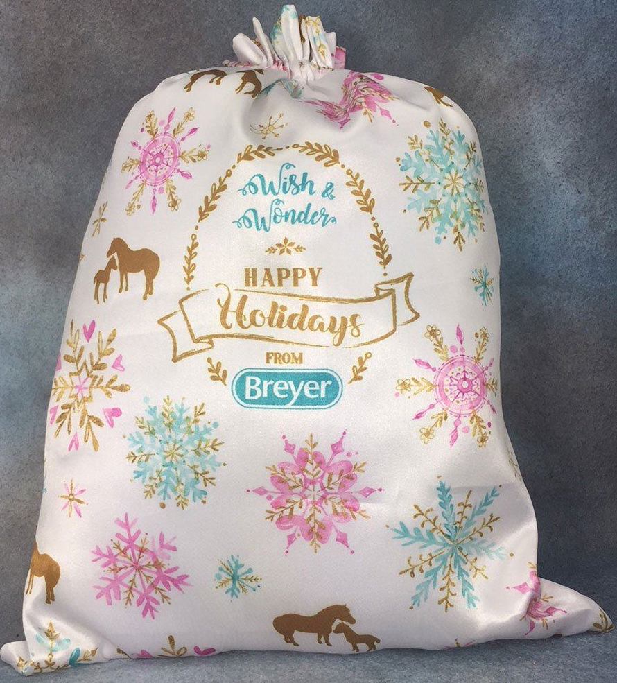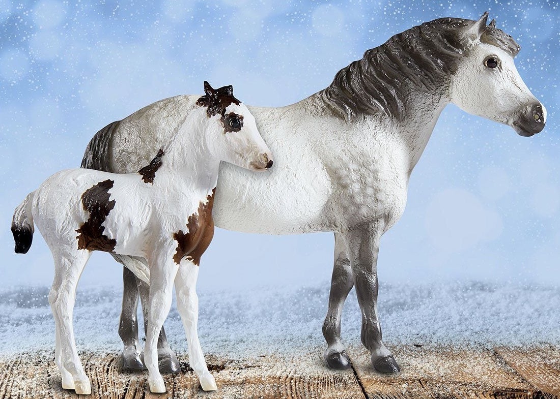 "With their chalky coats, this delightful mare and foal set will bring joy to collectors of all ages. Chincoteague Ponies can have many different coat colors and patterns, just like the ones seen on this island dwelling pair. The windswept mare Wish has a beautifully shaded dapple grey coat, and her sweet filly Wonder has a sooty buckskin pinto coat. This set comes in a festive satin gift bag.” www.breyerhorses.com. Included Misty and Stormy.