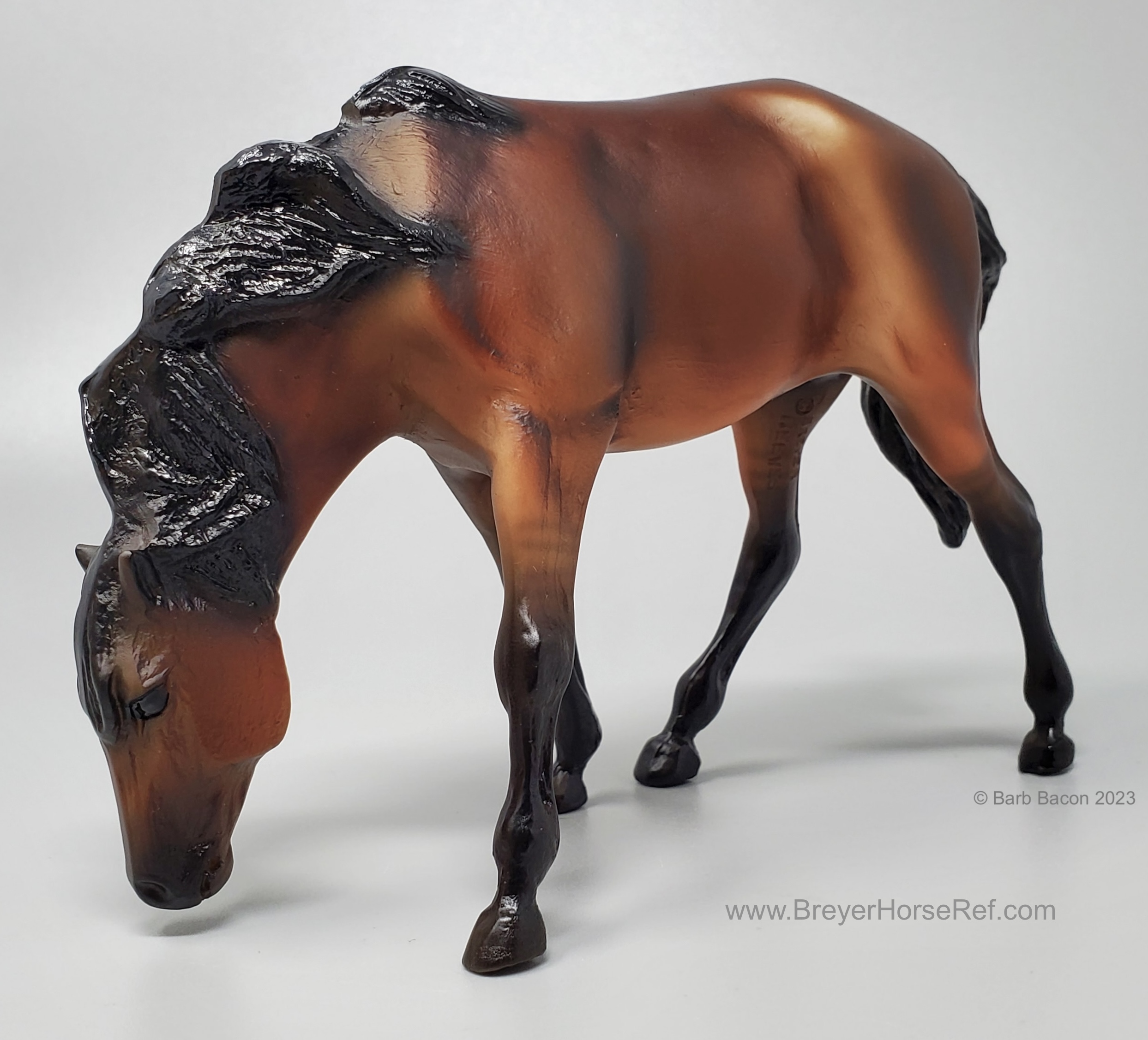 This original set Included a Bay Dun Classic Quarter Horse Foal and a Bay Appaloosa Classic Andalusian Foal. The Classic Morgan Foal replaced the Andalusian Foal sometime in 2008, and Rojo replaced the Classic Quarter Horse Foal in 2006. Dark dun with leg barring and faint dorsal stripe. On the 2008 Retired List.