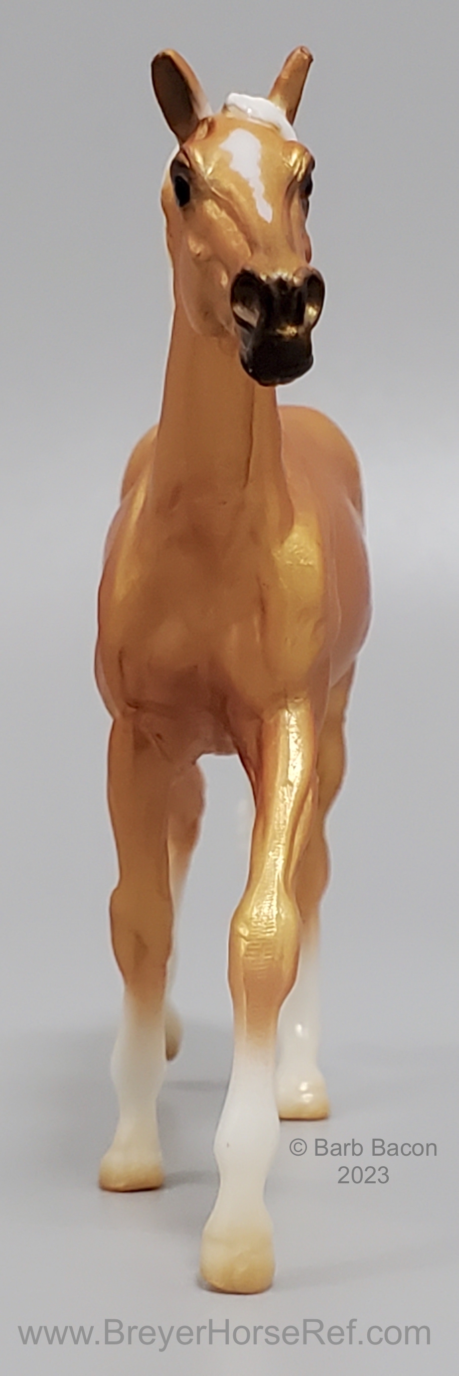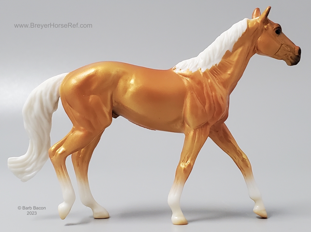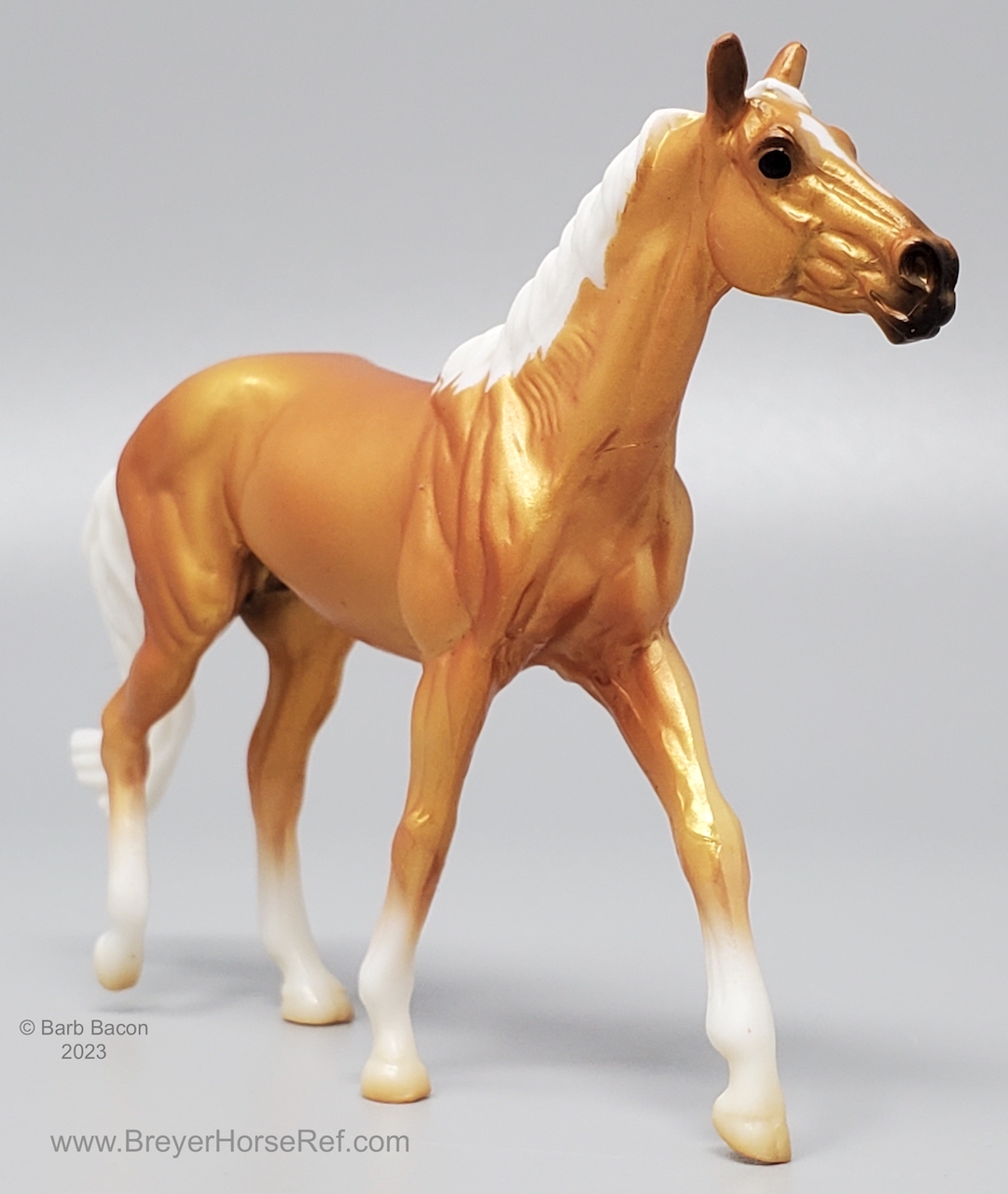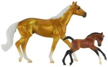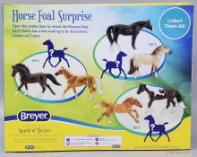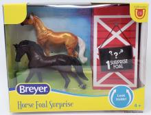 "What surprise will you find when you open up the stable door? Each barn-style package is hiding a Stablemates horse and foal. This will be a random ship of one of four sets." www.breyerhorses.com. In a set with a golden palomino Walking TB and a bay Scrambling Foal. Stable Surprise Set #6049 was only available in 2020 and on the 2020 Retired List.