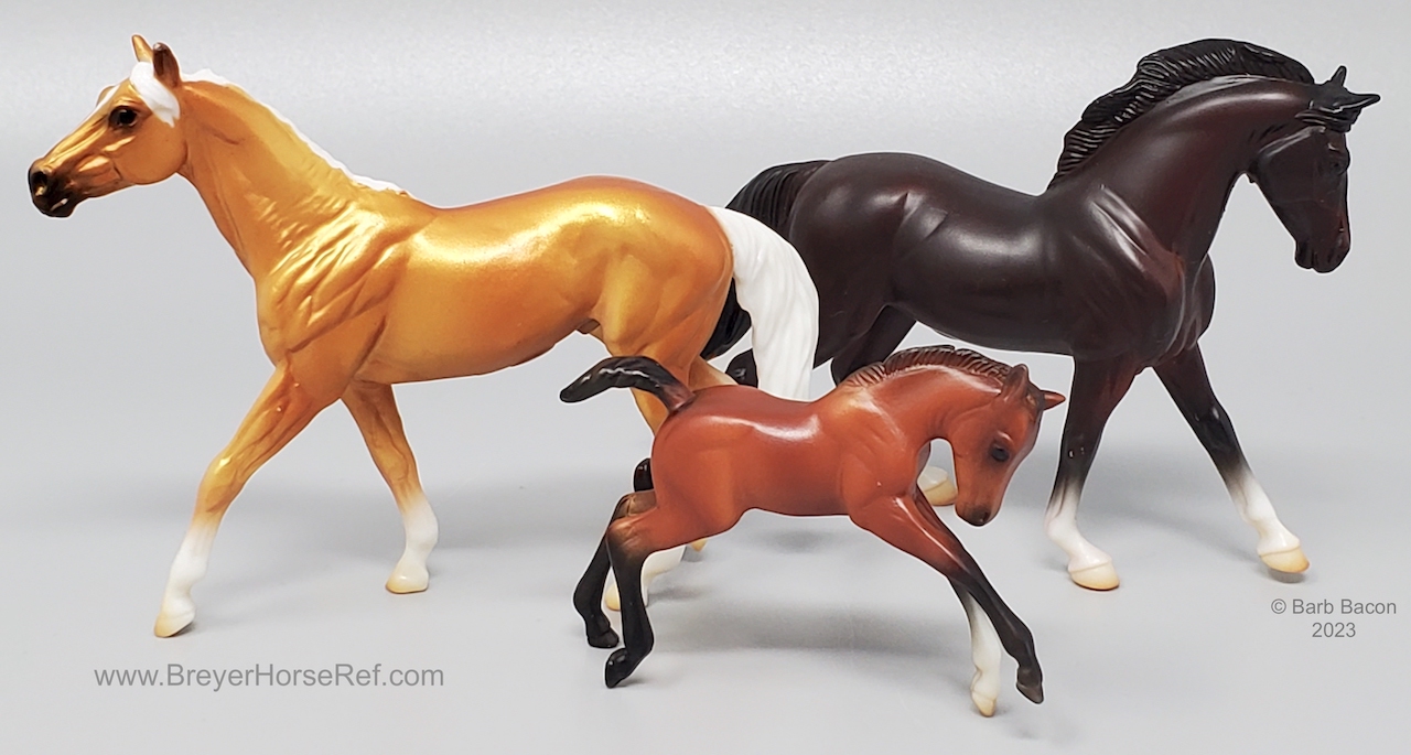 Set #6227 included a bay Cantering Warmblood, a golden palomino Walking TB and a bay Scrambling Foal. #6222 is the assortment number for three different family sets. Packaging refers to this set as 'Horse Foal Surprise Set #1', the Breyer website refers to this set as 'Horse Foal Surprise Family 13', and the 2023 Dealer Catalog refers to this set as the 'Sunshine Meadow Family'. "Open the door to reveal the mystery foal surprise! This three piece Stablemates set comes with a stallion, mare, and a mystery foal, whose color is a surprise! This set features a Palomino Thoroughbred and a Bay Warmblood, and their foal remains hidden in its stall until you open the package! A fun visual lesson in horse genetics; the foal's coat color and pattern will be based upon the coat color and patterns of its parents." www.breyerhorses.com. On the 2023 Retired List.